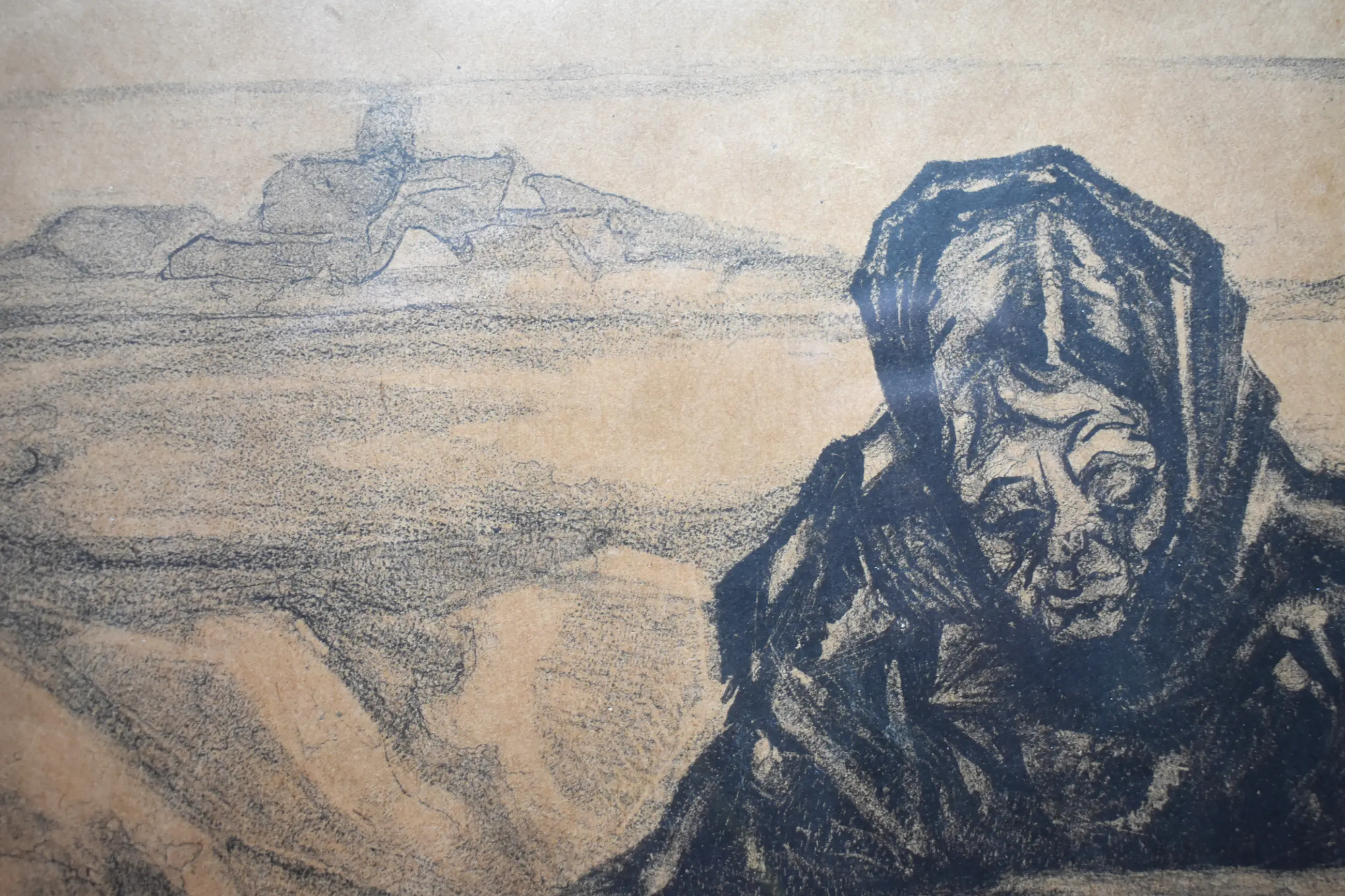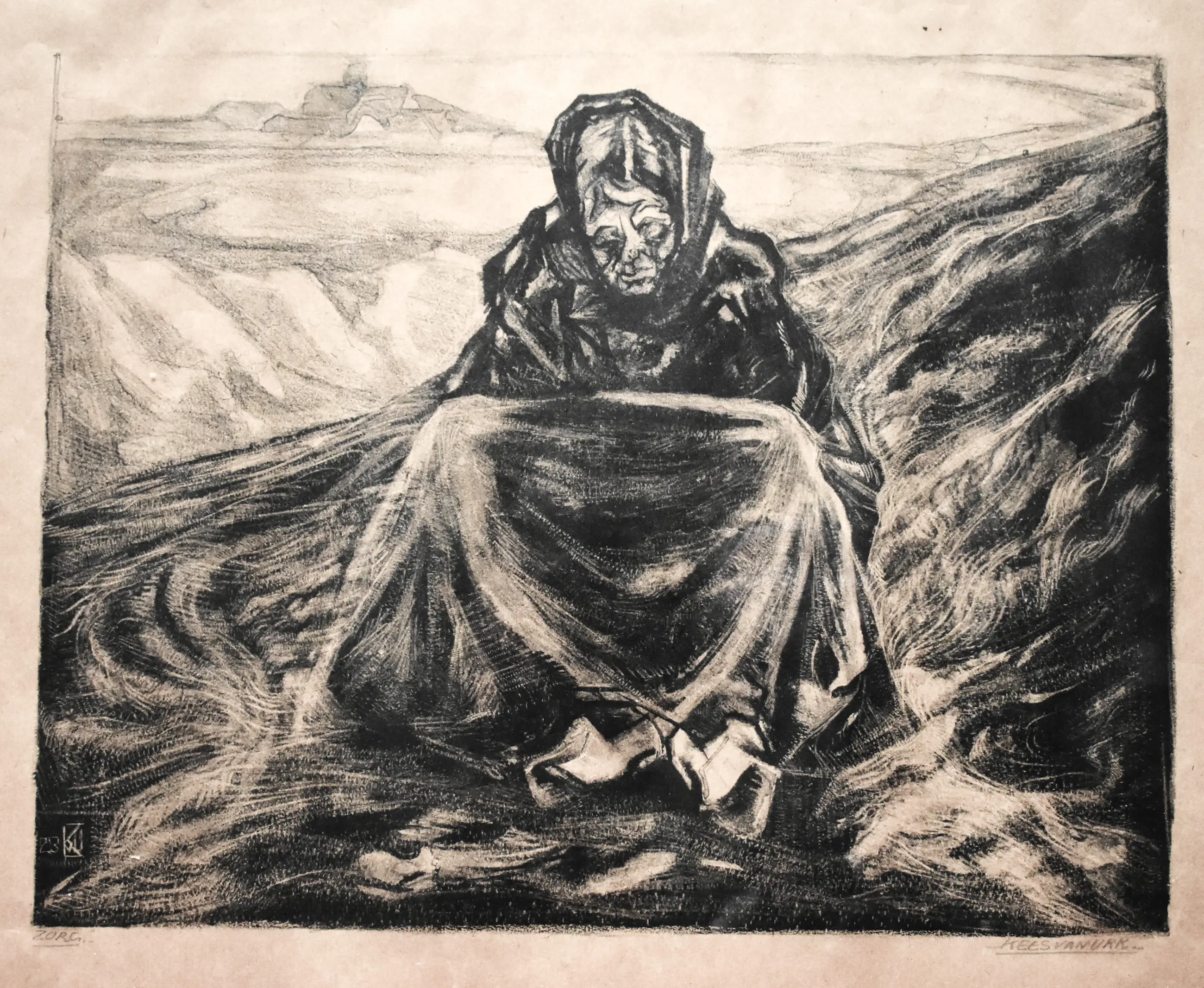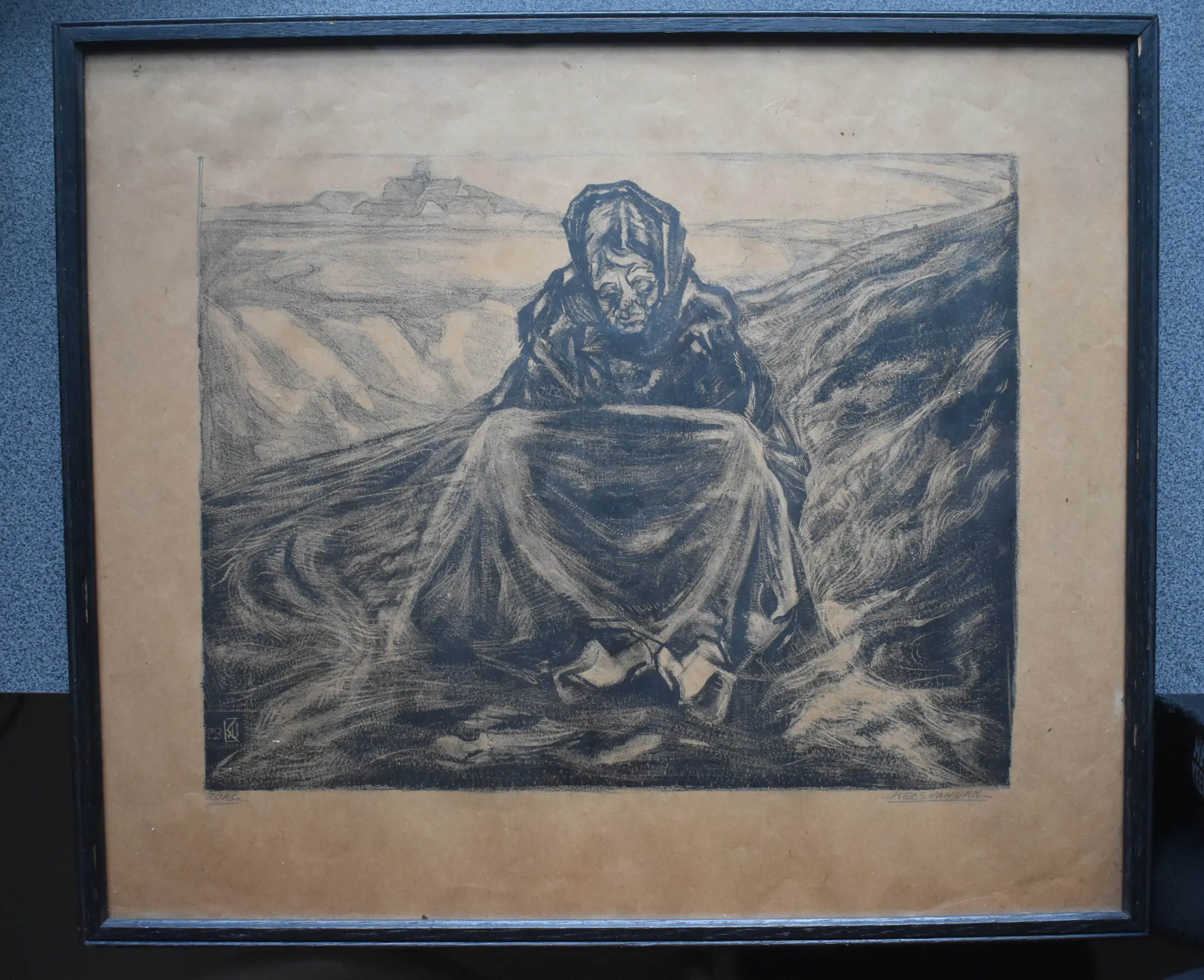 C.J. van Urk, ( Kees ) geboren 1895 te Leiden, vervaardigde deze litho in 1923, om de bittere armoede die op vele plekken in Nederland aanwezig was onder de aandacht te brengen. In dit geval in Katwijk ( aan de horizon ) waar hij deze nettenboetser afbeeldde, maar later ook in Blaricum. Hij ontwikkelde zich via de academie tot een opvallende kunstenaar die met zijn tijd mee ging. ( kubisme ) . Werk van hem bevindt zich in vrijwel alle moderne musea van Nederland.