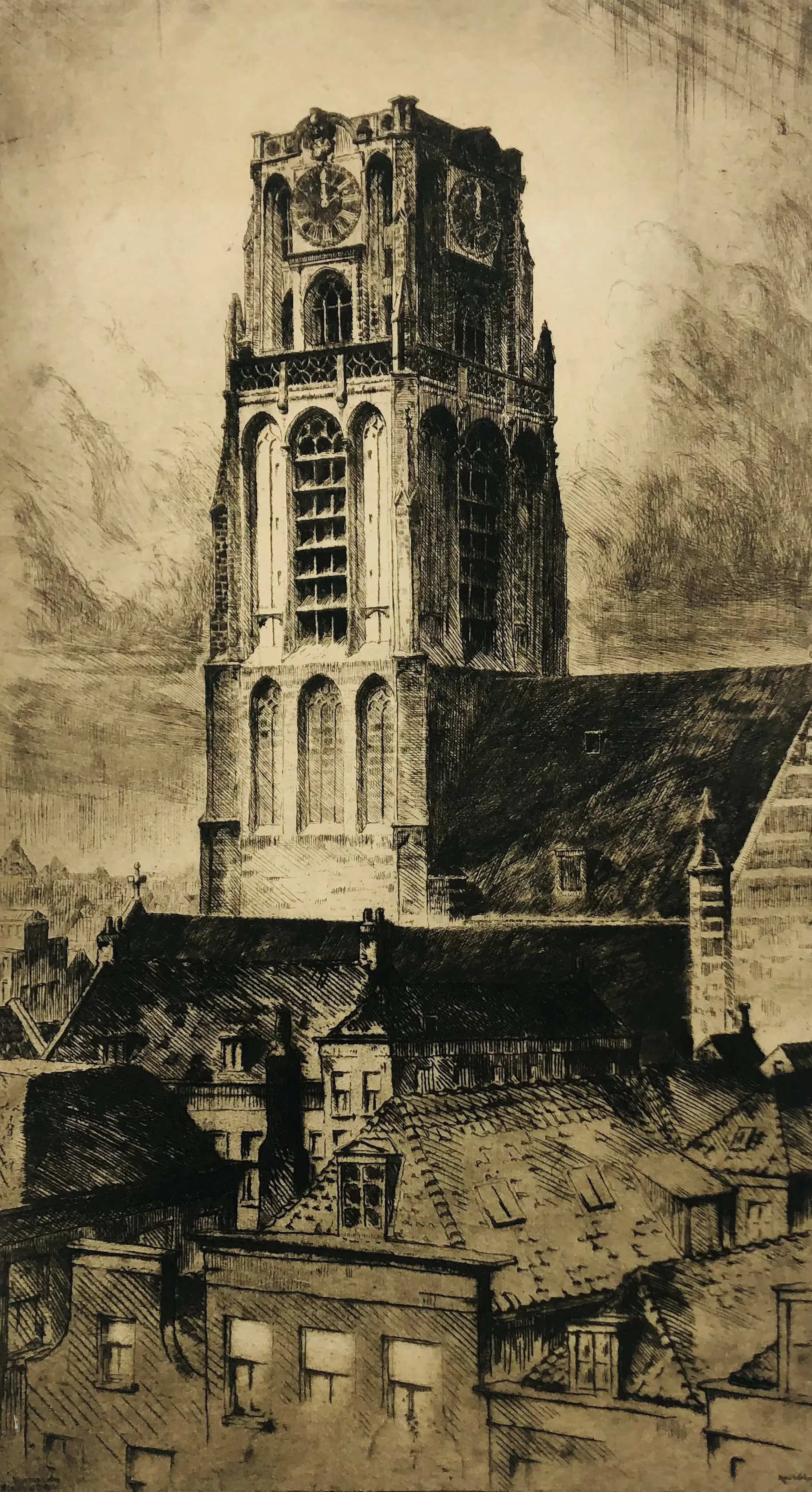 Mooie vooroorlogse ets van de Laurenskerk in Rotterdam van Kees Verhoeven. De ets zelf is in goede staat maar vooral in de witranden om de indruk heen zichtbare verkleuring en foxing. Deze kan goed gerestaureerd worden. Gesigneerd in potlood. U kunt het werk vooraf komen bekijken in de schatkamer van galerie Rotor in Gorinchem of na aankoop ophalen. Het werk kan ook verzonden worden via aangetekende post. Of tijdelijk gratis worden opgeslagen tot nadere orde. Ook kunnen ondertussen uw inlijsting verzorgen.
