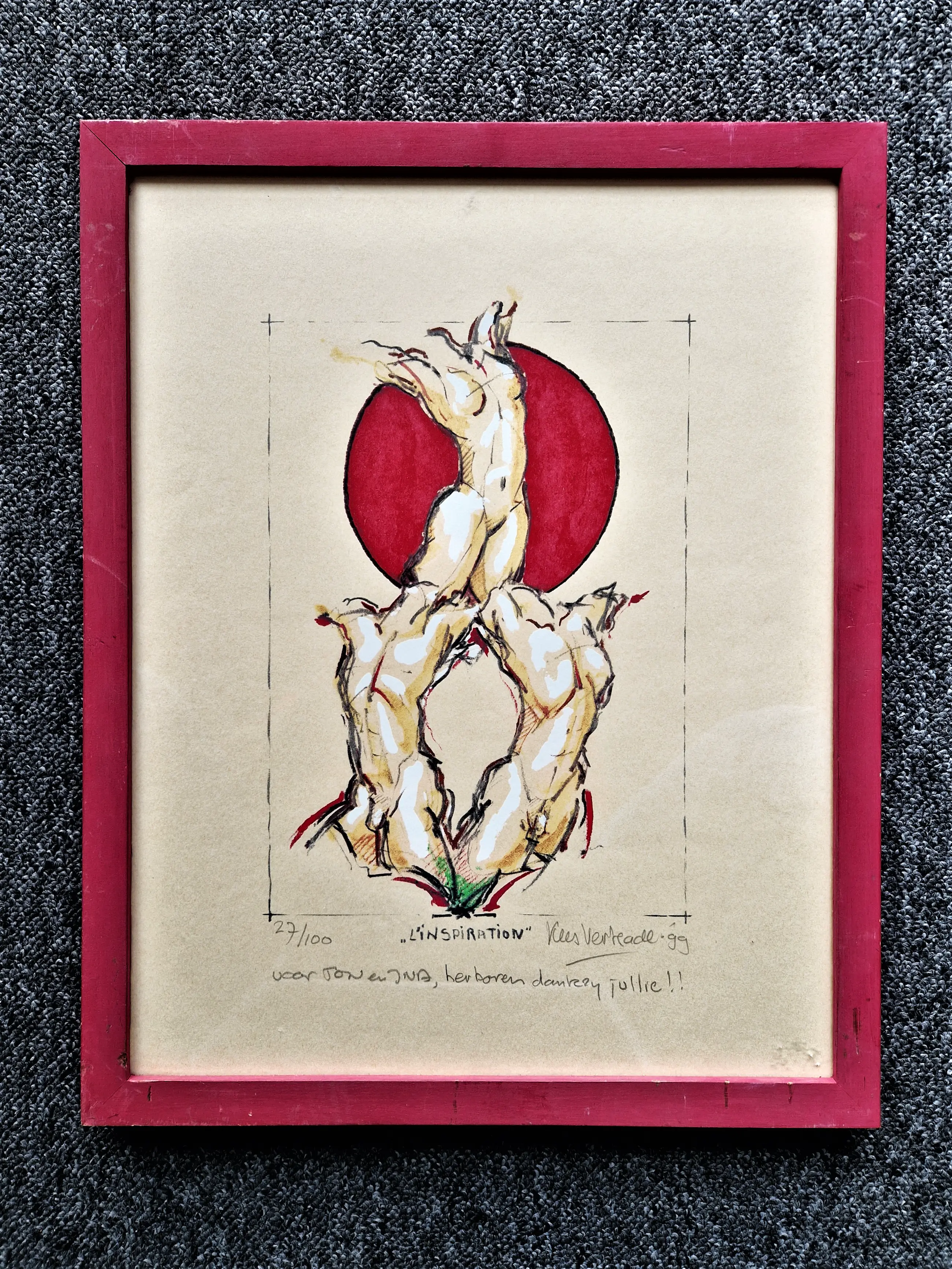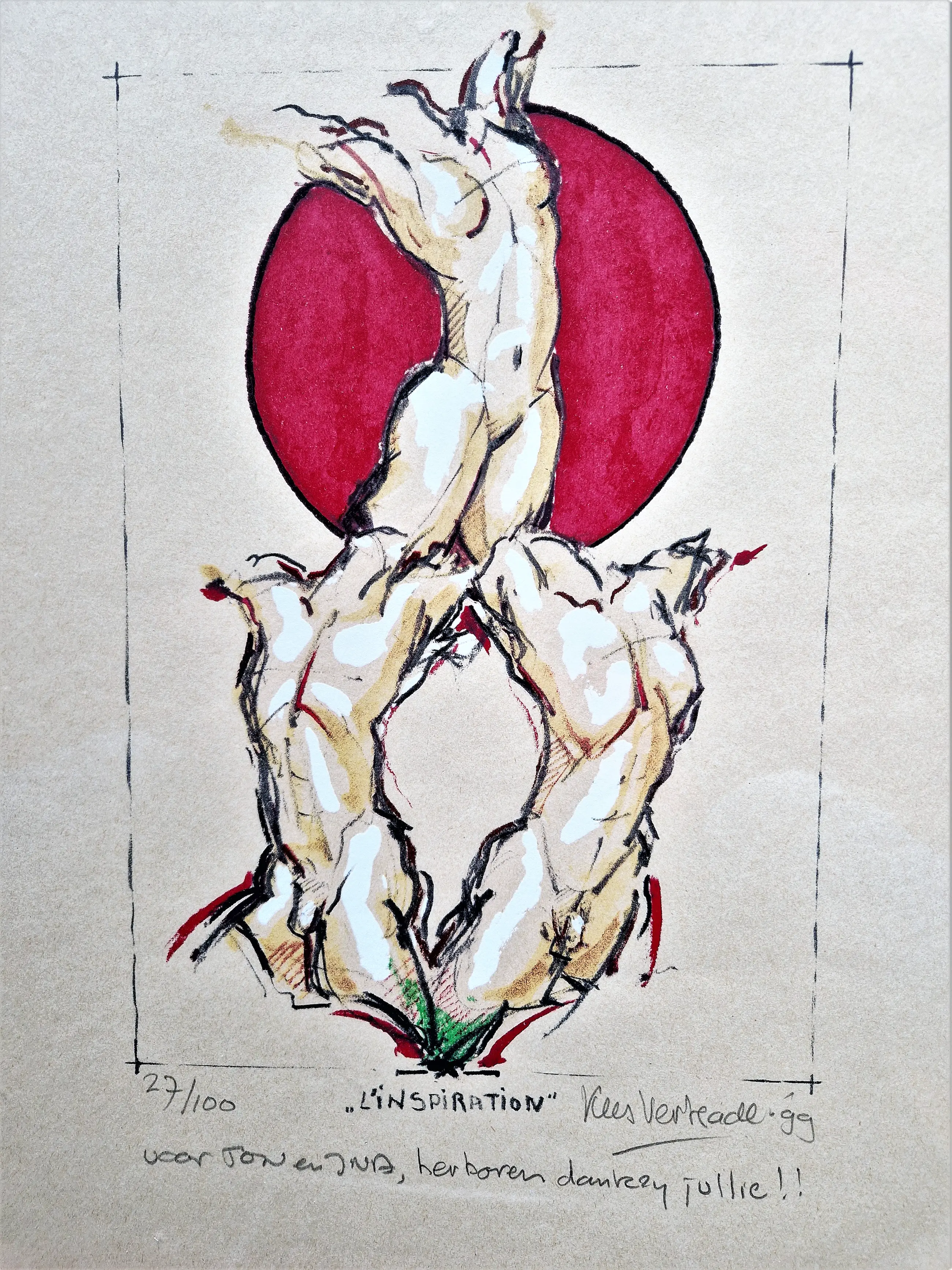 - een bijzondere, handgekleurde Lithografie op papier! In 1999 door de bekende kunstenaar kees Verkade (1941-2020) in een oplage van 100 exemplaren gemaakt en opgedragen ("herboren dankzij jullie!!") aan zijn vrienden ton (van Duinhoven) en ina (van Faassen).