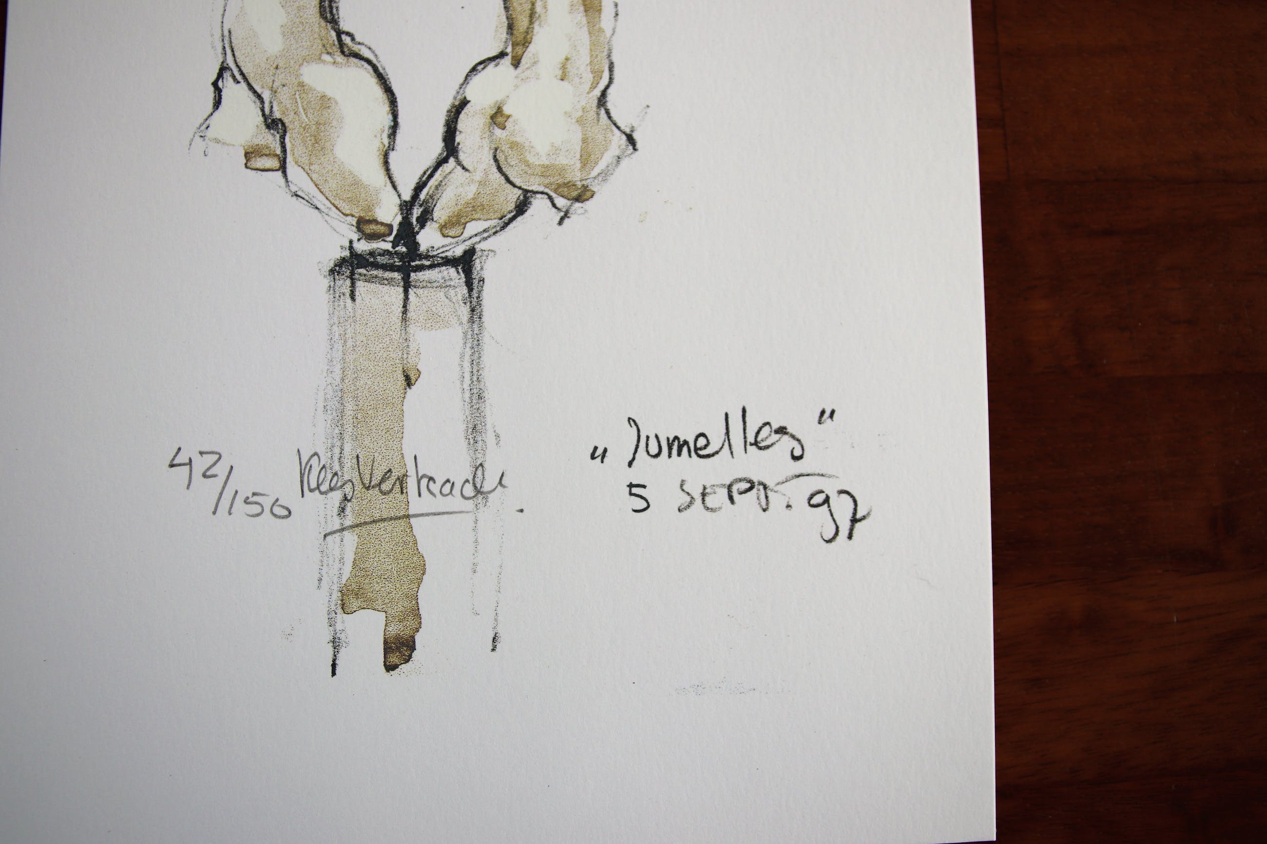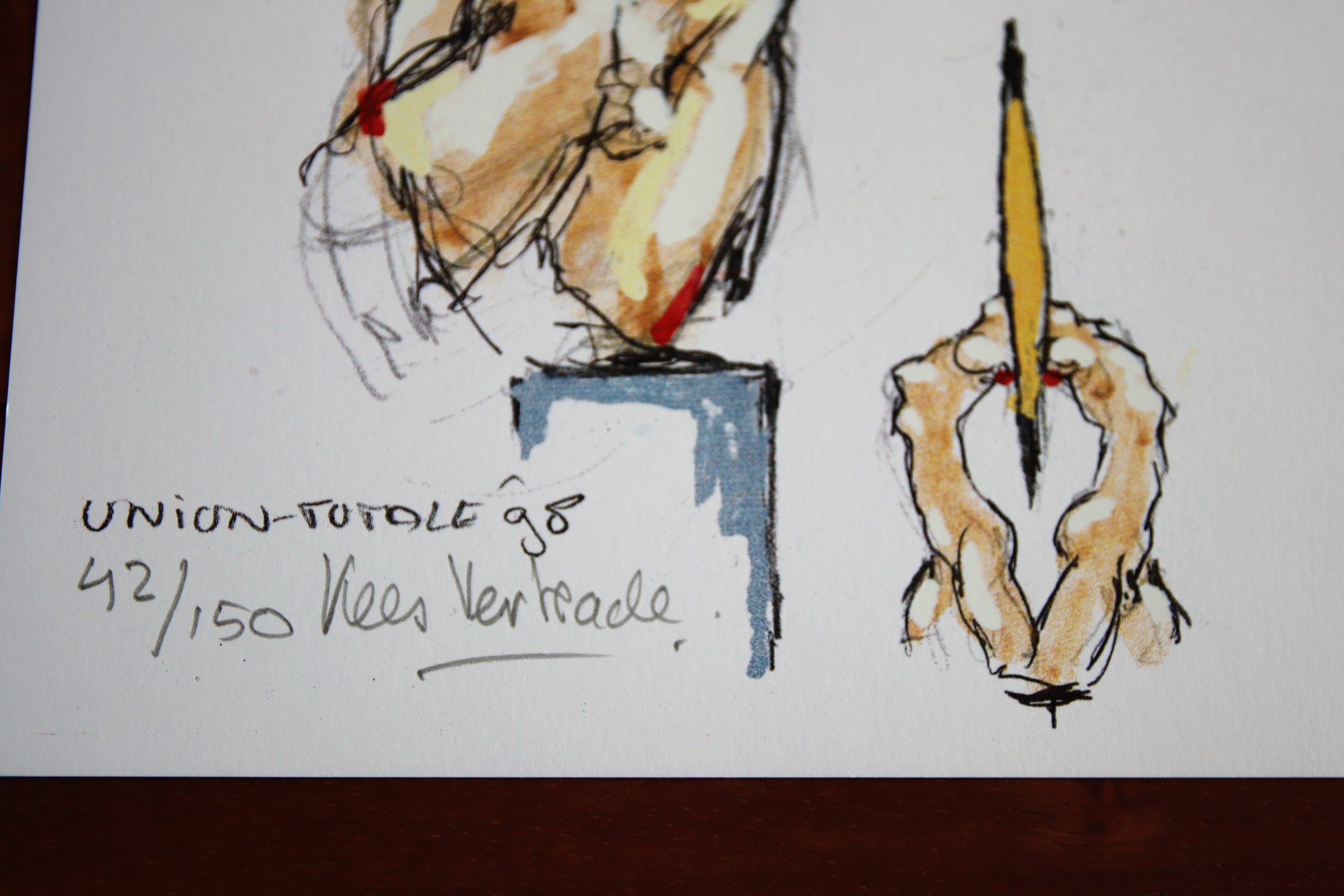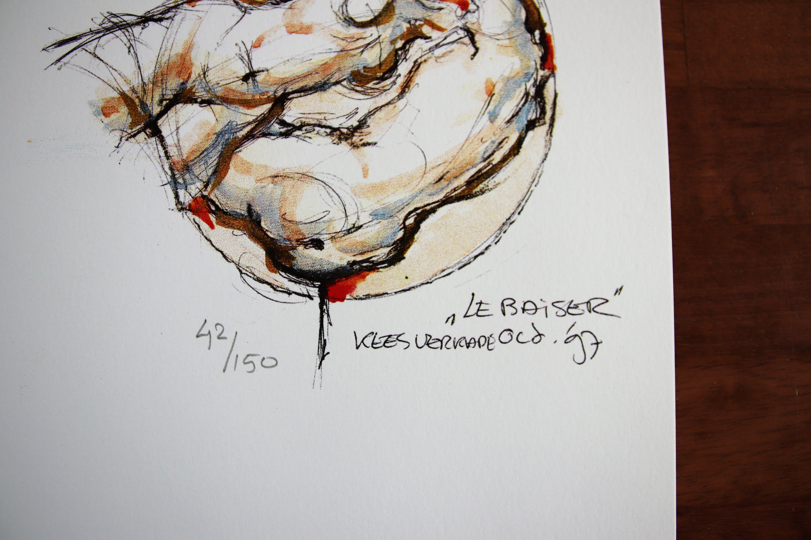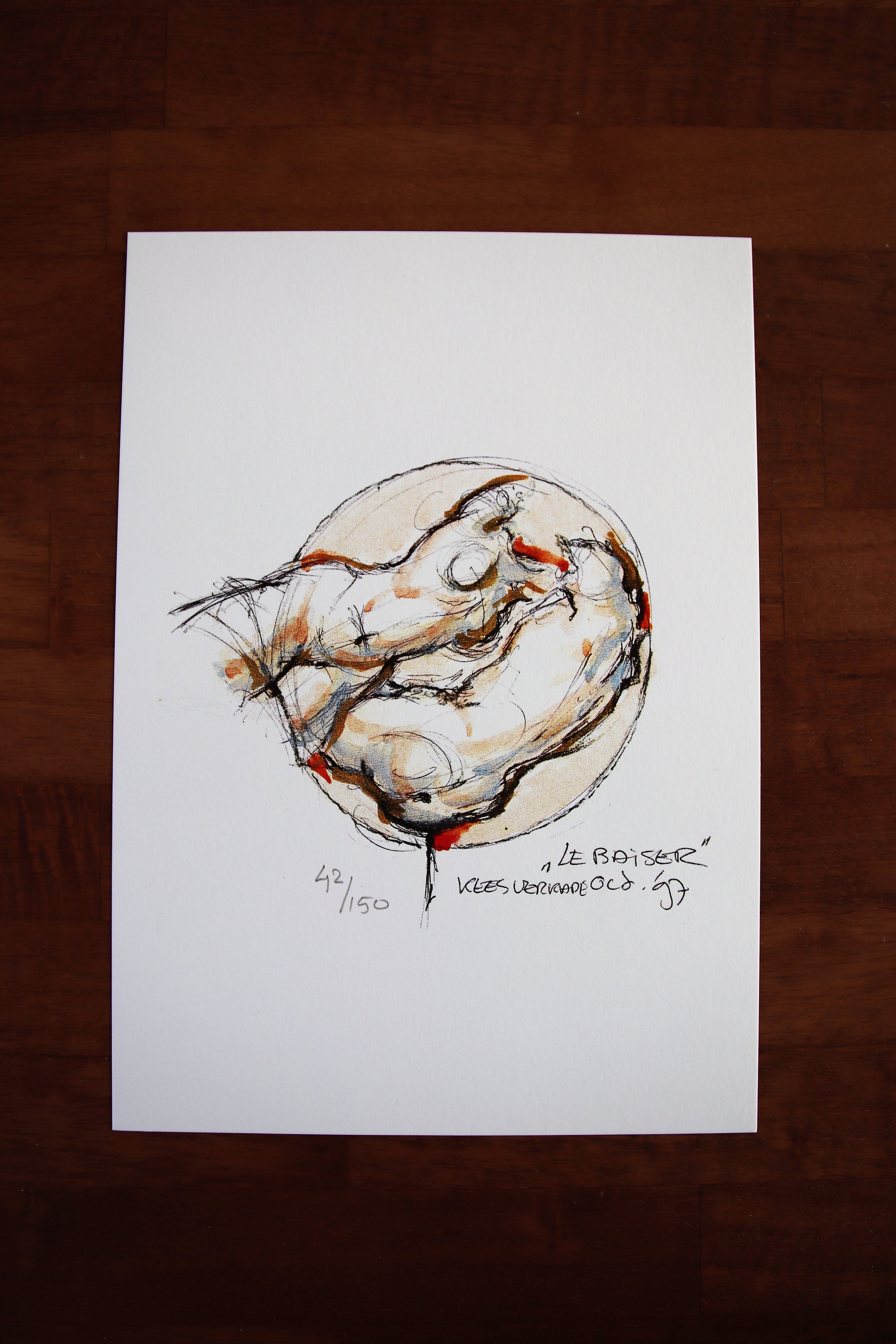 Kees Verkade was niet alleen een begenadigd beeldhouwer maar ook een getalenteerd schilder en graficus. Dit mapje bevat vijf sensuele afbeeldingen uit 1997 en 1998 van figuren in liefdevolle houdingen in een losse, maar trefzekere toets opgezet. De kleuren zijn overwegend beige en geel/oker. De zeefdrukken komen zowel in een klassiek als een modern interieur tot hun recht. Titels: Union-totale (1998), Wederopstanding (1997), Breaking-through (1998), Jumelles (1997), Le baiser (1997). De zeefdrukken zijn nooit ingelijst geweest en verkeren in een uitstekende staat.