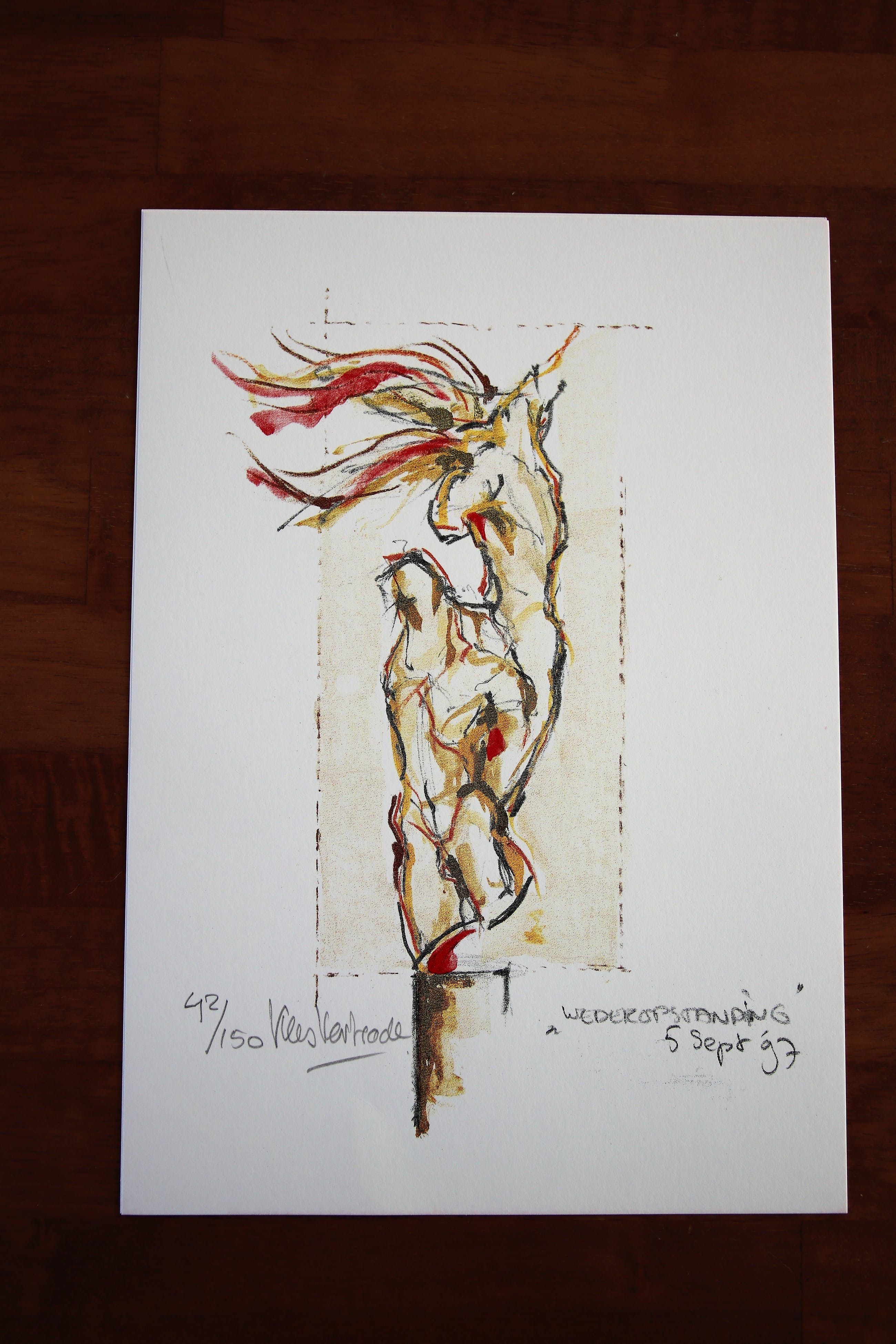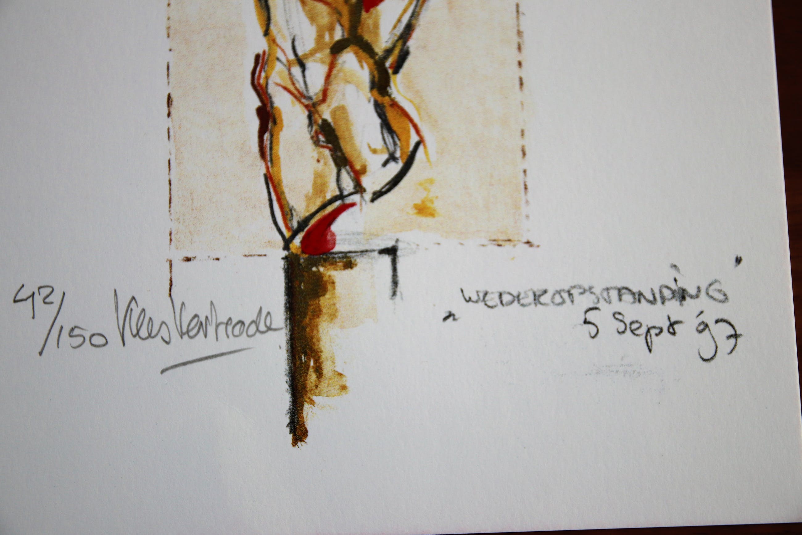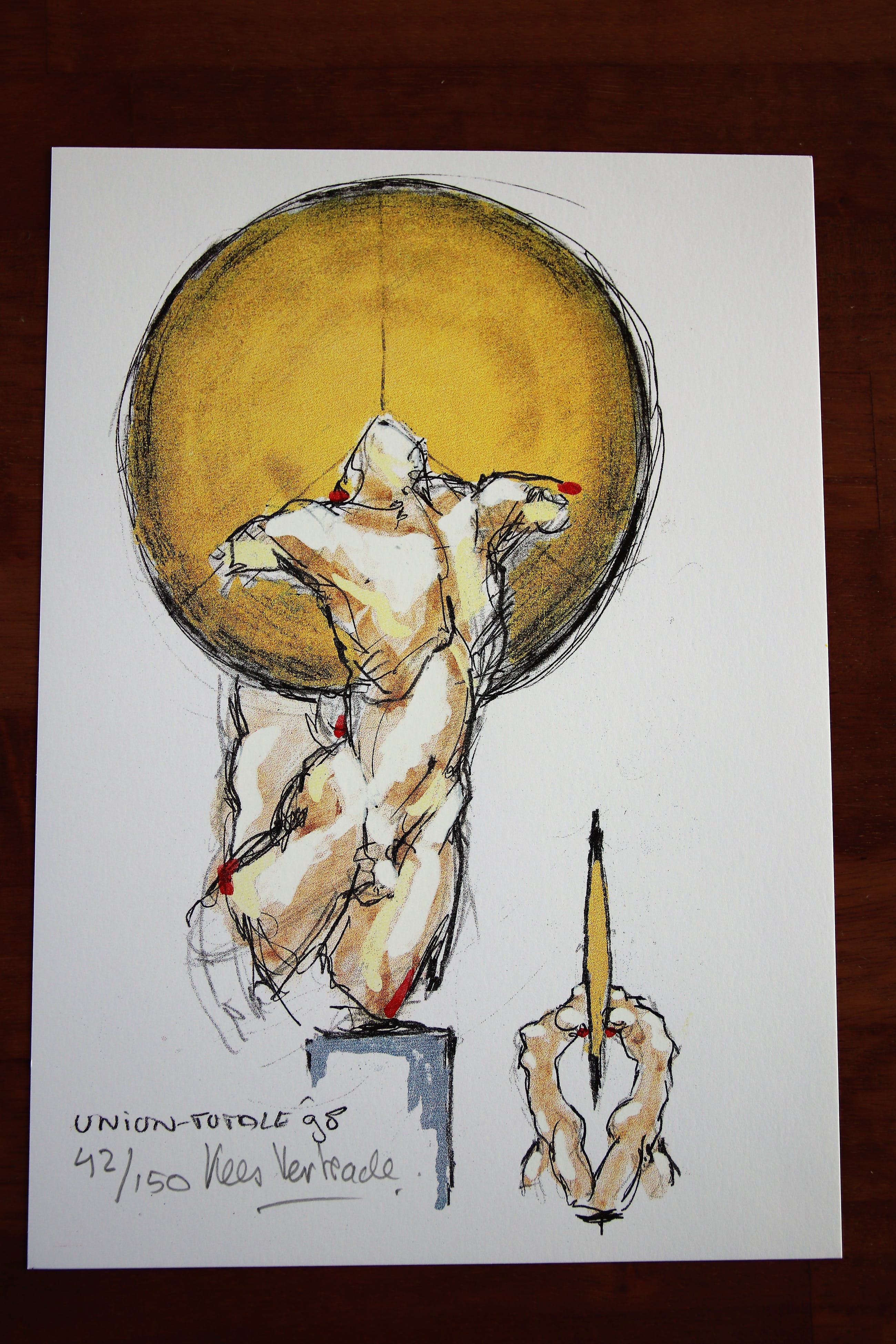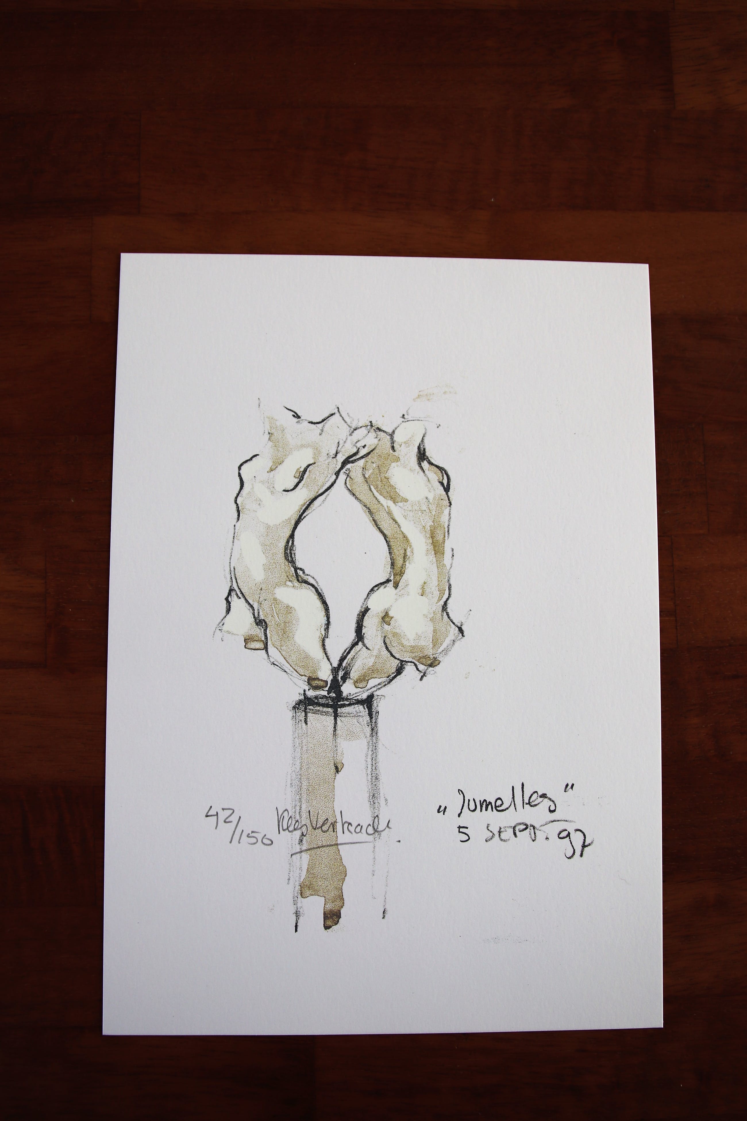 Kees Verkade was niet alleen een begenadigd beeldhouwer maar ook een getalenteerd schilder en graficus. Dit mapje bevat vijf sensuele afbeeldingen uit 1997 en 1998 van figuren in liefdevolle houdingen in een losse, maar trefzekere toets opgezet. De kleuren zijn overwegend beige en geel/oker. De zeefdrukken komen zowel in een klassiek als een modern interieur tot hun recht. Titels: Union-totale (1998), Wederopstanding (1997), Breaking-through (1998), Jumelles (1997), Le baiser (1997). De zeefdrukken zijn nooit ingelijst geweest en verkeren in een uitstekende staat.