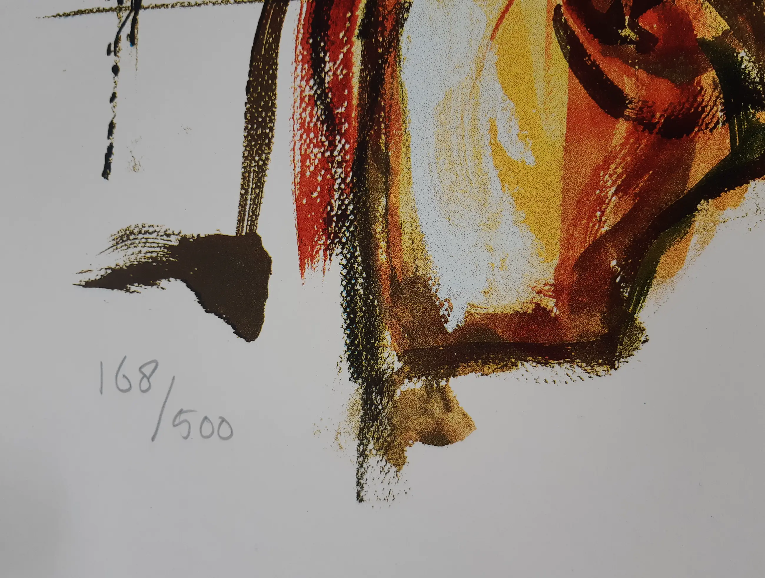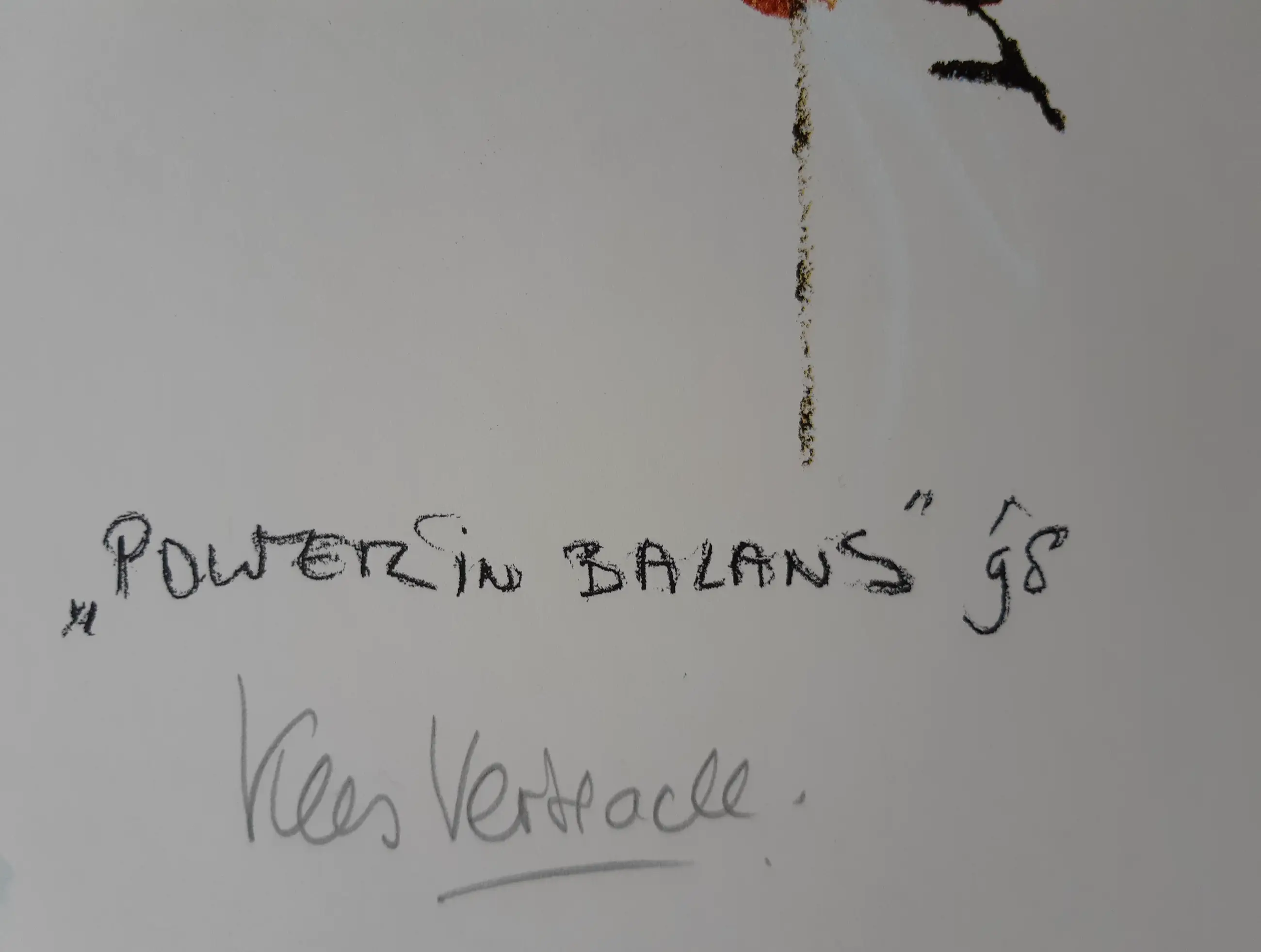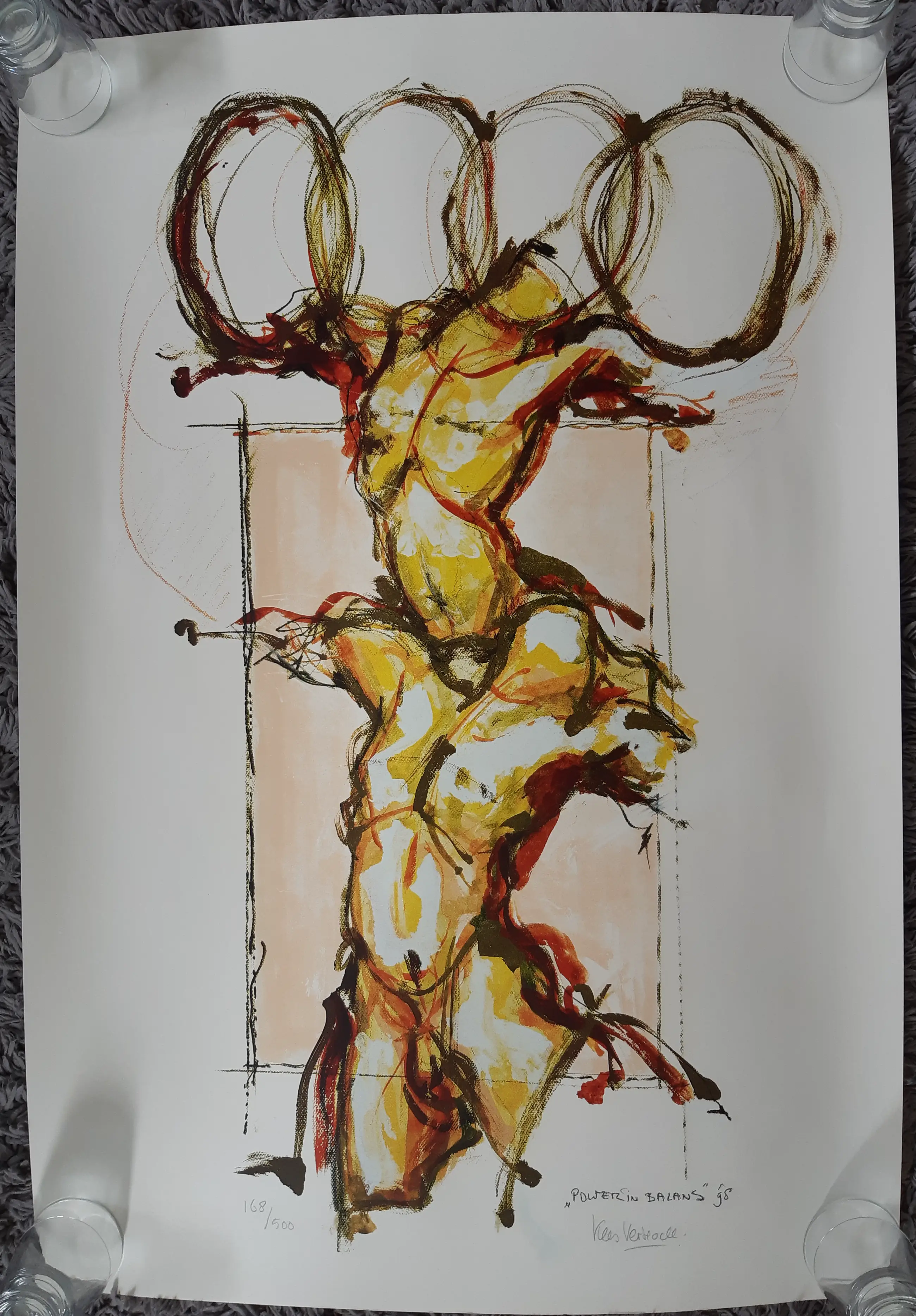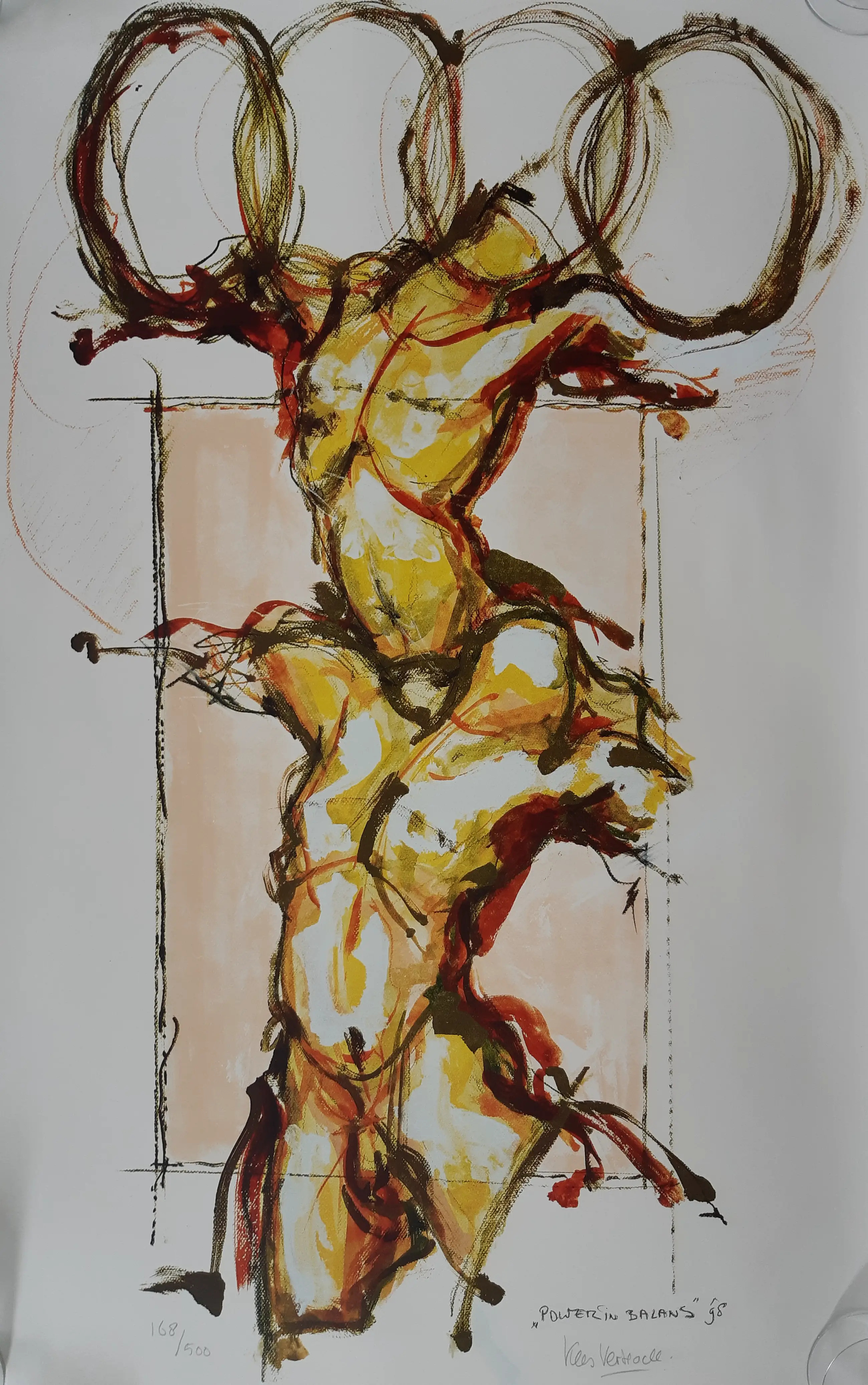 Zeer grote, krachtige zeefdruk van Kees Verkade, die zelden wordt aangeboden. De zeefdruk is een studie voor een later in brons vervaardigd beeld. Met potlood door de kunstenaar gesigneerd en genummerd. Titel en datering in druk. Afgedrukt op zeer dik papier. De afbeelding is ongeveer 100 x 65 cm. De conditie is uitstekend, de zeefdruk is altijd in een koker bewaard.