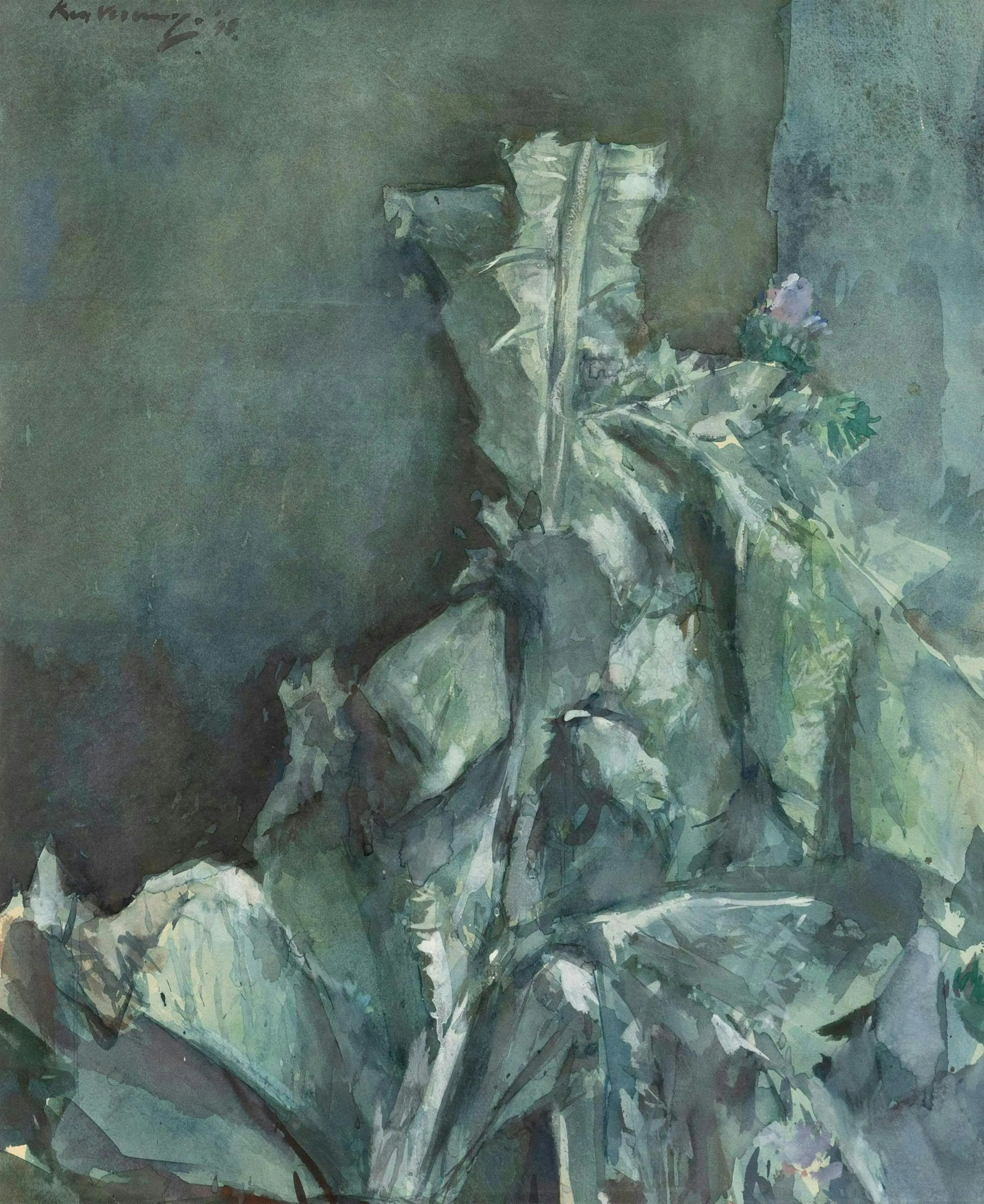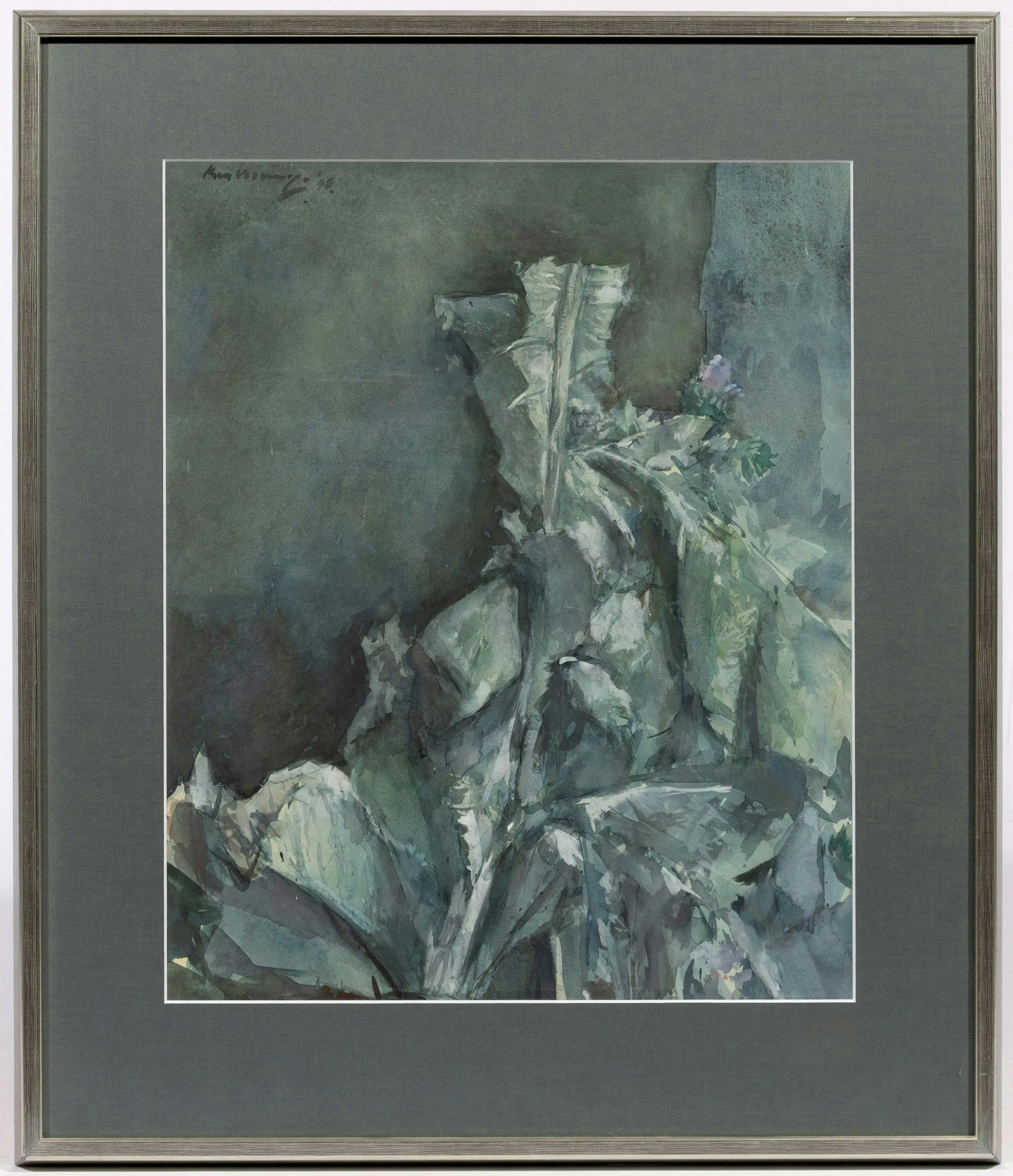 Prachtig stilleven van Kees Verwey, uitgevoerd in verschillende groentinten en donkerblauwe accenten. Stijlvol ingelijst in een stevige houten lijst met zilver-wash.