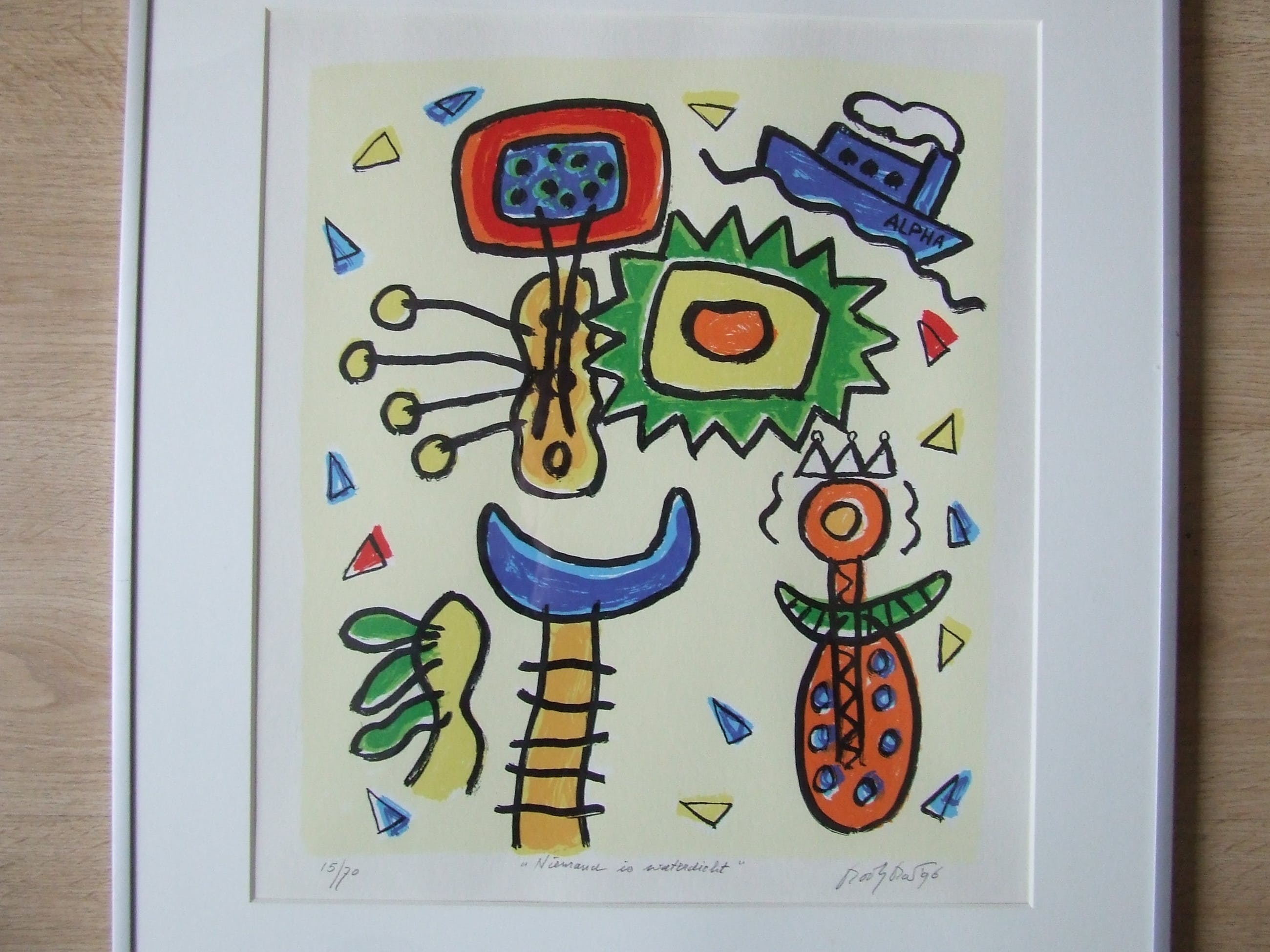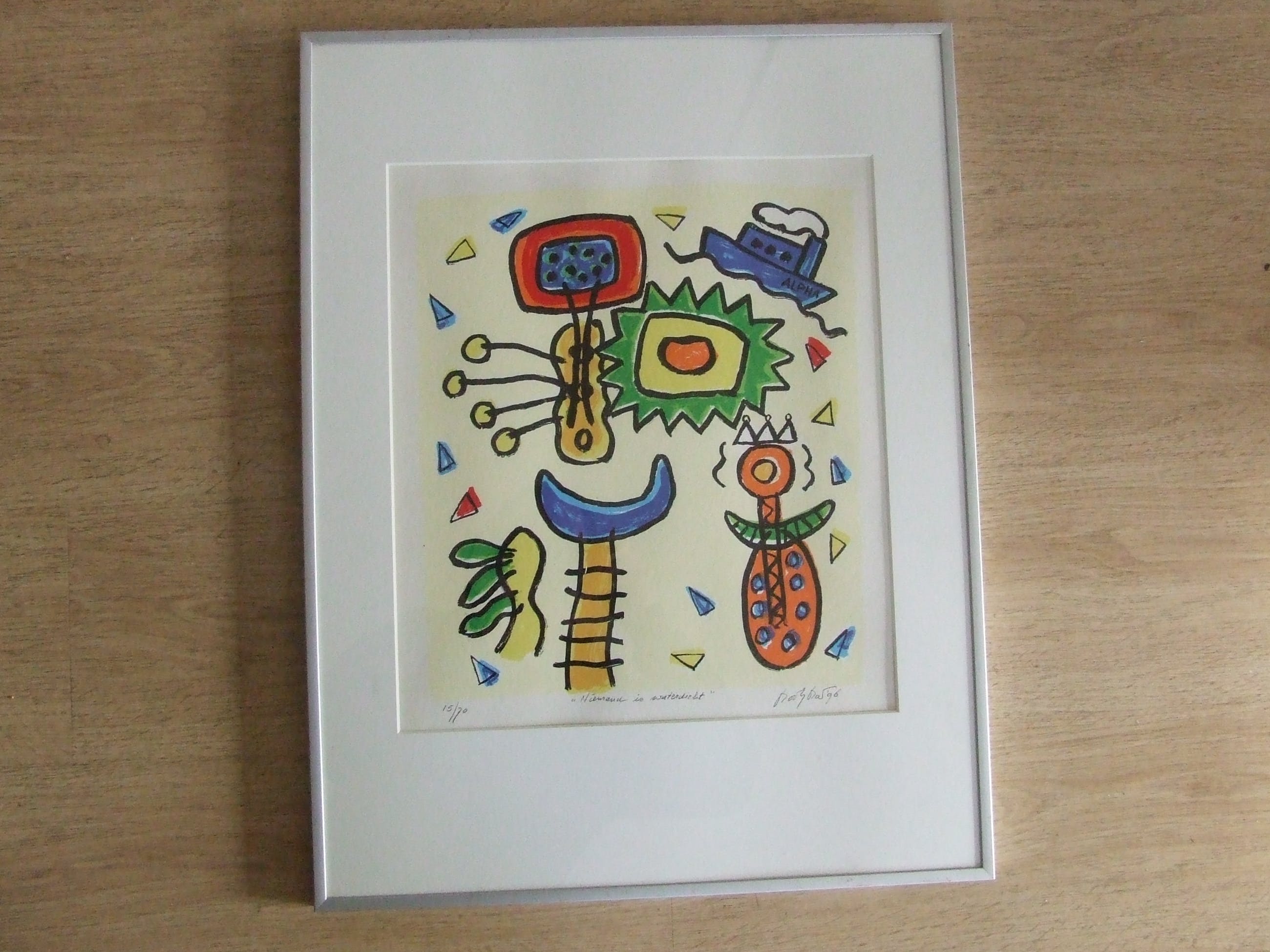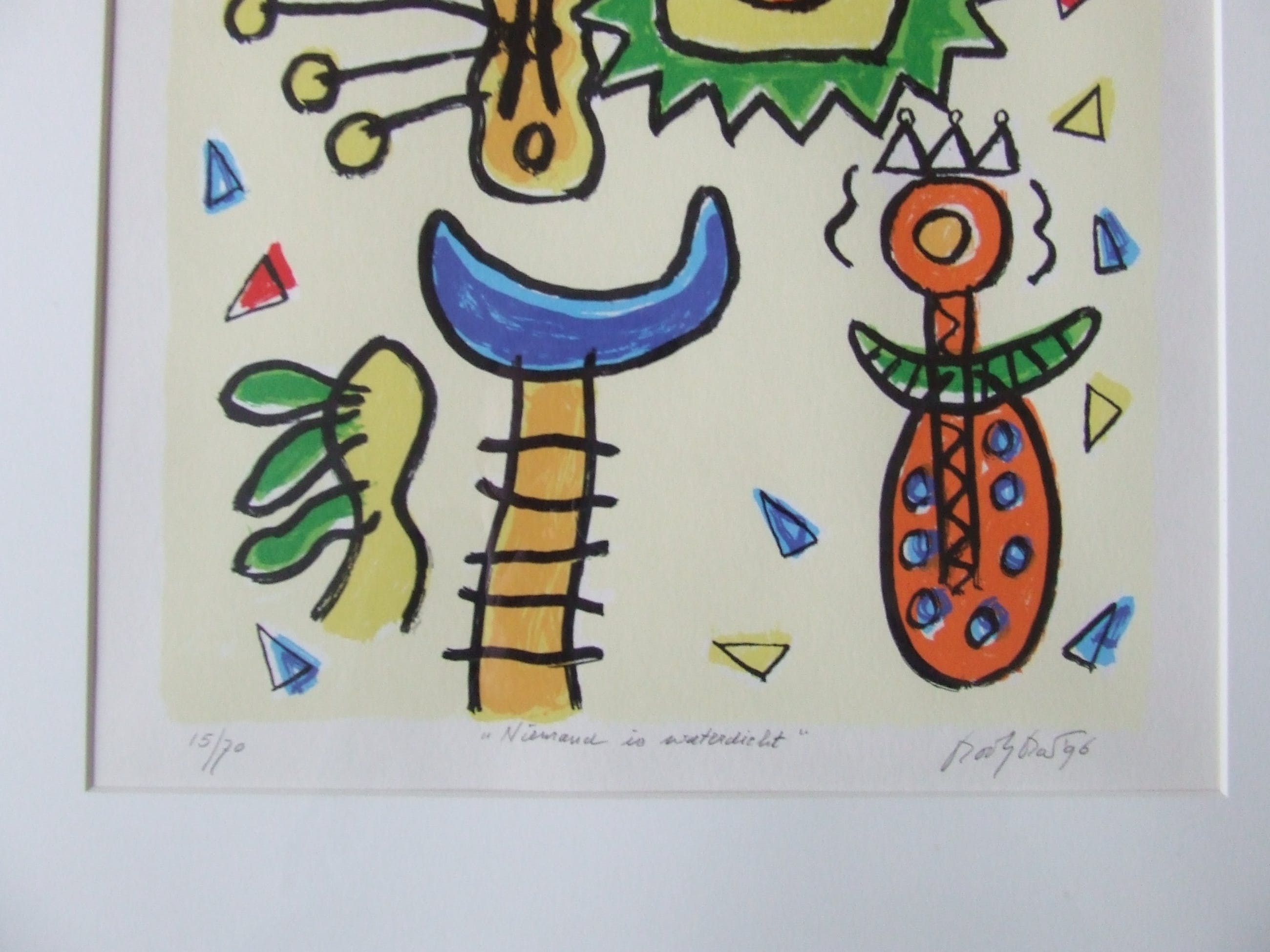 Leuke litho in lijst met passepartout van Keimke Kootstra. Getiteld: 'Niemand is waterdicht' In mooie aluminium lijst. Rechtsonder gesigneerd 'Kootstra '96' Linksonder voorzien van de oplage nummer. 15/70 In het midden staat de titel.