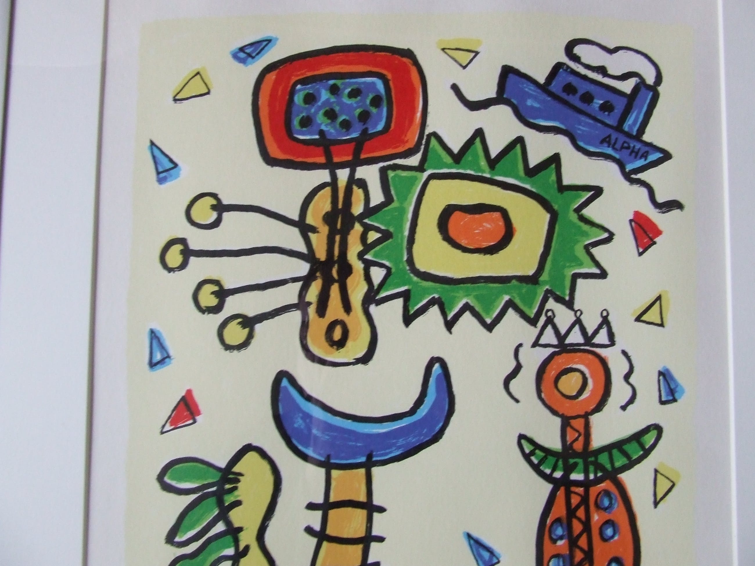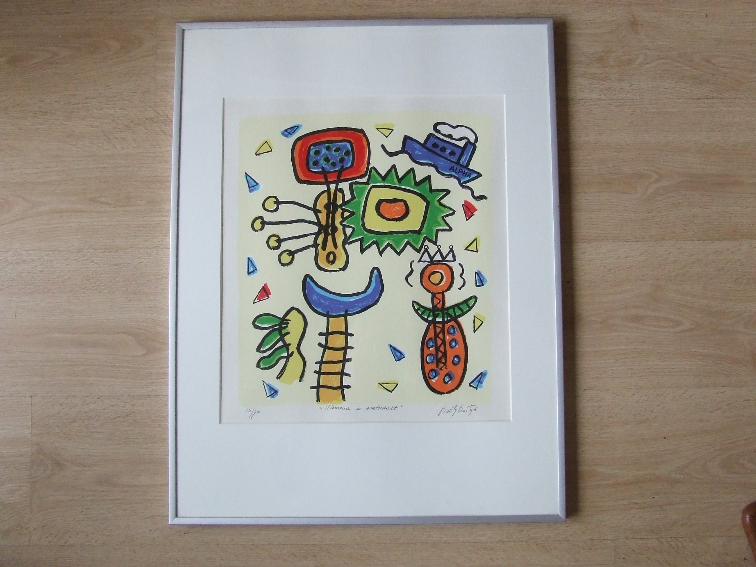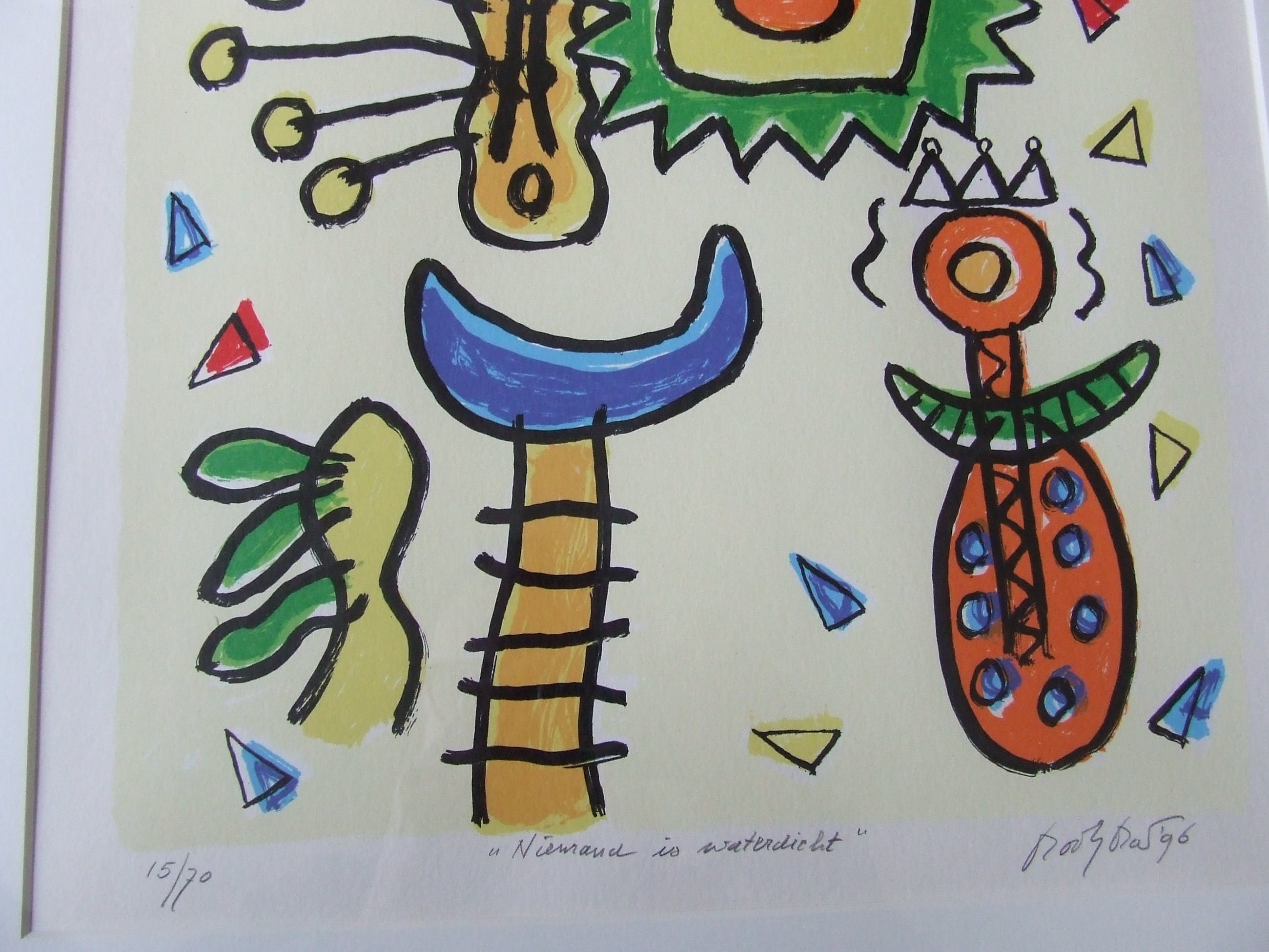 Leuke litho in lijst met passepartout van Keimke Kootstra. Getiteld: 'Niemand is waterdicht' In mooie aluminium lijst. Rechtsonder gesigneerd 'Kootstra '96' Linksonder voorzien van de oplage nummer. 15/70 In het midden staat de titel.