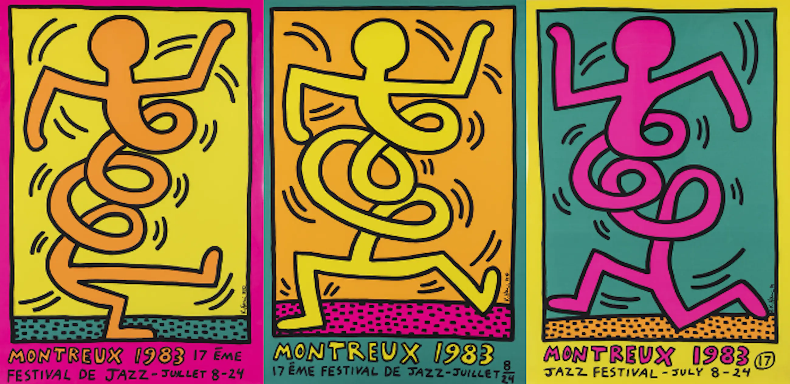 Quittenbaum Auction House: https://www.quittenbaum.de/en/auktionen/modern-art/160C/keith-haringmontreux-jazz-festival-foundation-albin-uldry-bern-3-posters-montreux-jazz-de-festival-green-pink-yellow-1983-116278/