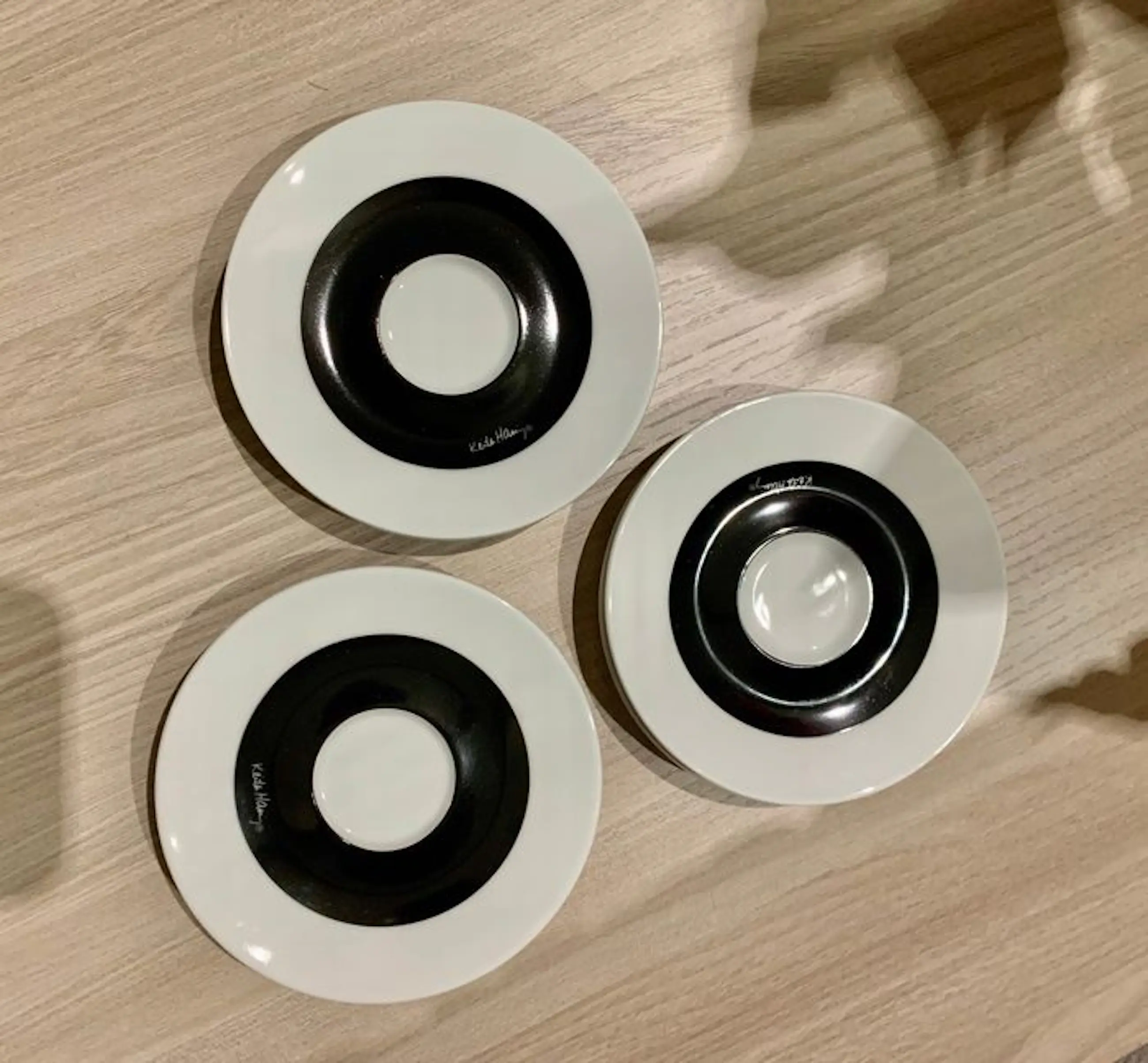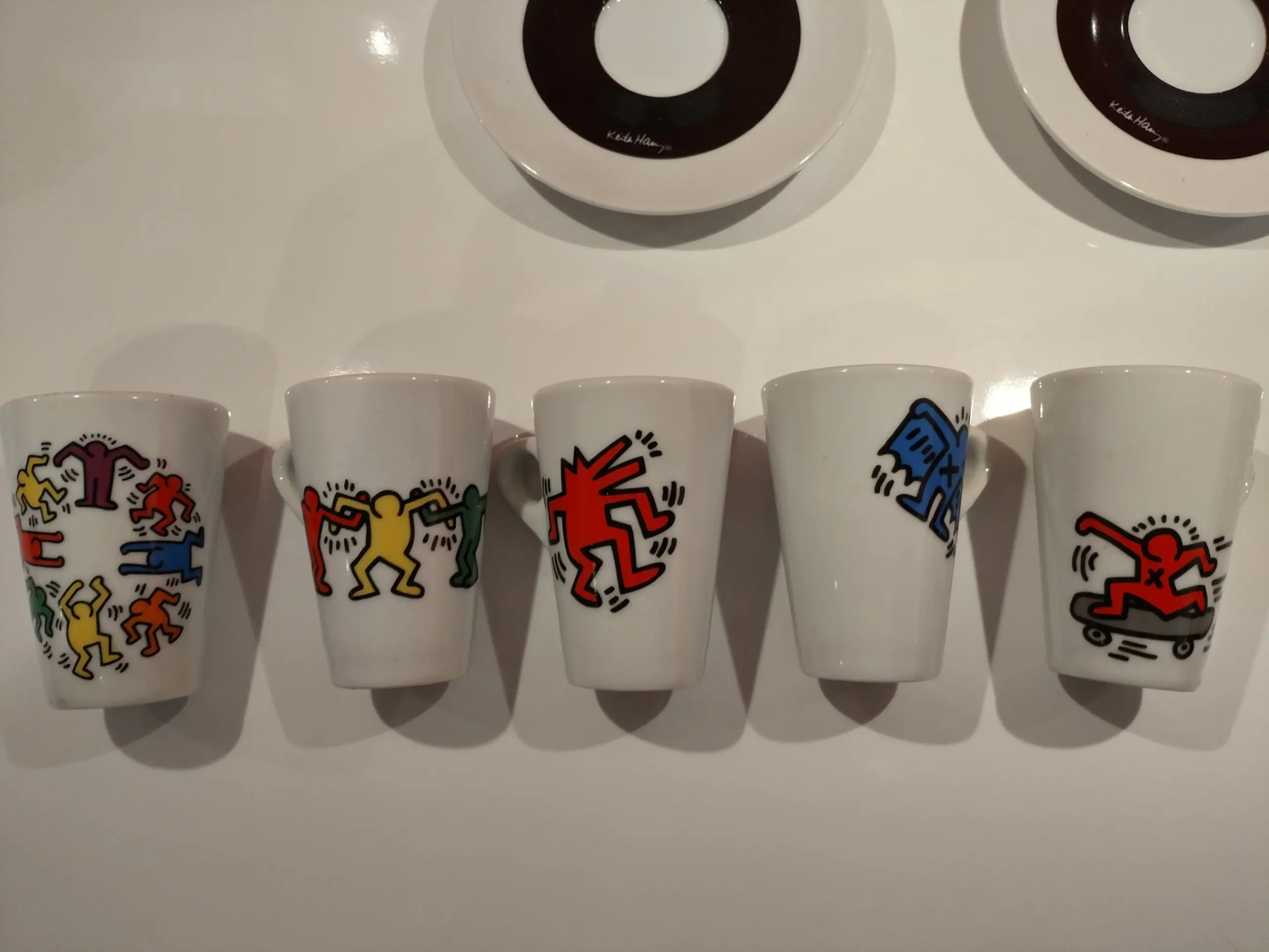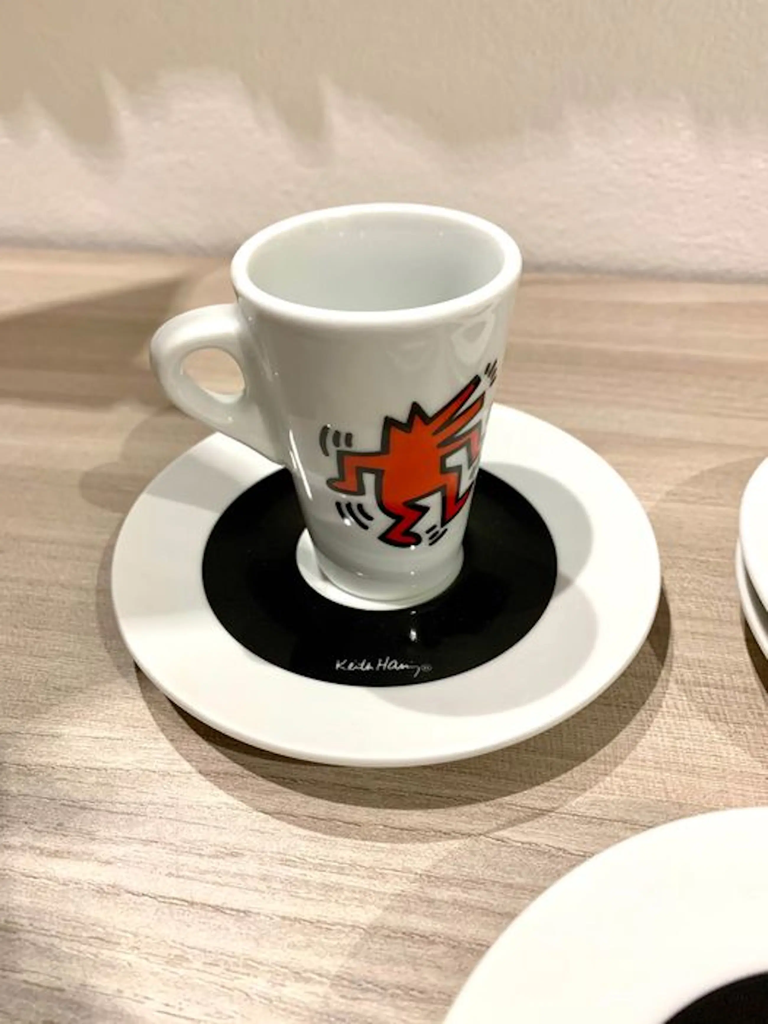 Discover an exceptional set of five espresso cups and saucers, illustrated by the iconic artist Keith Haring and produced by Tognana in the 1990s. These cups, true collector's items, capture Haring's vibrant energy and unique graphic style, with bold and colorful designs that add an artistic touch to your daily coffee ritual.