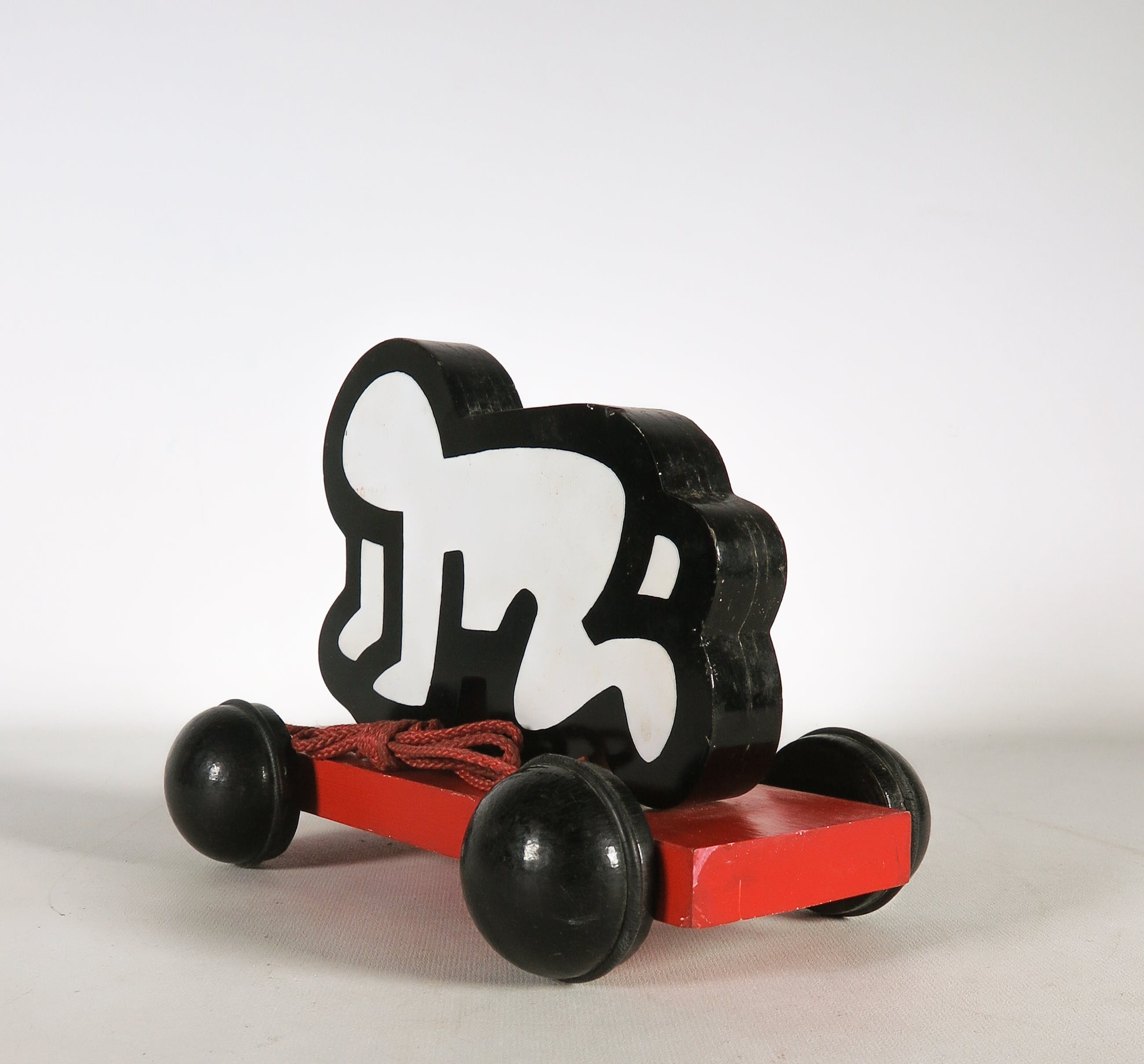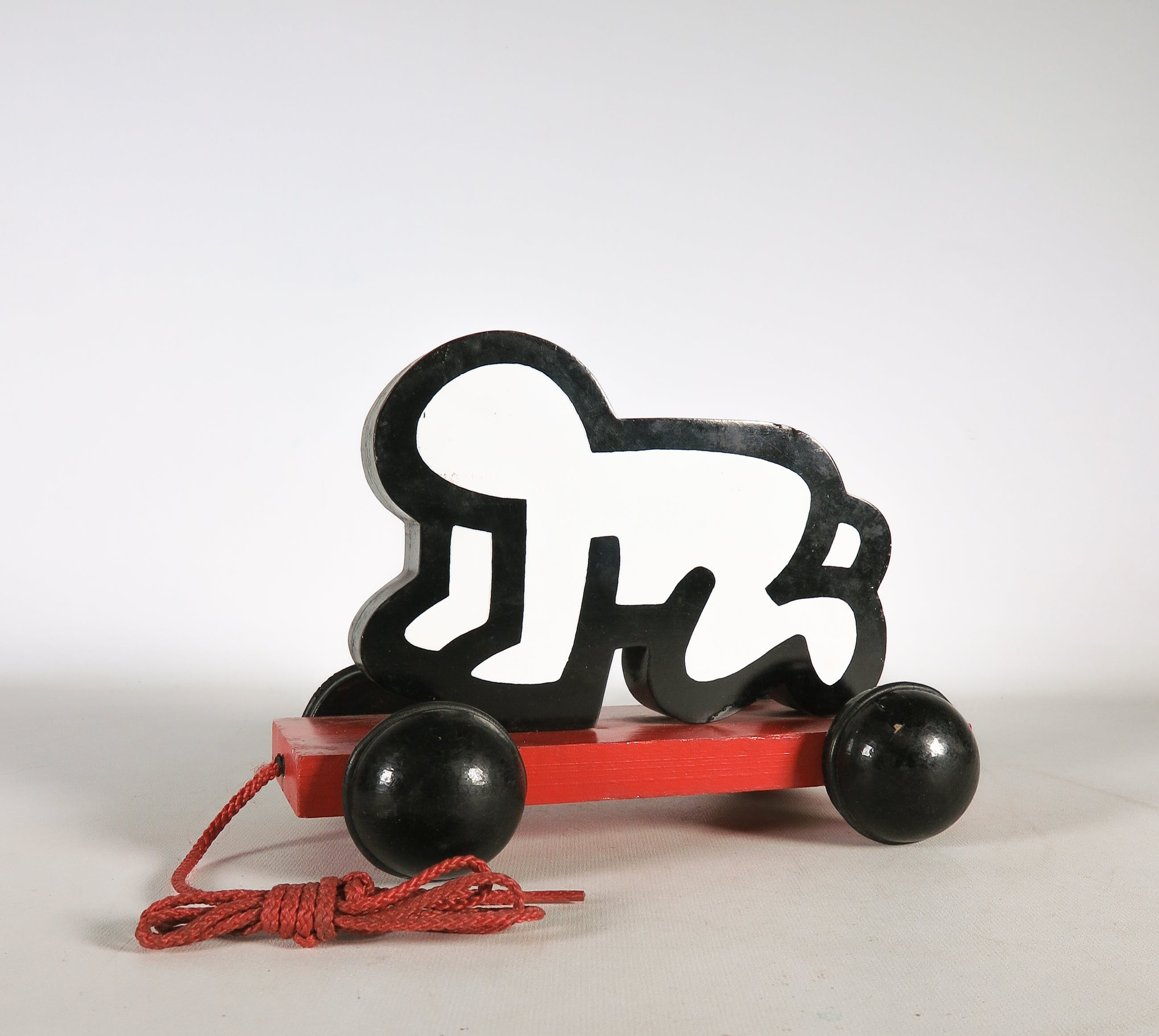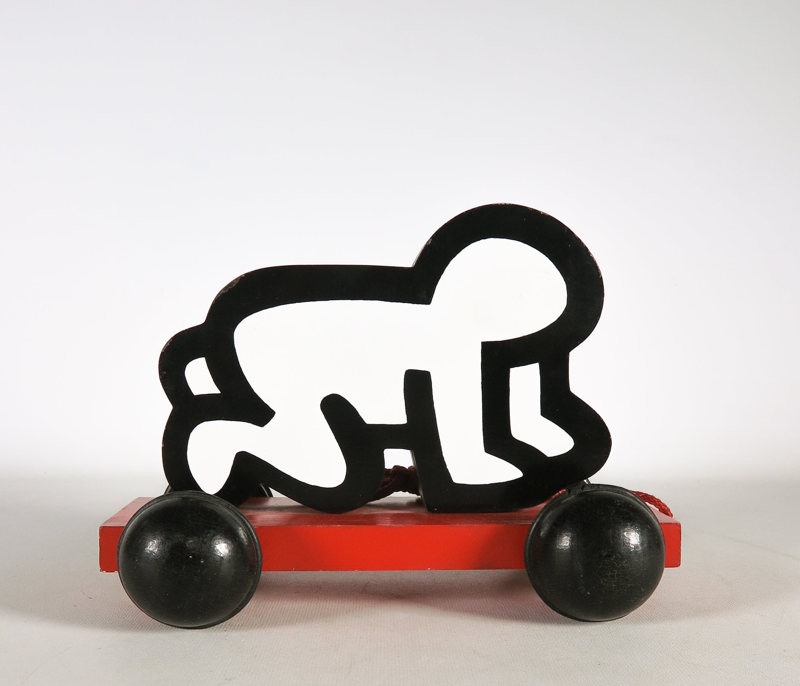 Beschilderd houten Haring Baby met trekkoord en wieltjes. Uitgegeven als speelgoed door Vilac. Het ontwerp en de uitgave is goedgekeurd door de Estate of Keith Haring.