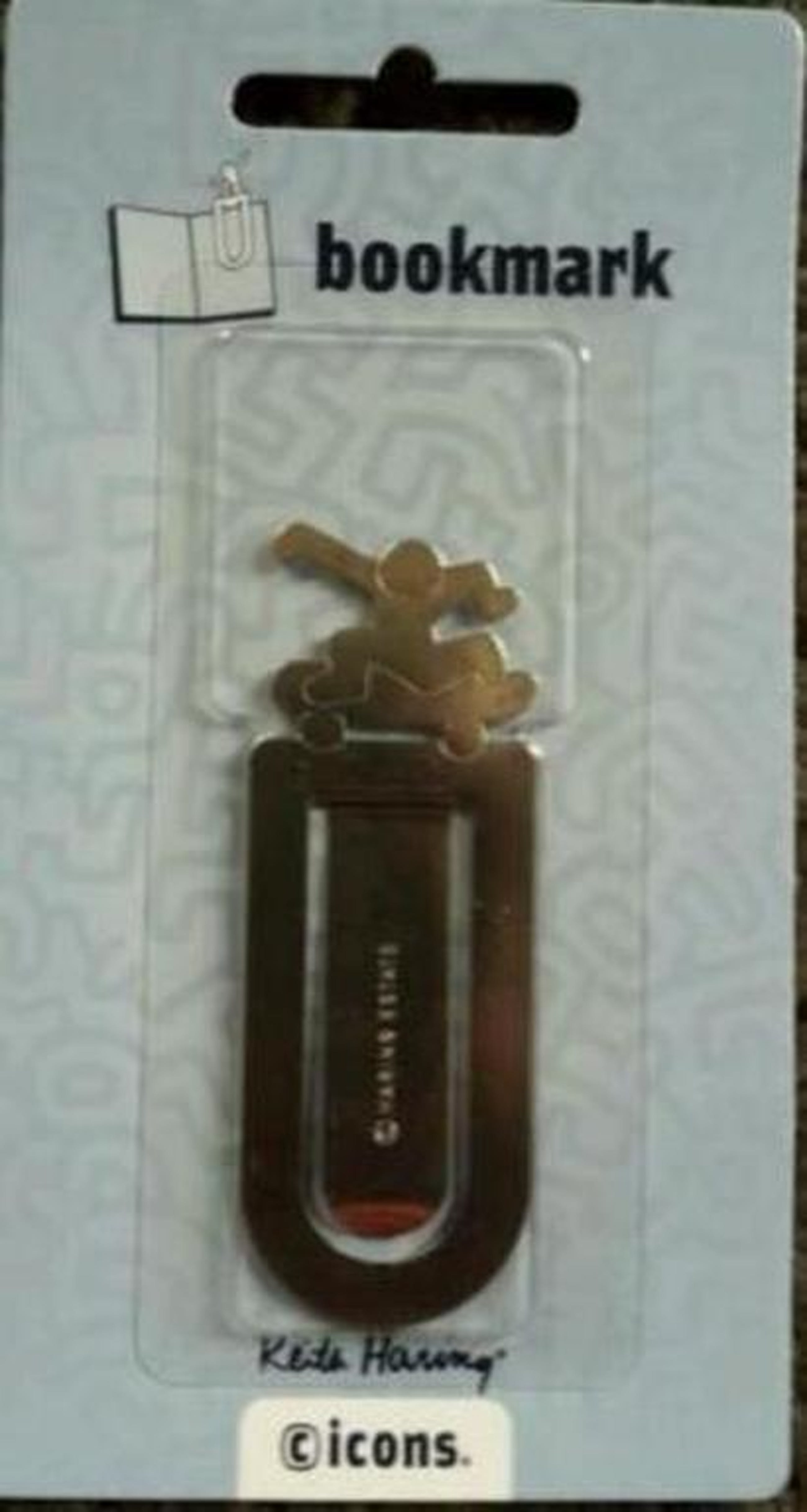 Een boekenclip in metaal, in het metaal is de authenticiteitsstempel gedrukt: ©Haring Estate