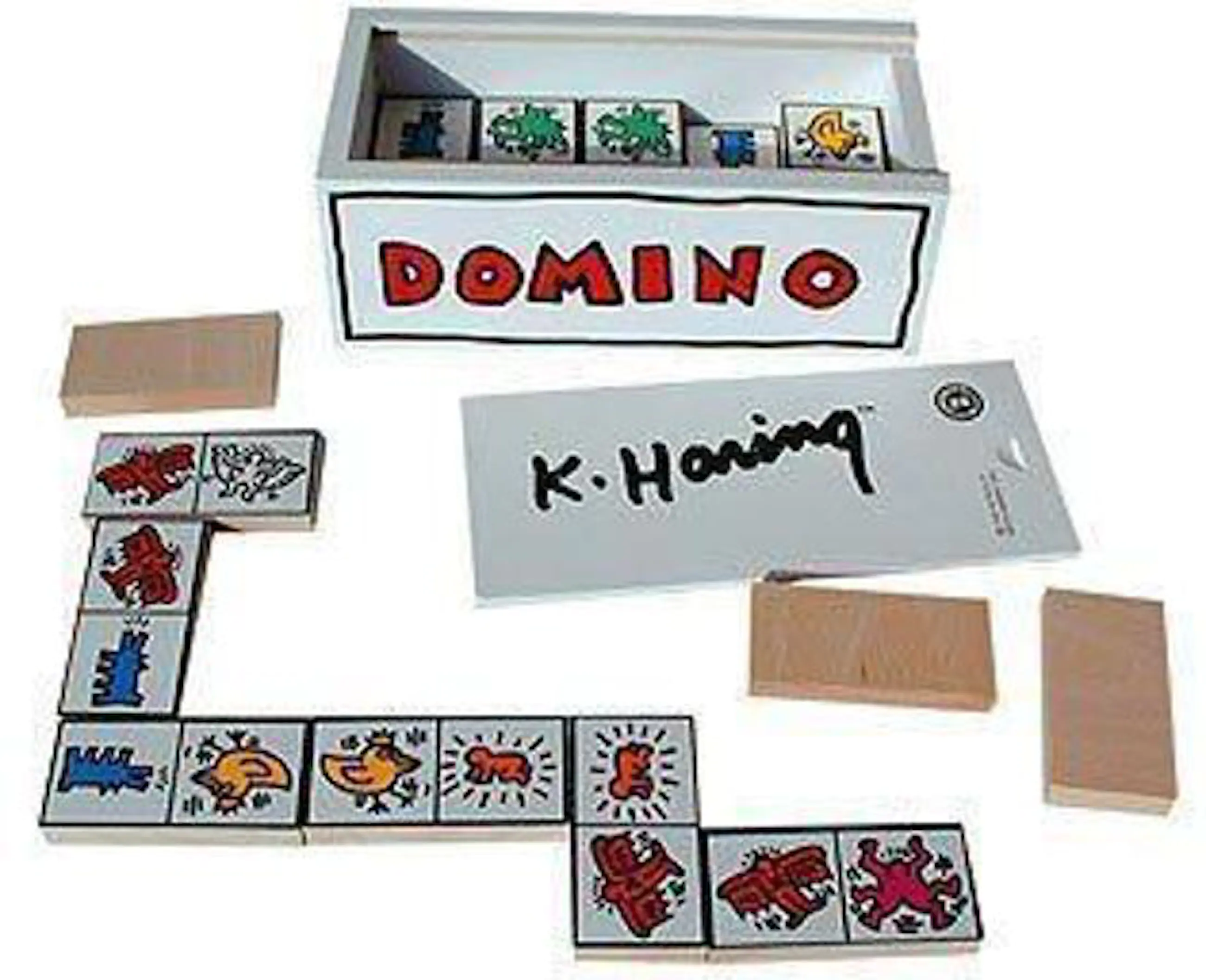 Op deze 28 handgemaakte houten dominostenen staan allemaal olijke en vrolijk Pop Art afbeeldingen getekend door Keith Haring. De set is kunstwerkje op zich en een collector's item. Geautoriseerd door The Estate of Keith Haring 1993