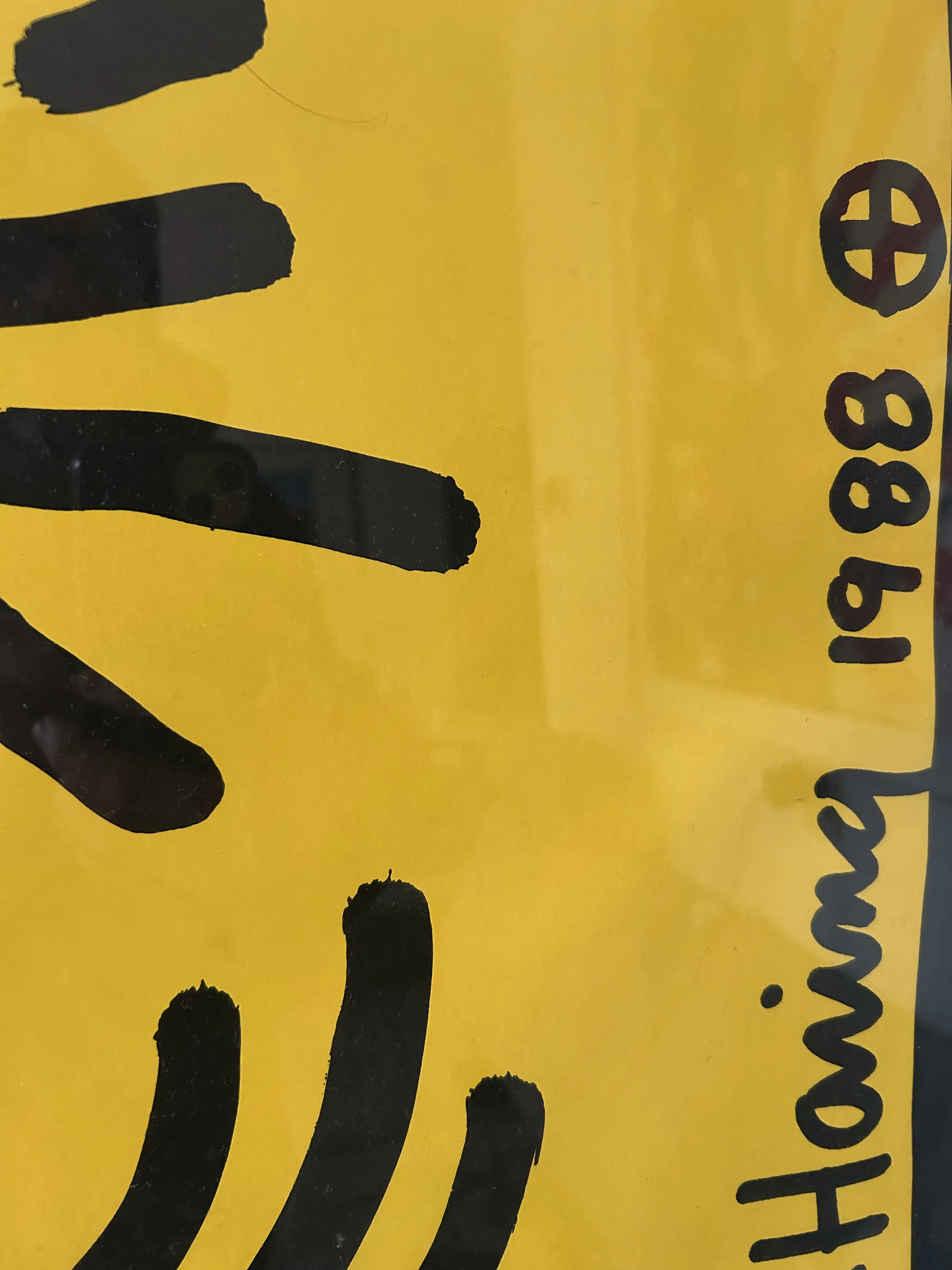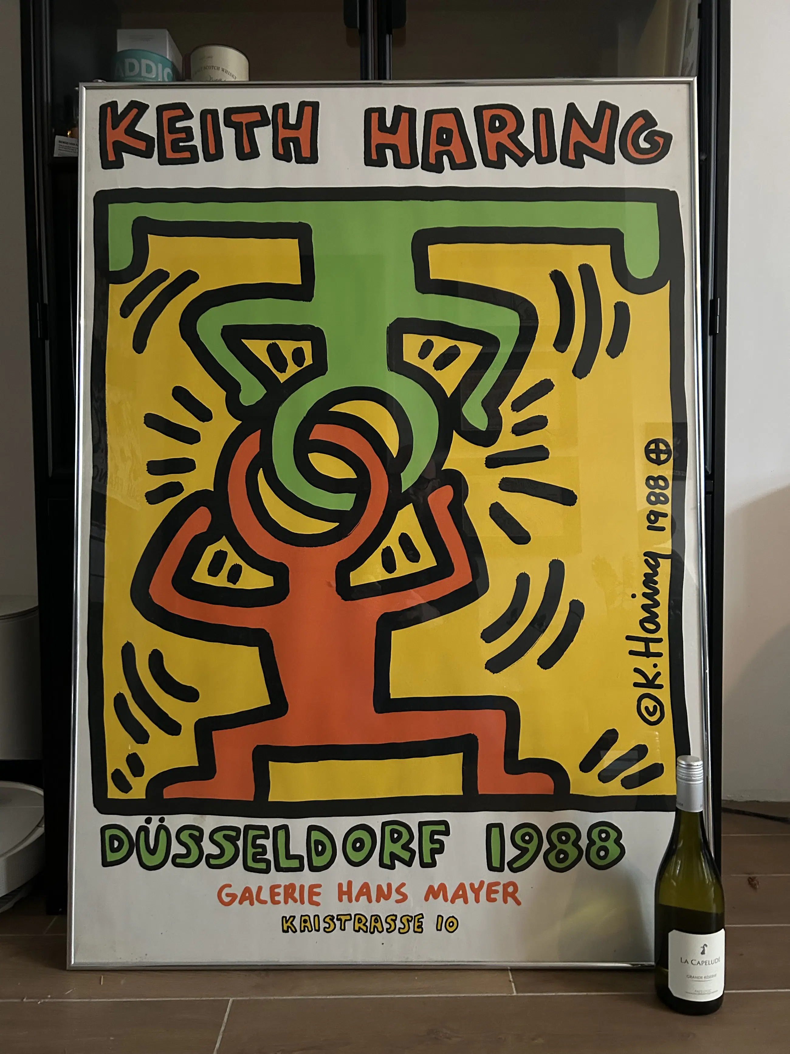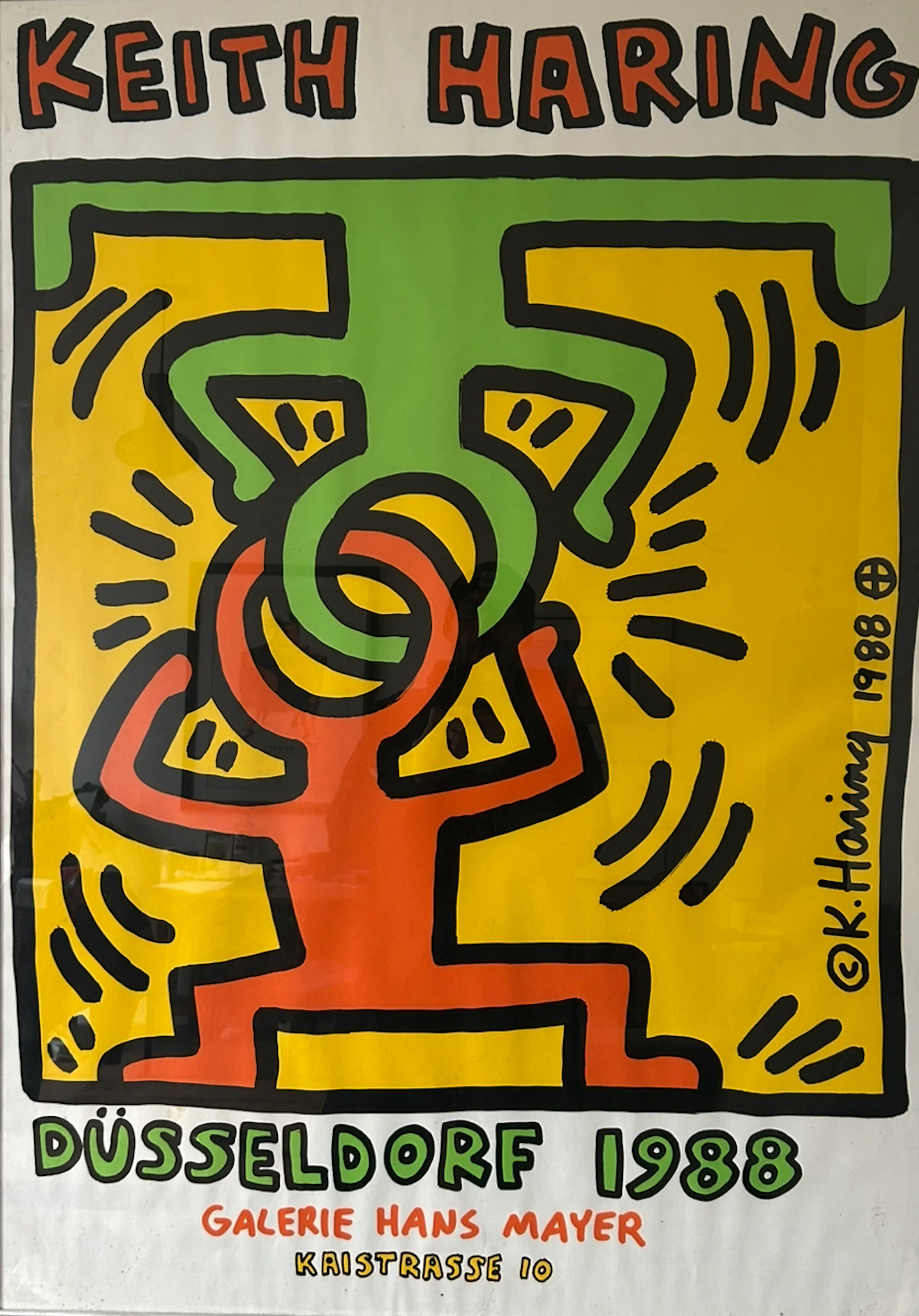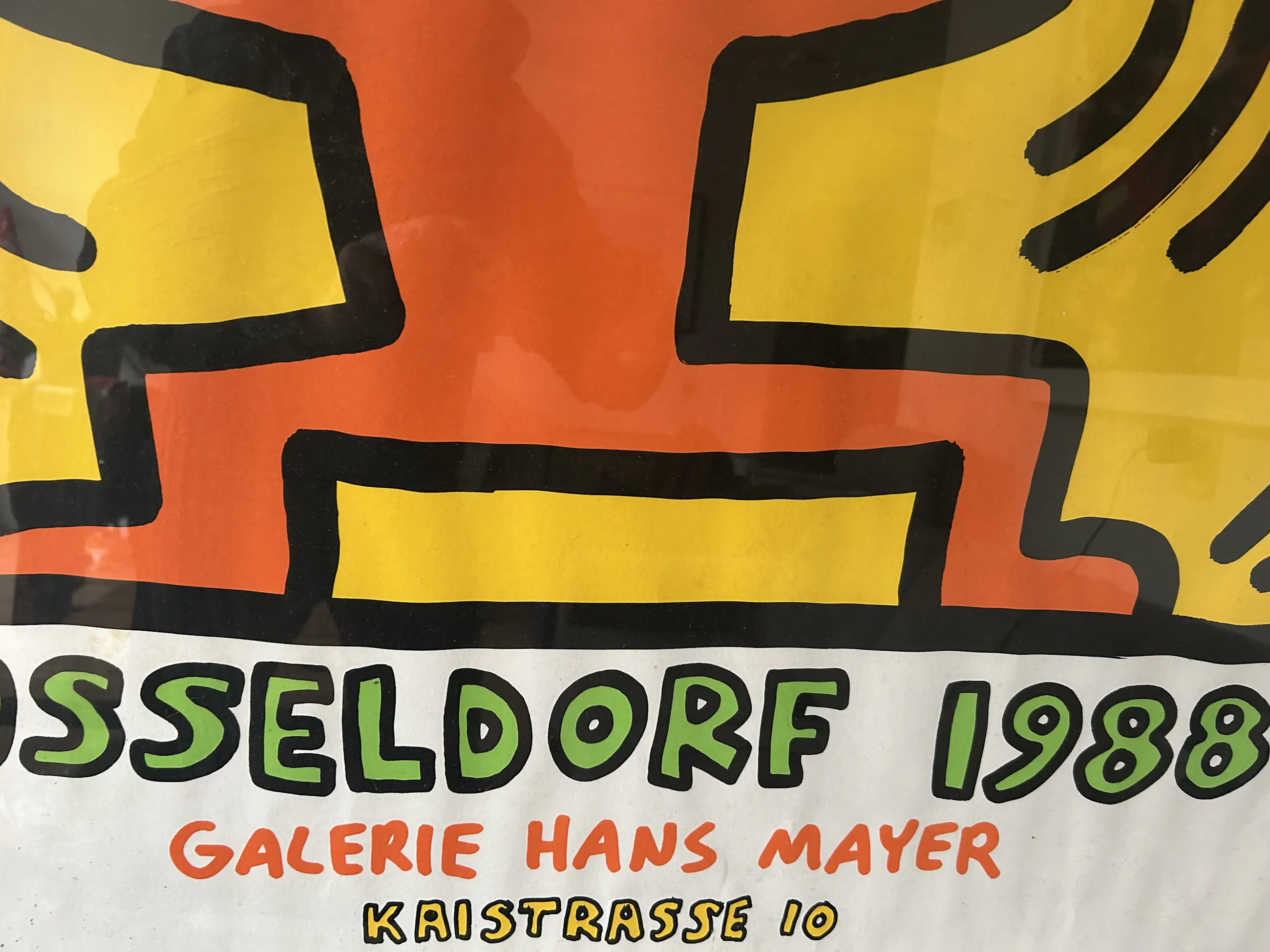 Originele zeefdruk, uitgebracht voor Haring’s expositie bij Galerie Mayer in Düsseldorf.Deze druk is in twee formaten uitgebracht. De kleinere oplage is in grote oplage gedrukt waarschijnlijk 250+, dit formaat is veel zeldzamer en er zijn er waarschijnlijk minder dan 125 van gemaakt. Kleuren in nieuwstaat, gezien de leeftijd in zeer goede conditie. Kleuren zijn in nieuwstaat! De oneffenheden welke op de foto’s te zien zijn, zijn het echt niet/nauwelijks zichtbaar.