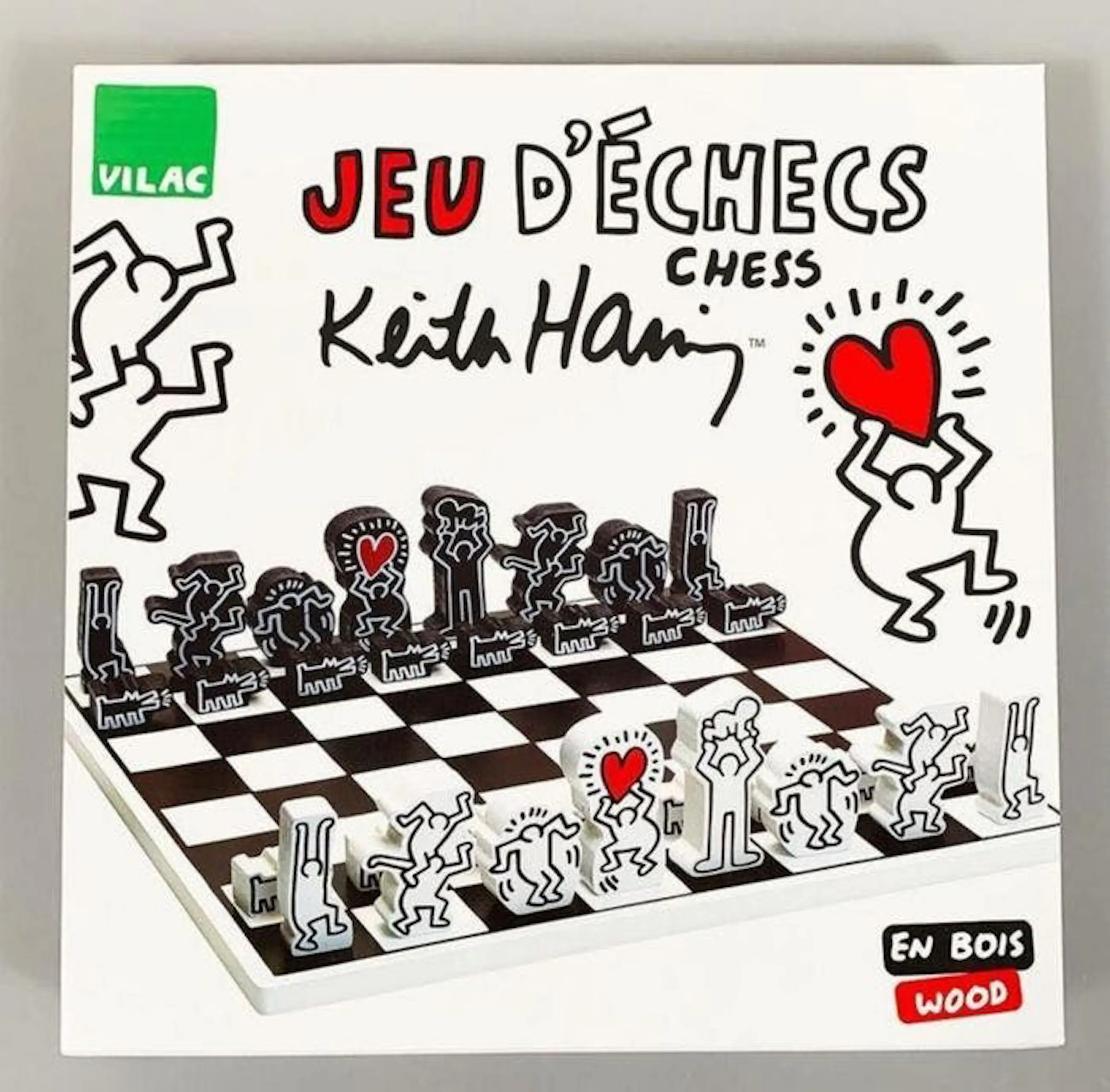 Schaakspel geautoriseerd door de amerikaanse pop art kunstenaar Keith Haring. Gemaakt van hout en geproduceerd door Vilac.