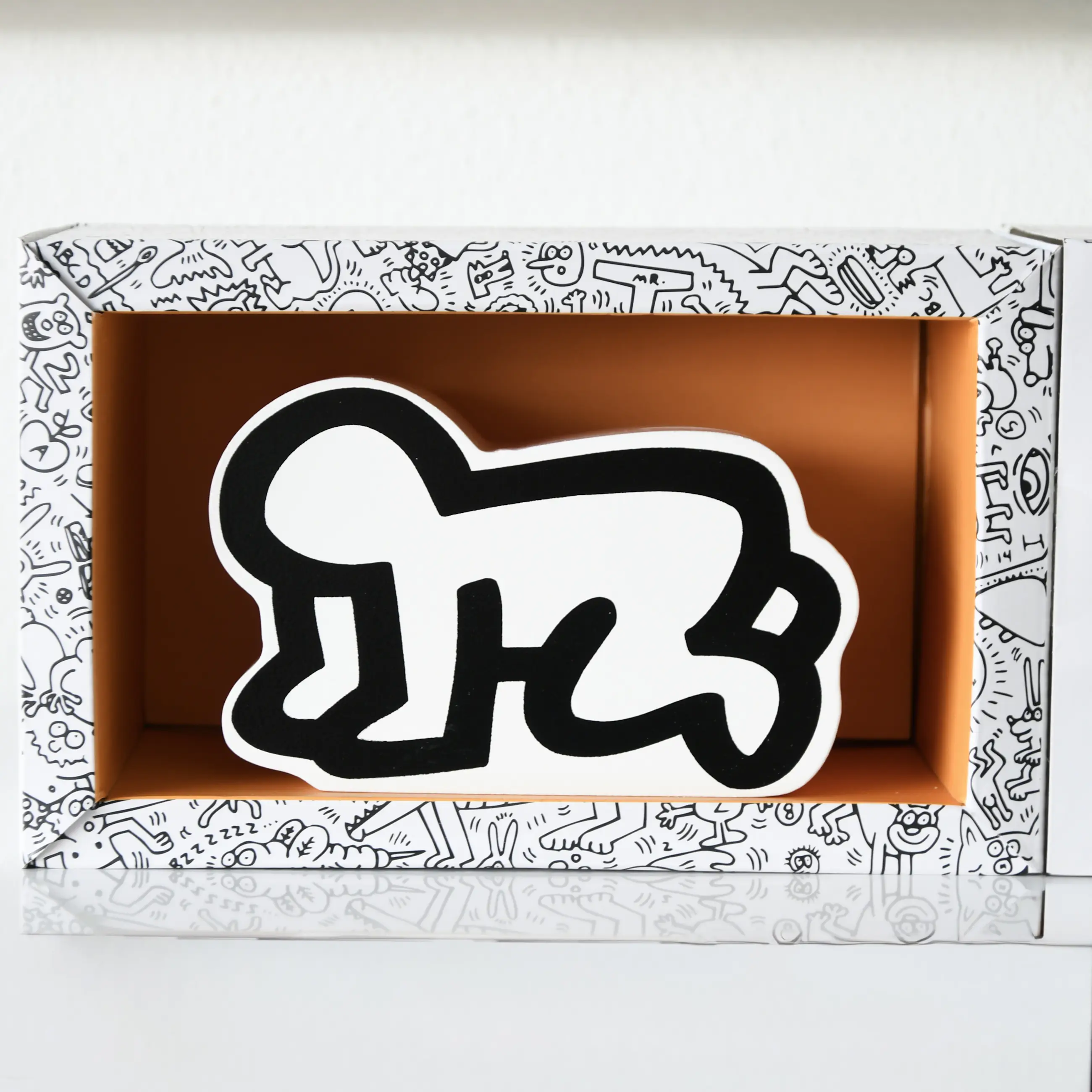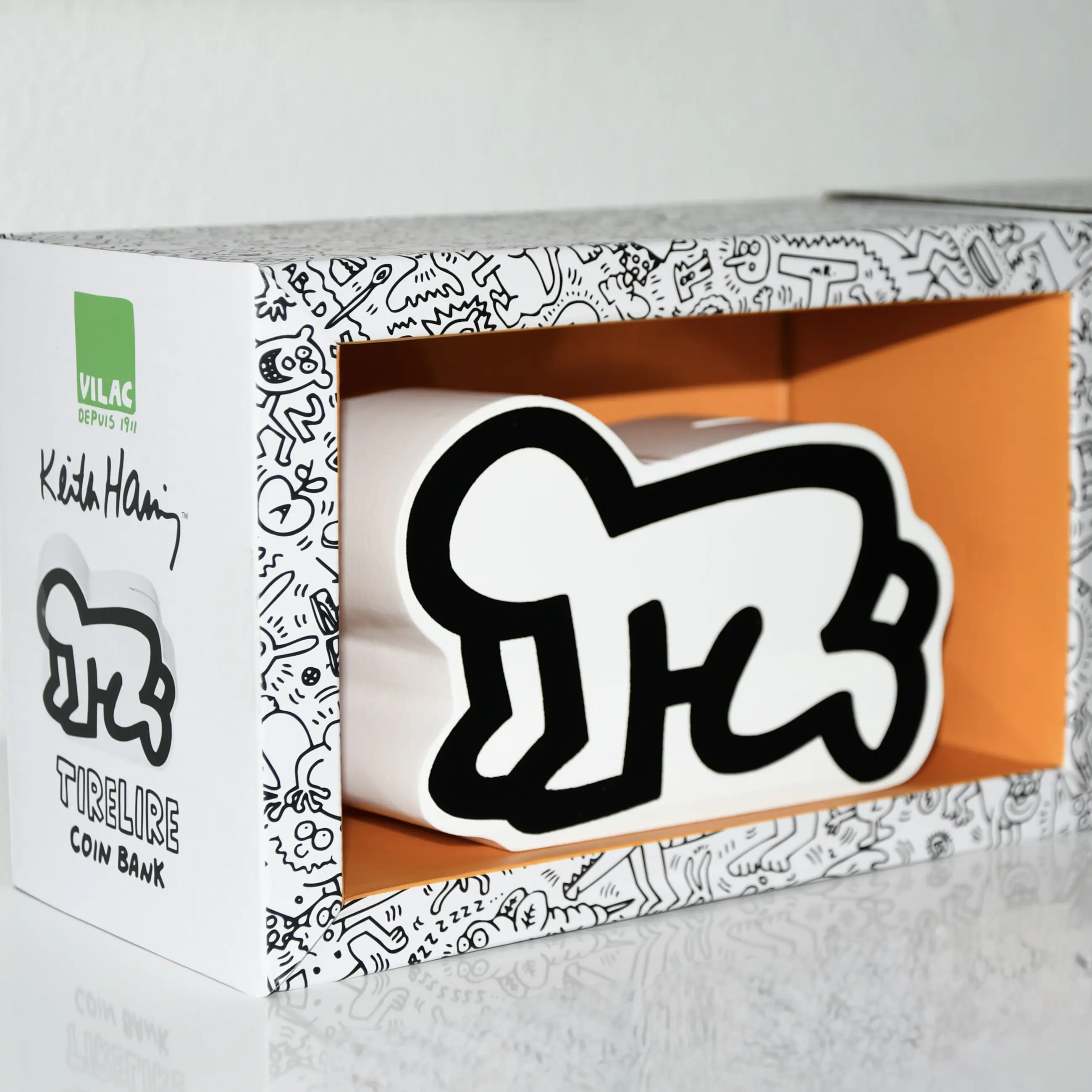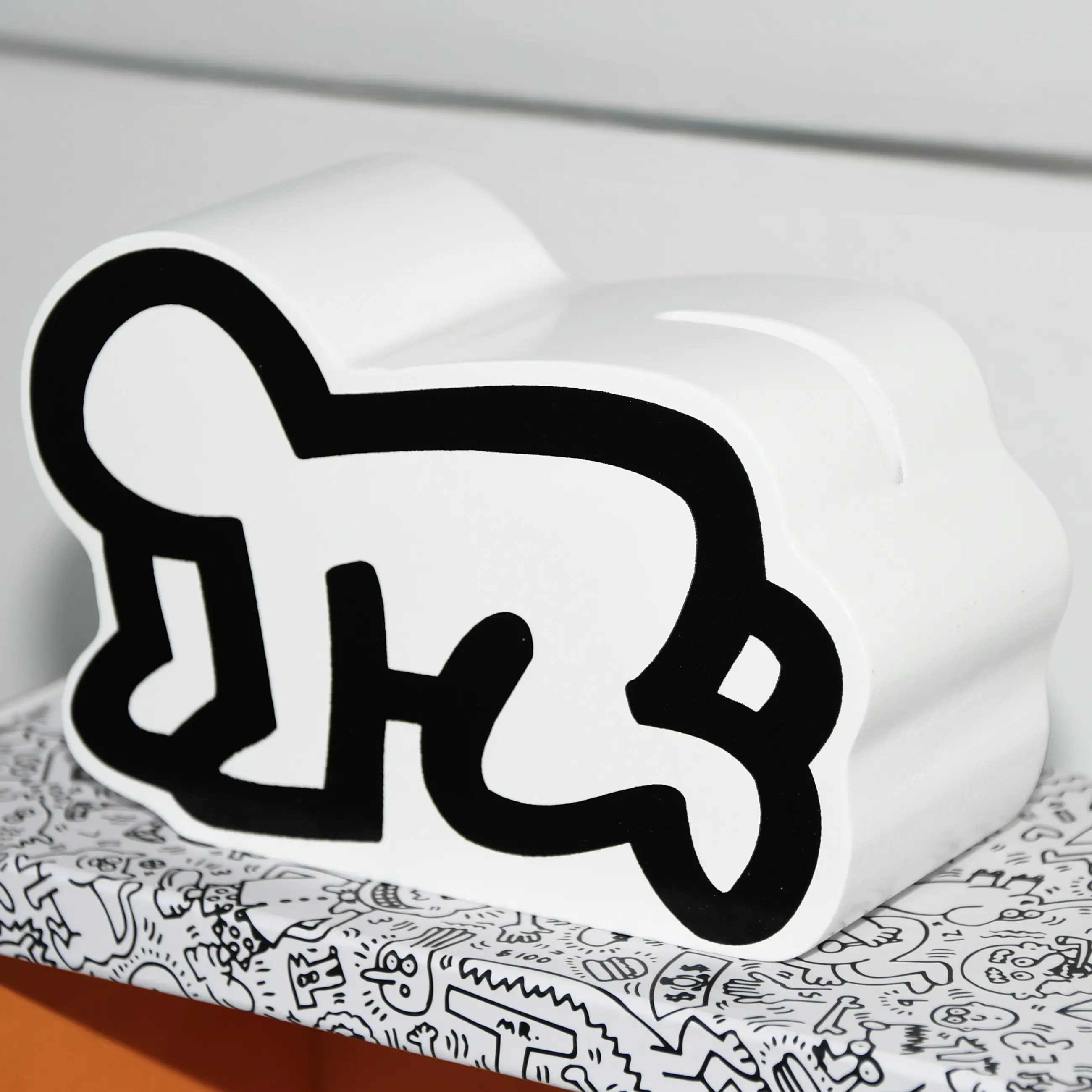 Een in nieuwstaat en met de originele verpakking, een prachtige houten Popart spaarpot geïllustreerd door Keith Haring (1958-1990) en gebaseerd op zijn werk 'Radiant Baby'.