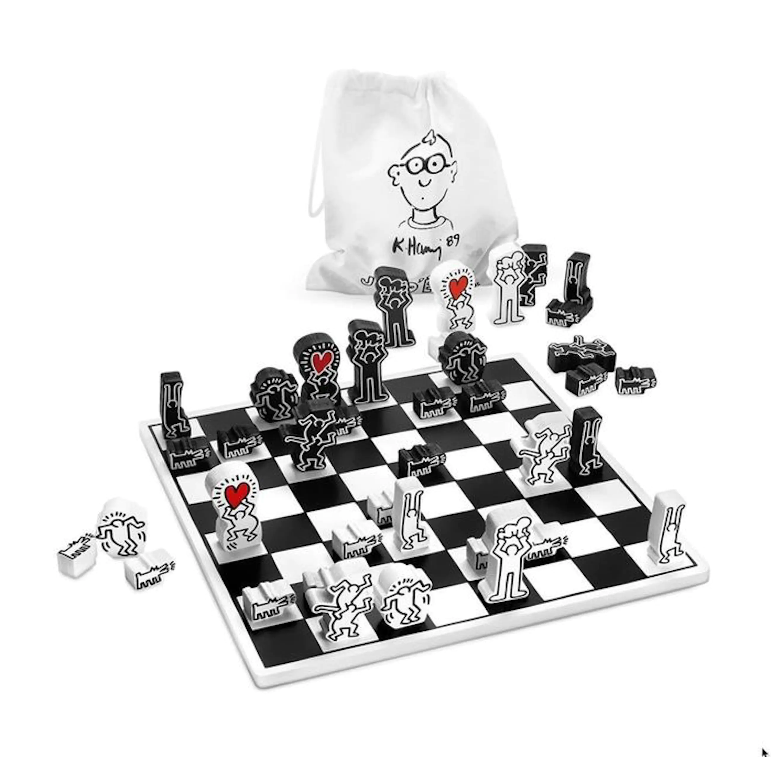 the Keith Haring Chess Set includes a white fabric bag to hold the