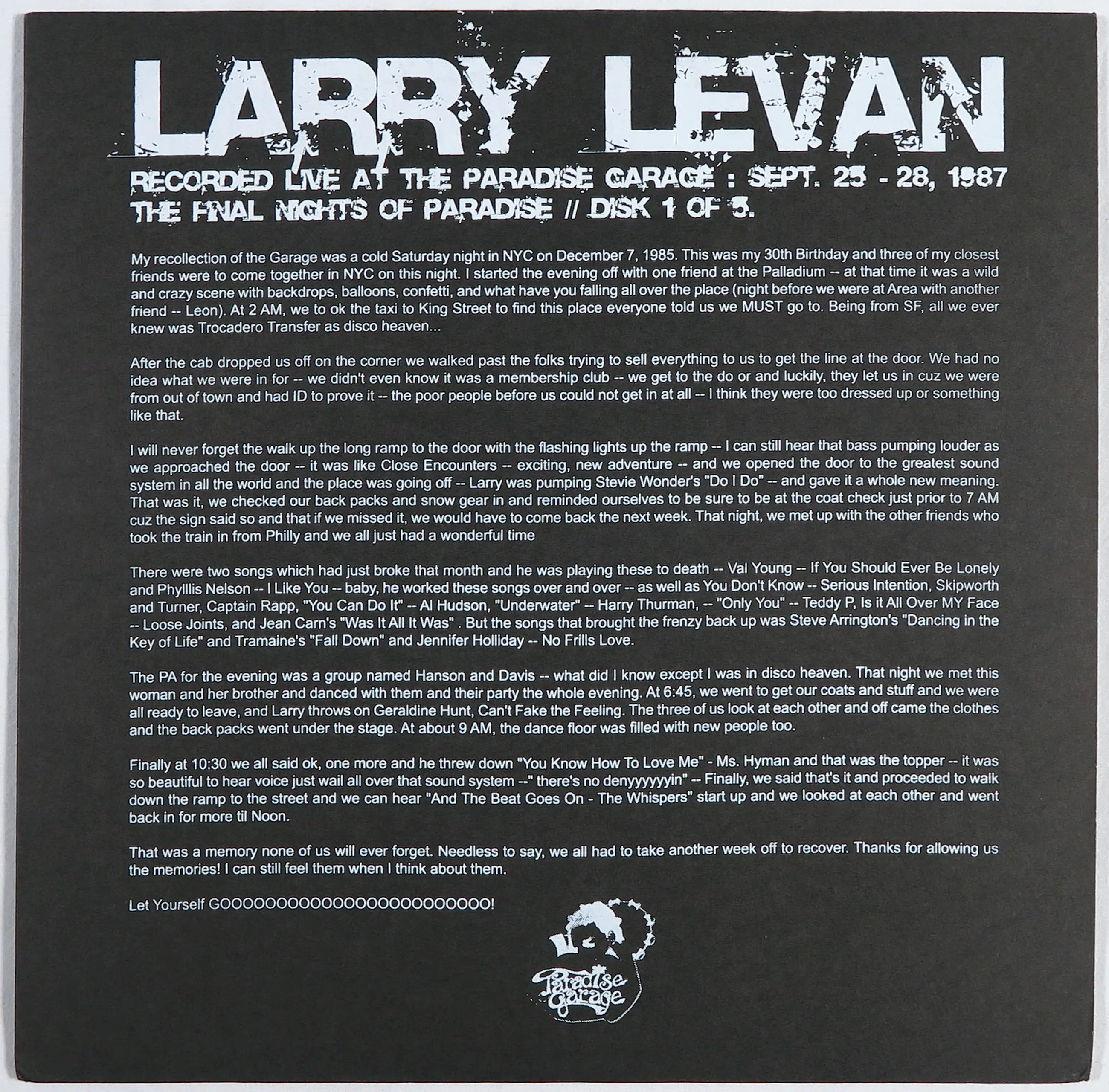 LP-hoes ontworpen door Keith Haring bij het album The Final Nights of Paradise Pt. 1/5 (release 2009) van Larry Levan. Het betreft een live opname van het concert in The Paradise Garage in New York in 1987. Live gemixt door Larry Levan op een Thorens TD-125 MKII draaitafel.