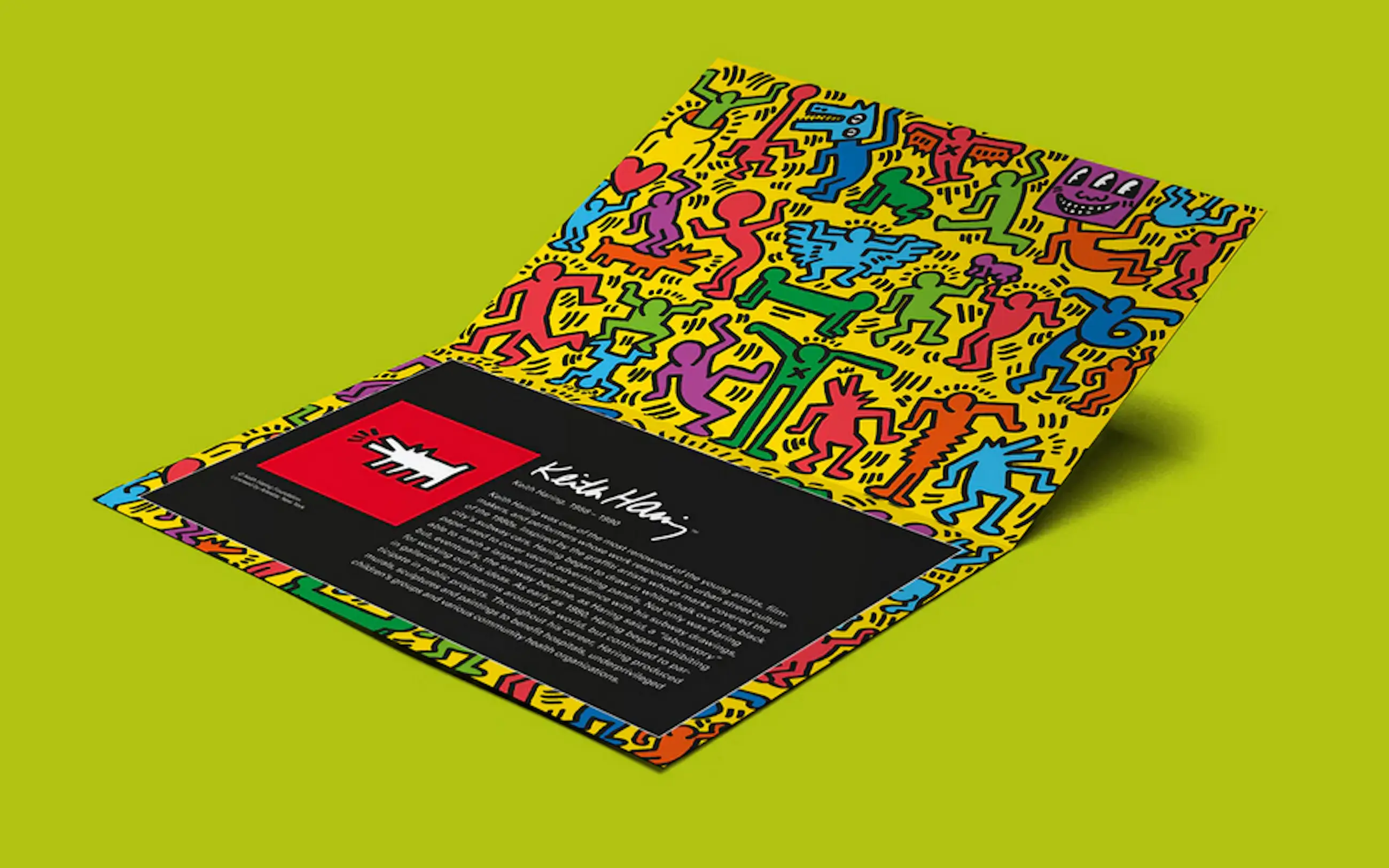 The boxset includes a short biography of the artist. A short story about Keith Haring and his attitude. He was one of the most renowned of the young artists, filmmakers and performers of his generation. His work responded to urban street culture of the 1980s. Inspired by the graffiti artists whose marks covered the city’s subway cars, Haring began to draw in white chalk over the black paper used to cover vacant advertising panels. As early as 1980, Haring began exhibiting in galleries and museums around the world but continued to participate in public projects. Throughout his career, Haring produced murals, sculptures and paintings to benefit hospitals and underprivileged children’s groups.