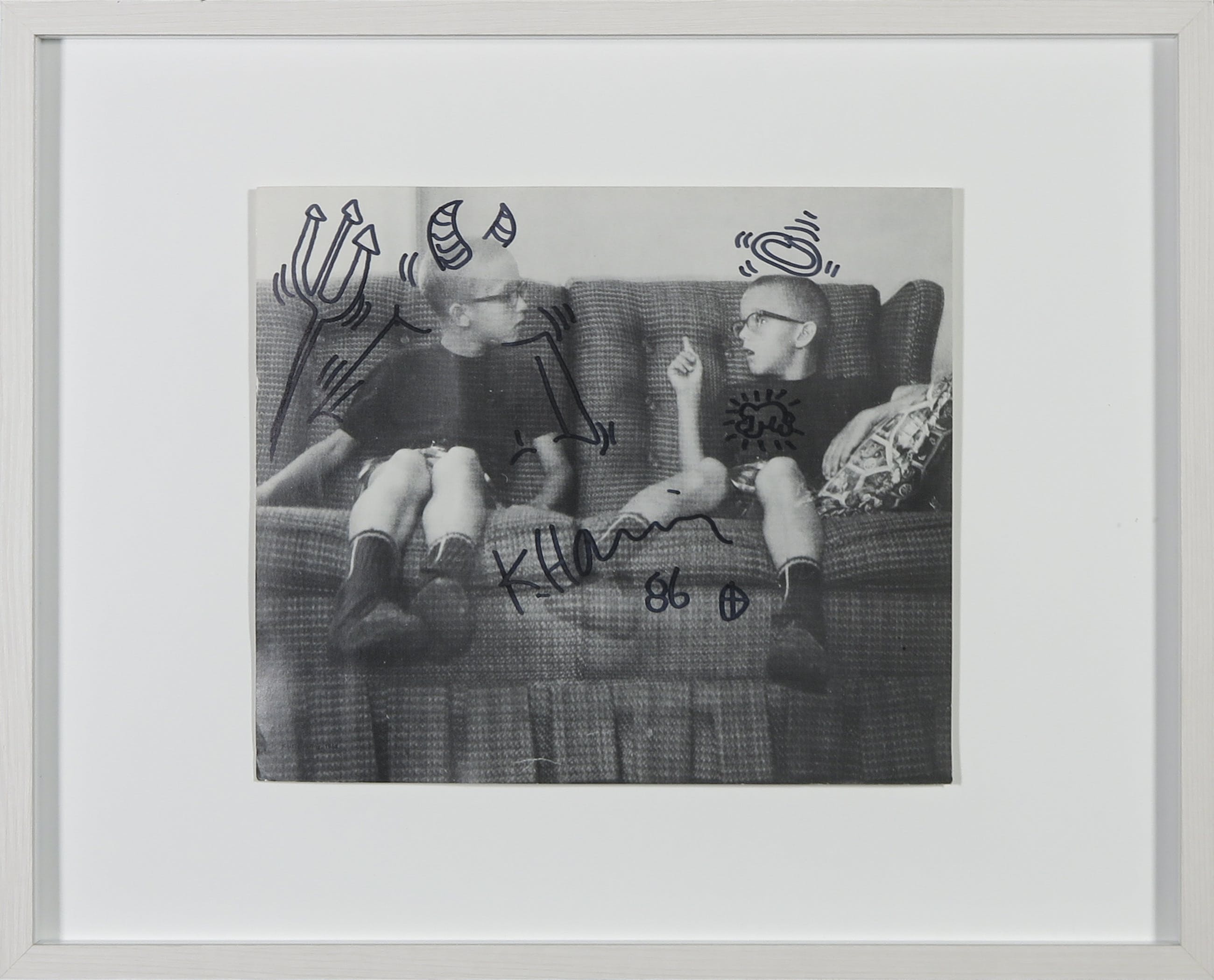 Tekening in zwarte viltstift op een kinderfoto van Haring (Keith + zijn broer). Het beeld is in het midden gesigneerd en gedateerd (1986).
