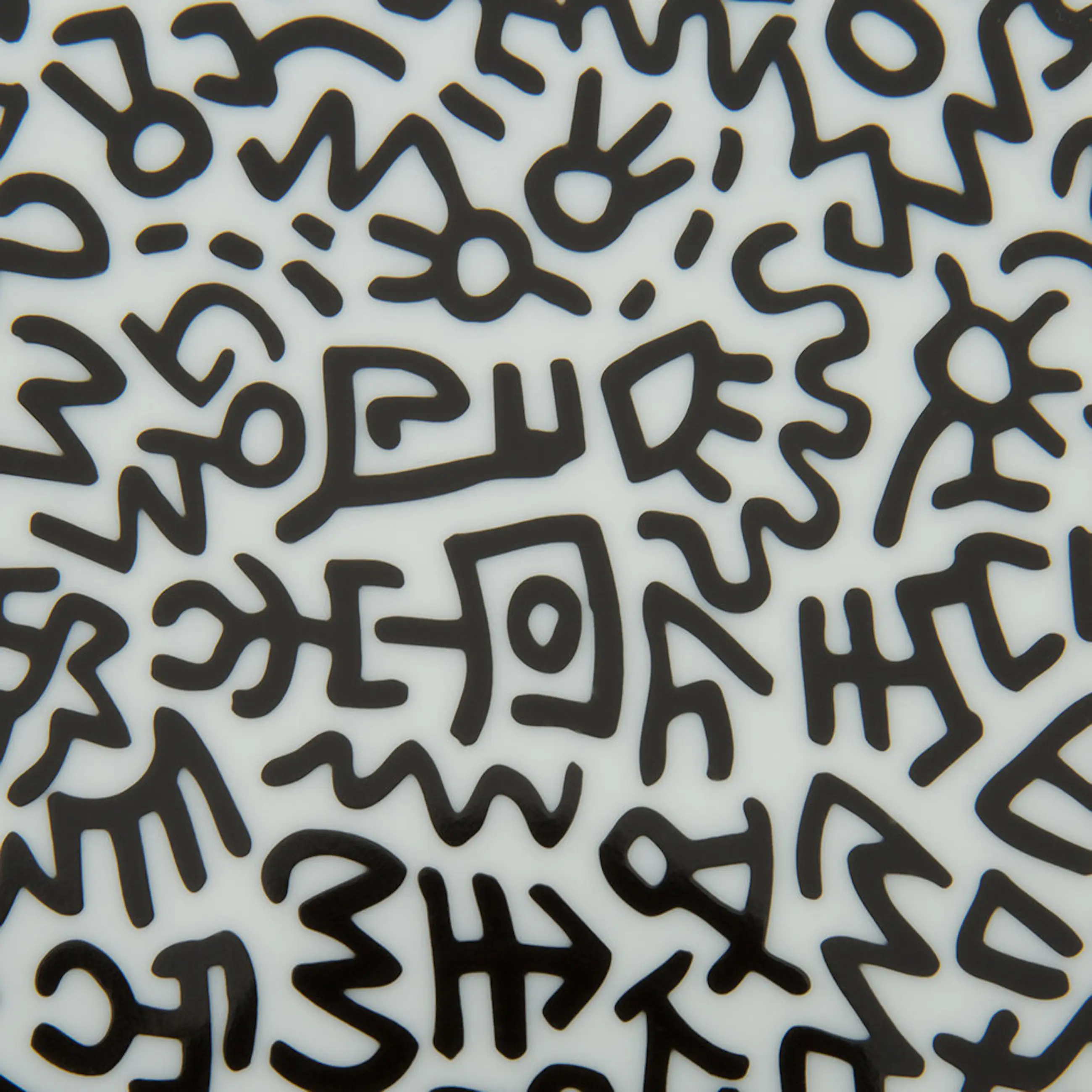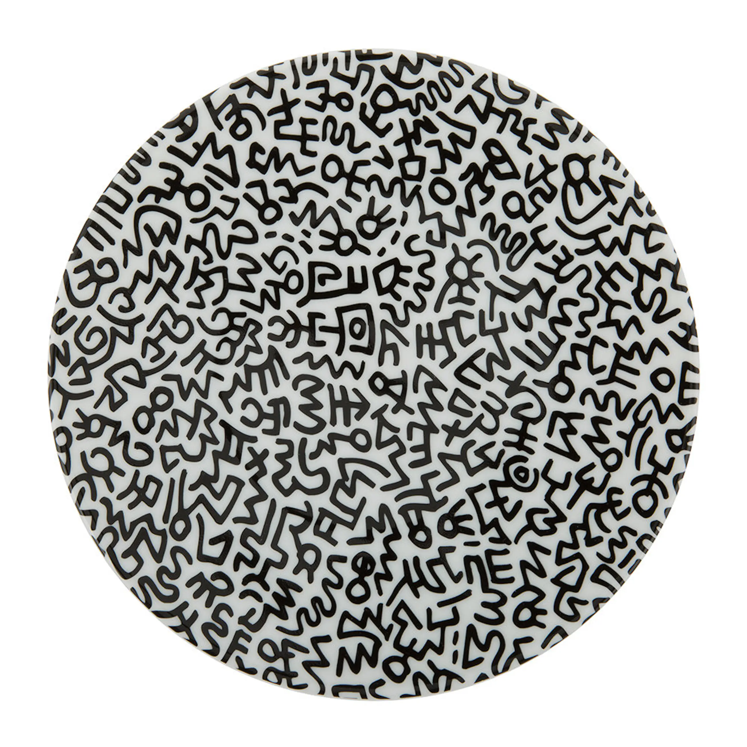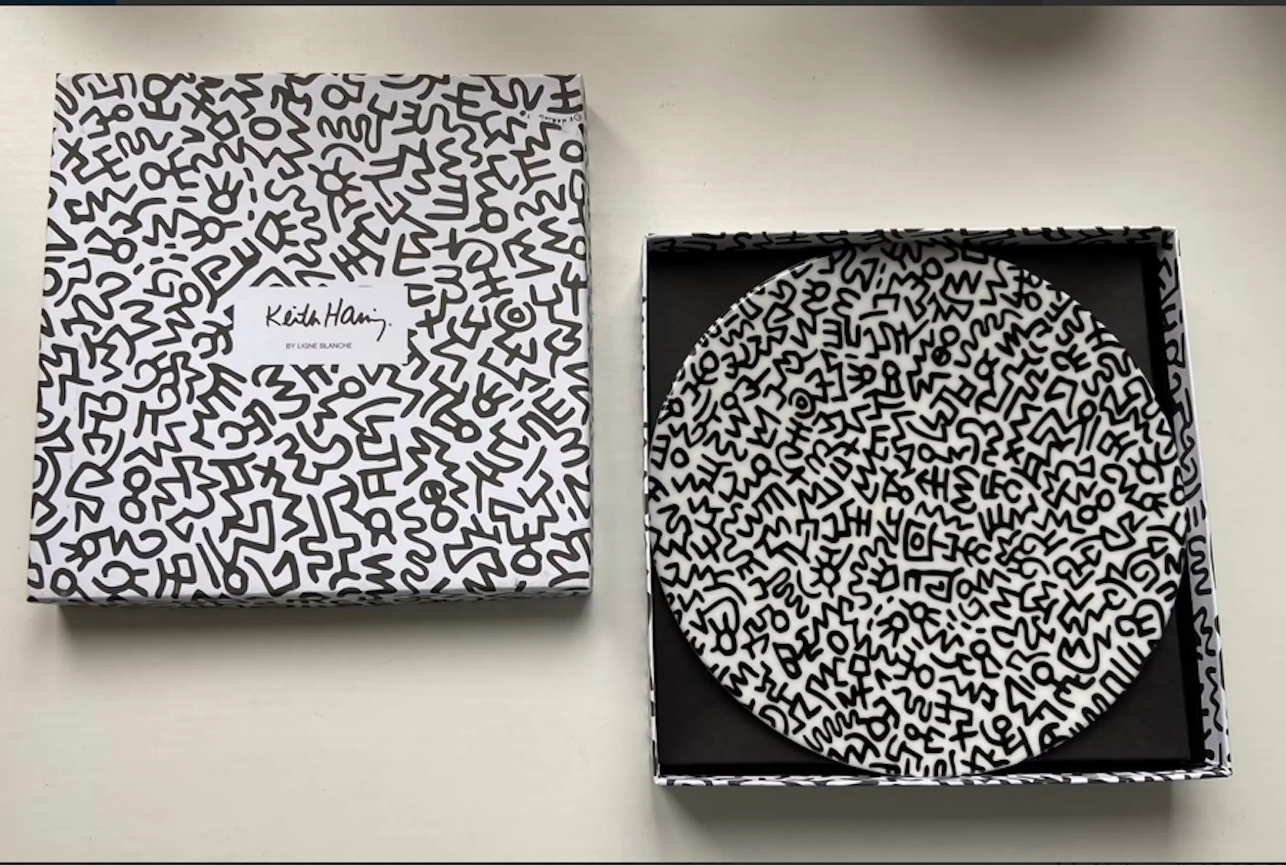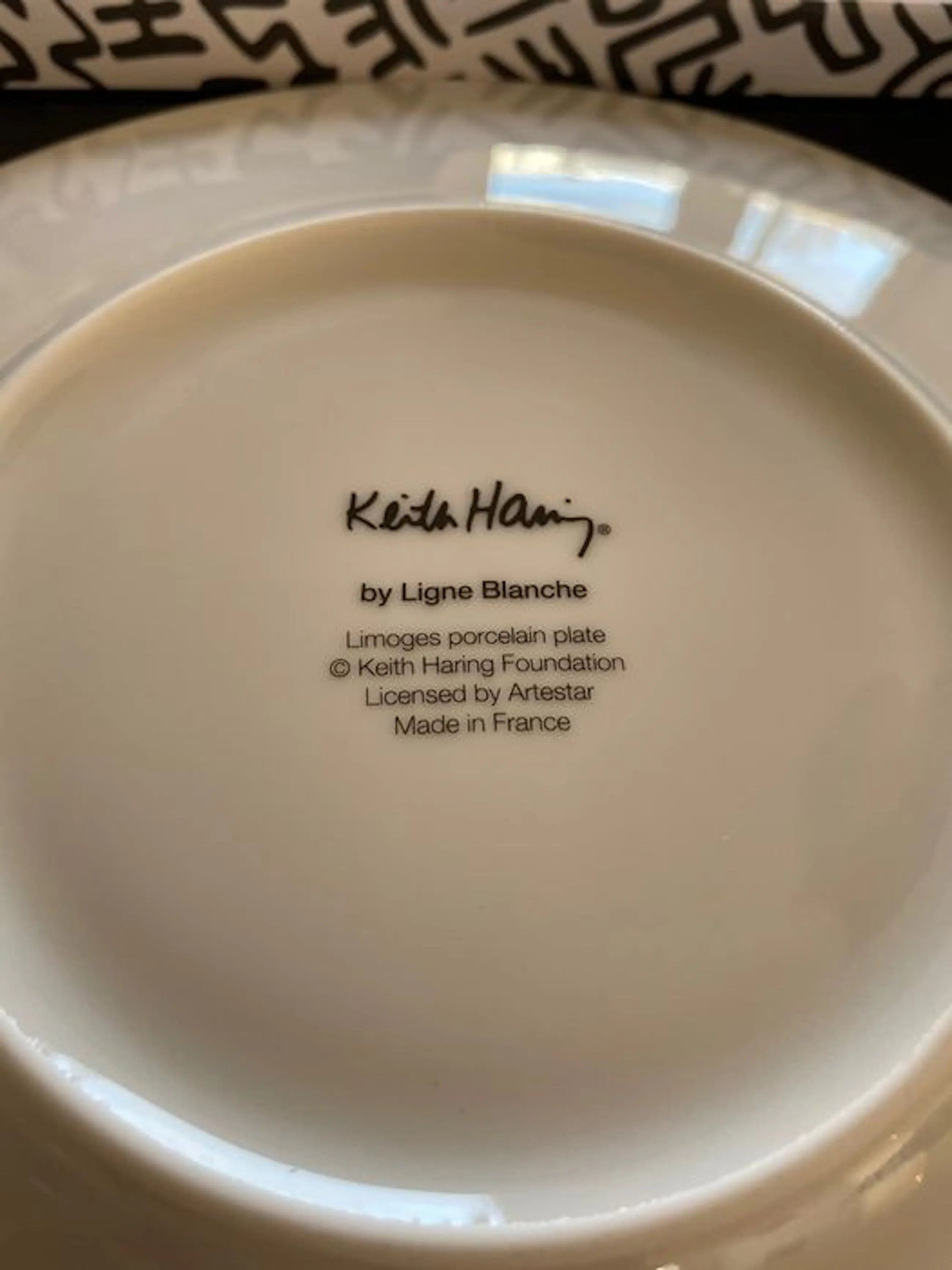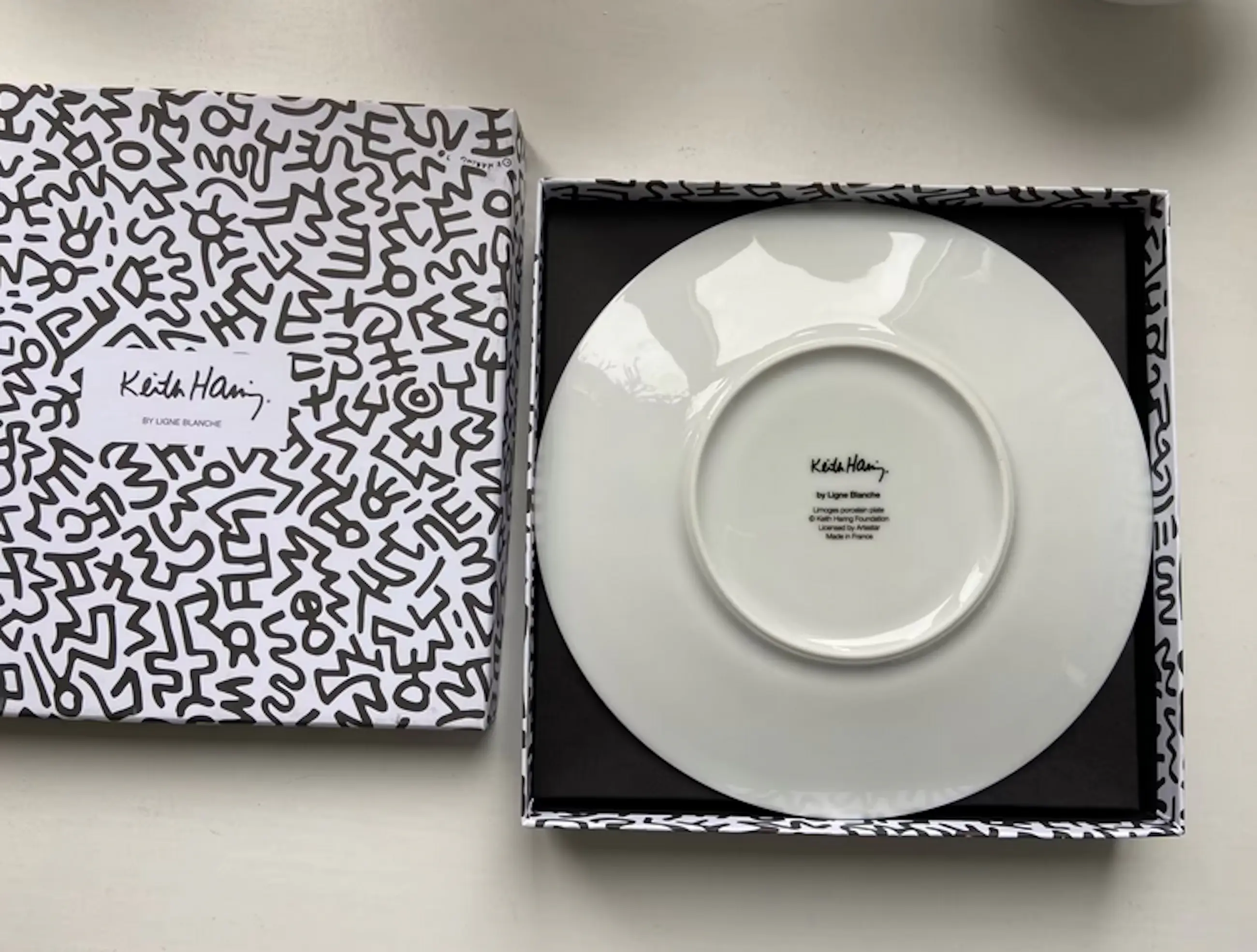 Design based on works by Keith Haring Limoges porcelain in themed black & white box.210 mm Diameter