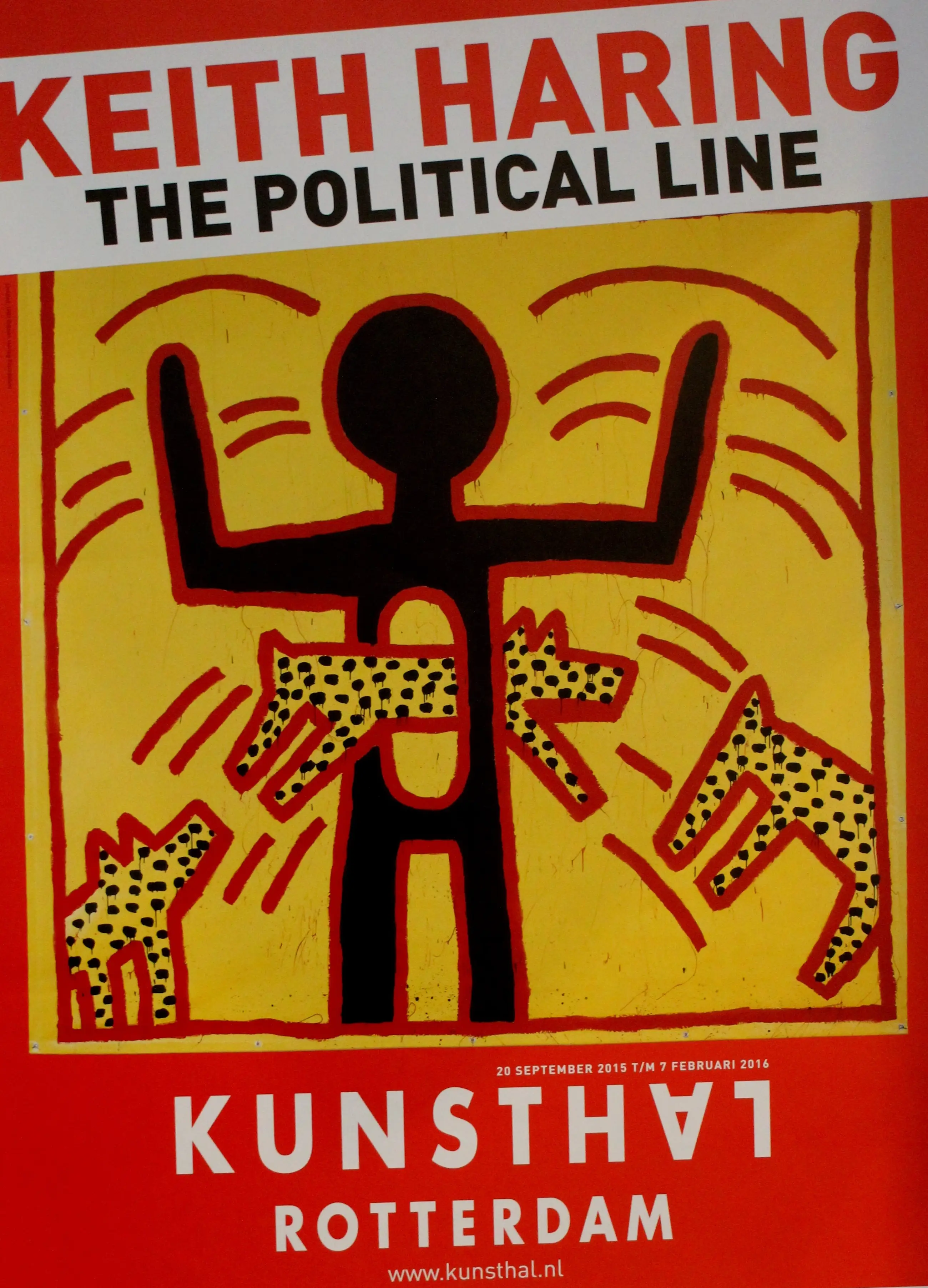 Poster van Keith Haring. Titel: the political line. Uitgegeven voor de kunsthal Rotterdam. Jaar: 2015/2016. Afmetingen blad: H59.5 x b42cm. Het werk is niet gesigneerd.