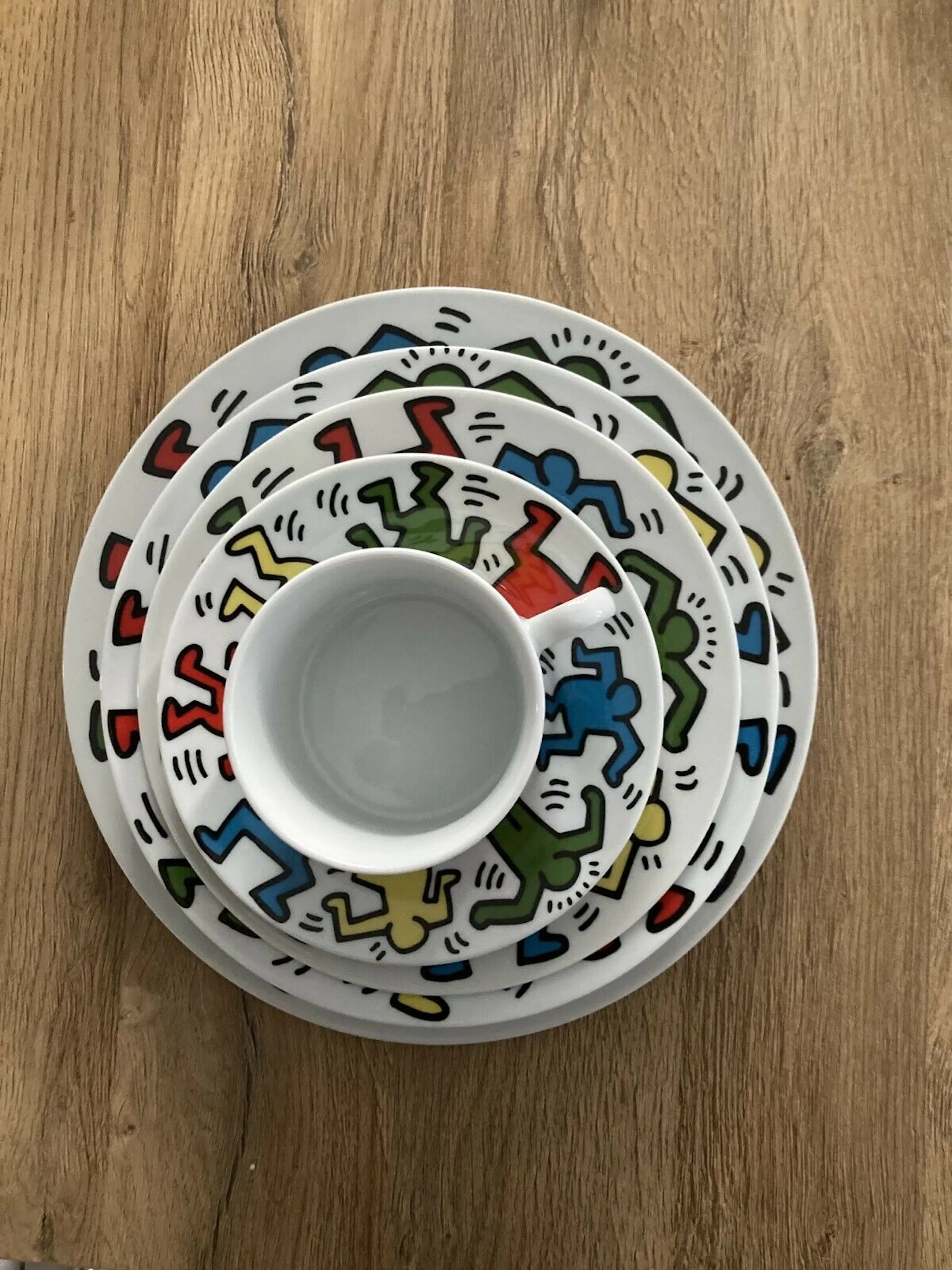 Keith Haring Servies: 3 verschillende maten borden, 1 koffiekop en schotel.