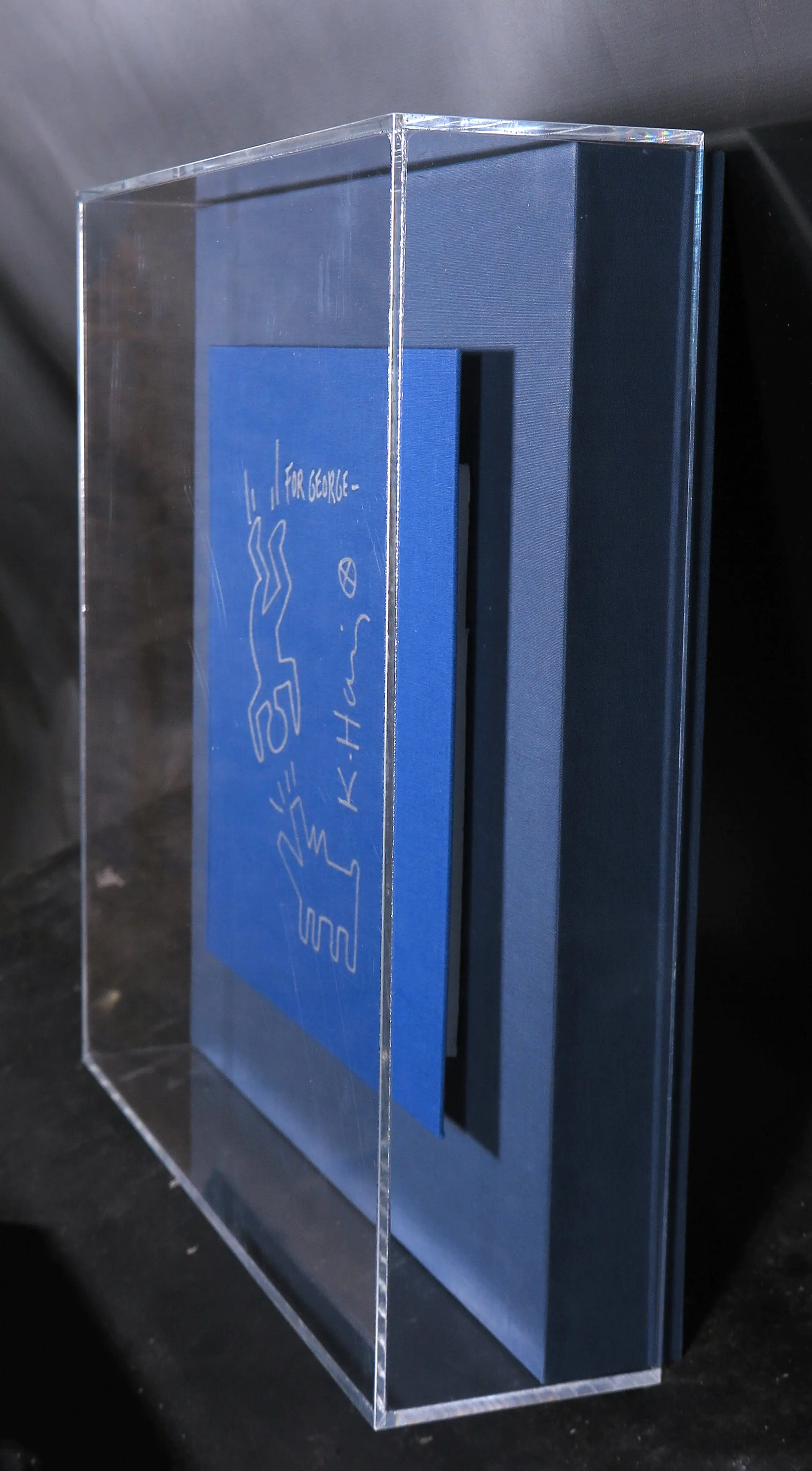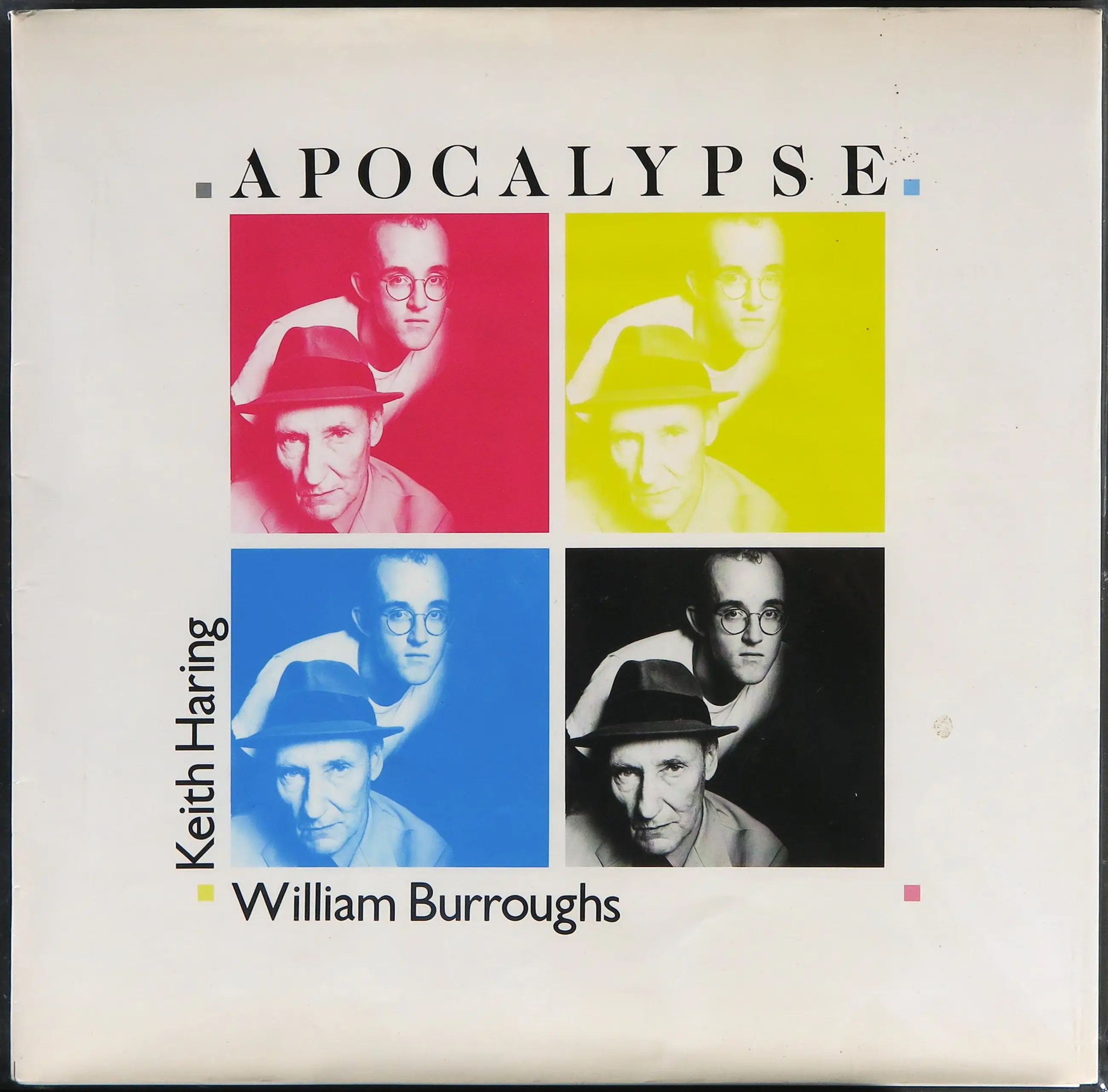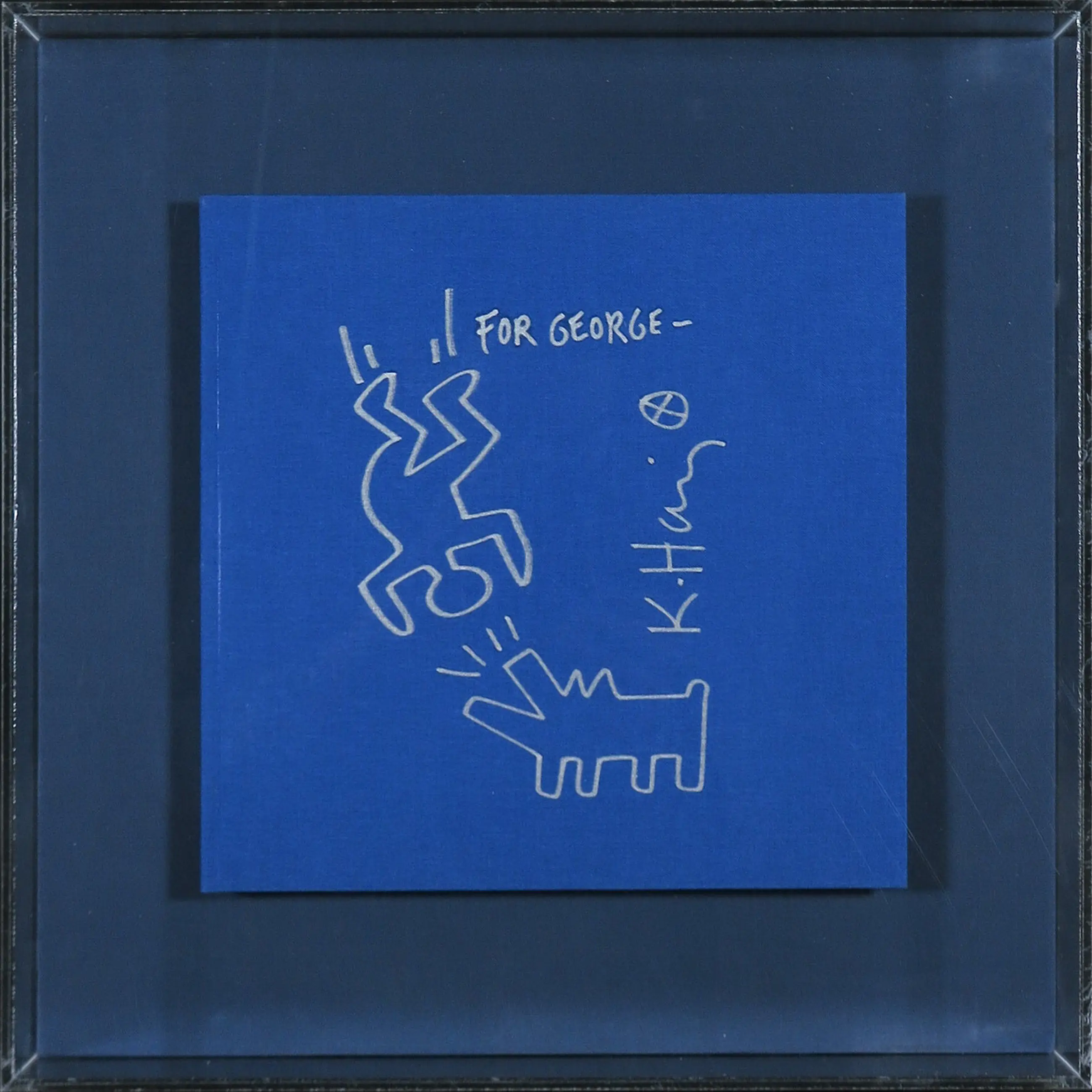 Bijzondere originele tekening, door Keith Haring gemaakt met zilveren stift op de kaft van het boek Apocalype (Apocalypse, Keith Haring en William Burroughs, uitgegeven door George Mulder Fine Arts in 1988) . Voorzien van persoonlijke opdracht (For George).