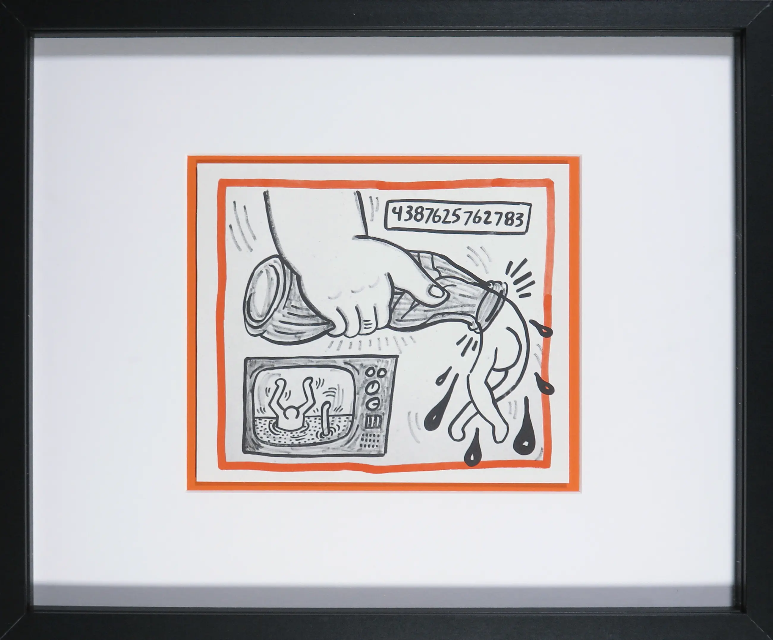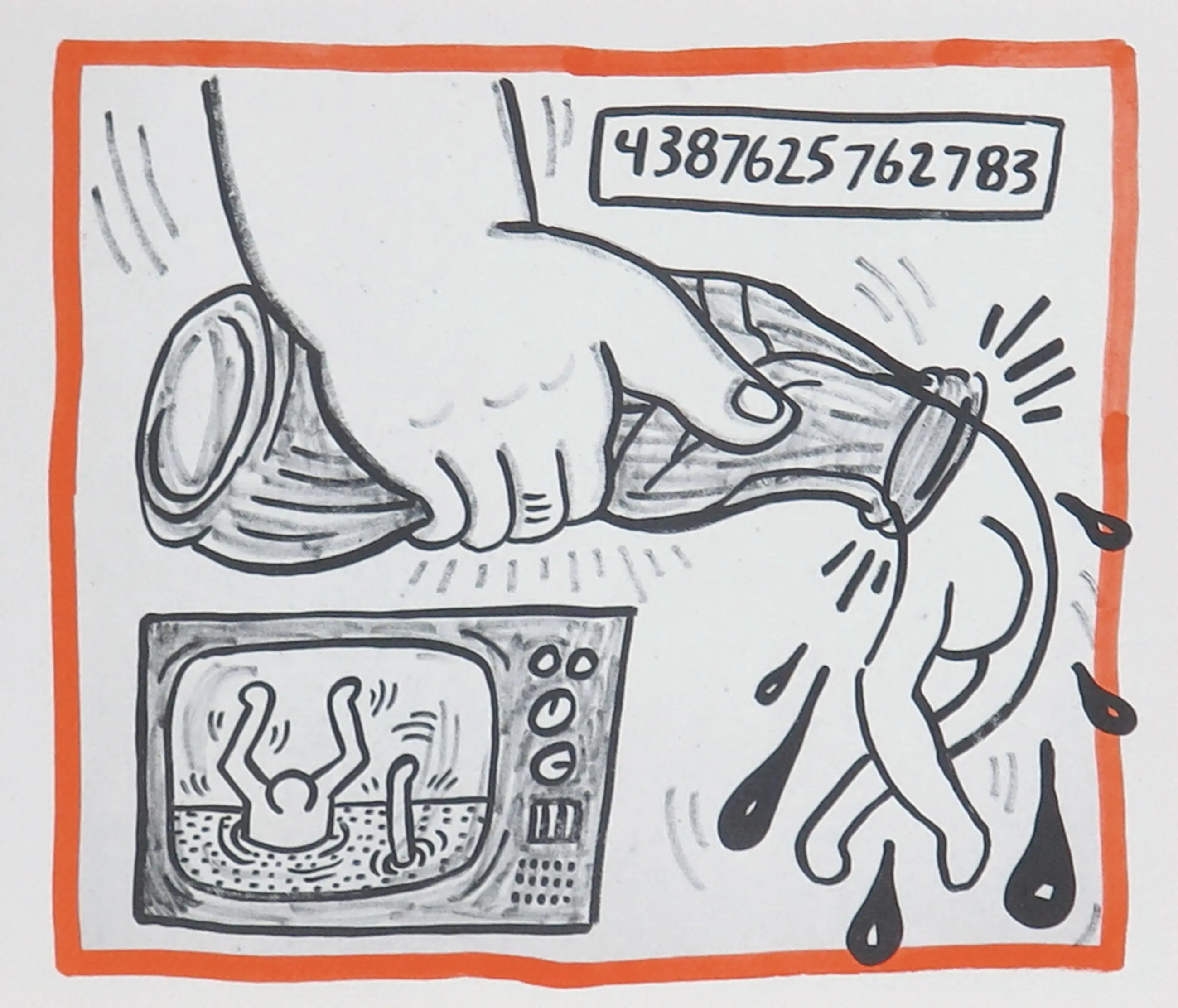 Litho uit het portoflio Against all odds. Het portfolio zou door Haring gesigneerd worden, maar zijn plotselinge dood heeft dit verhinderd. Daarom zijn de litho's uit deze serie verso in potlood genummerd (411/500), en gestempeld met Haring's handtekening.