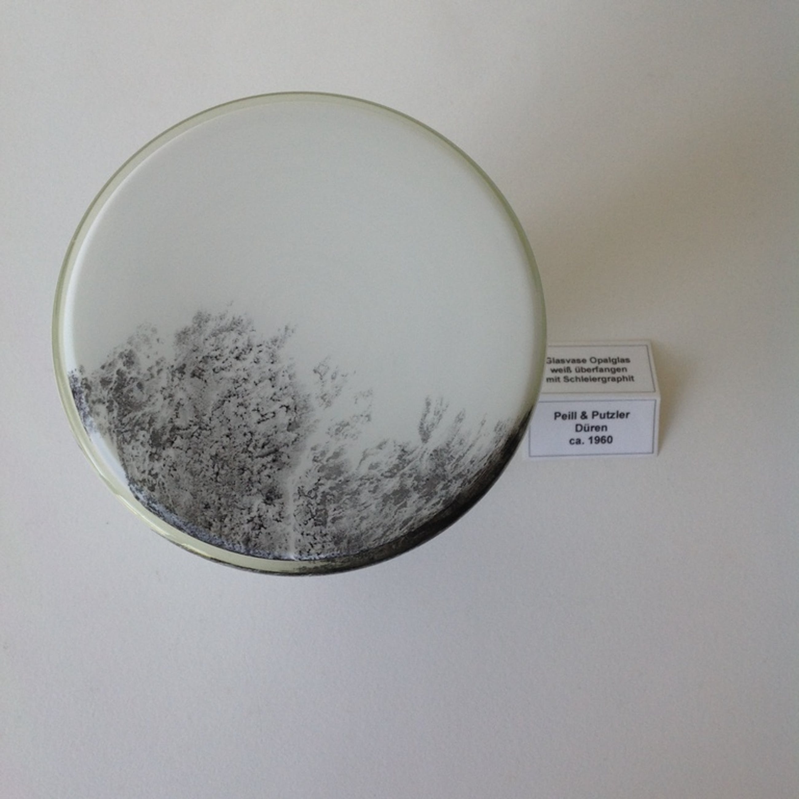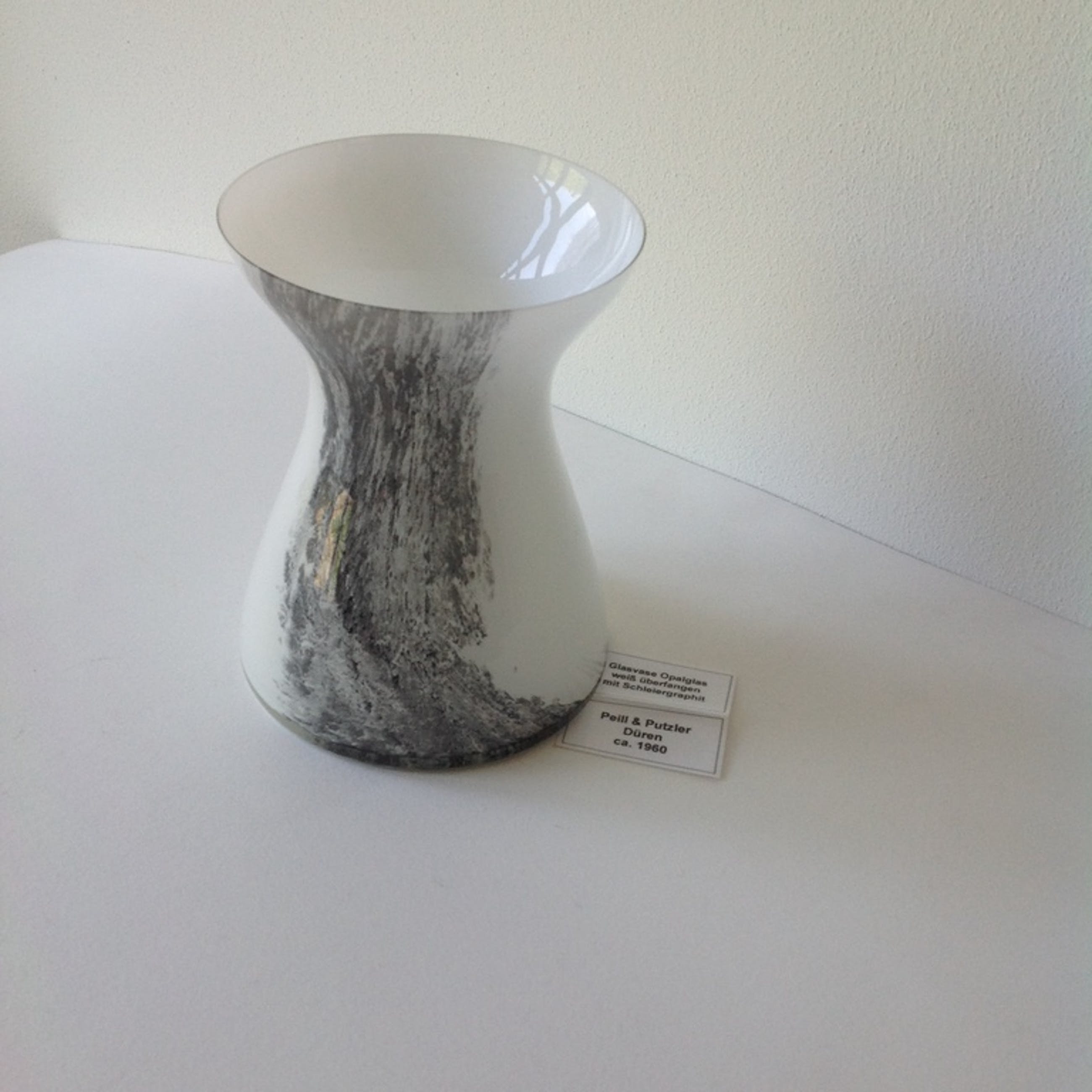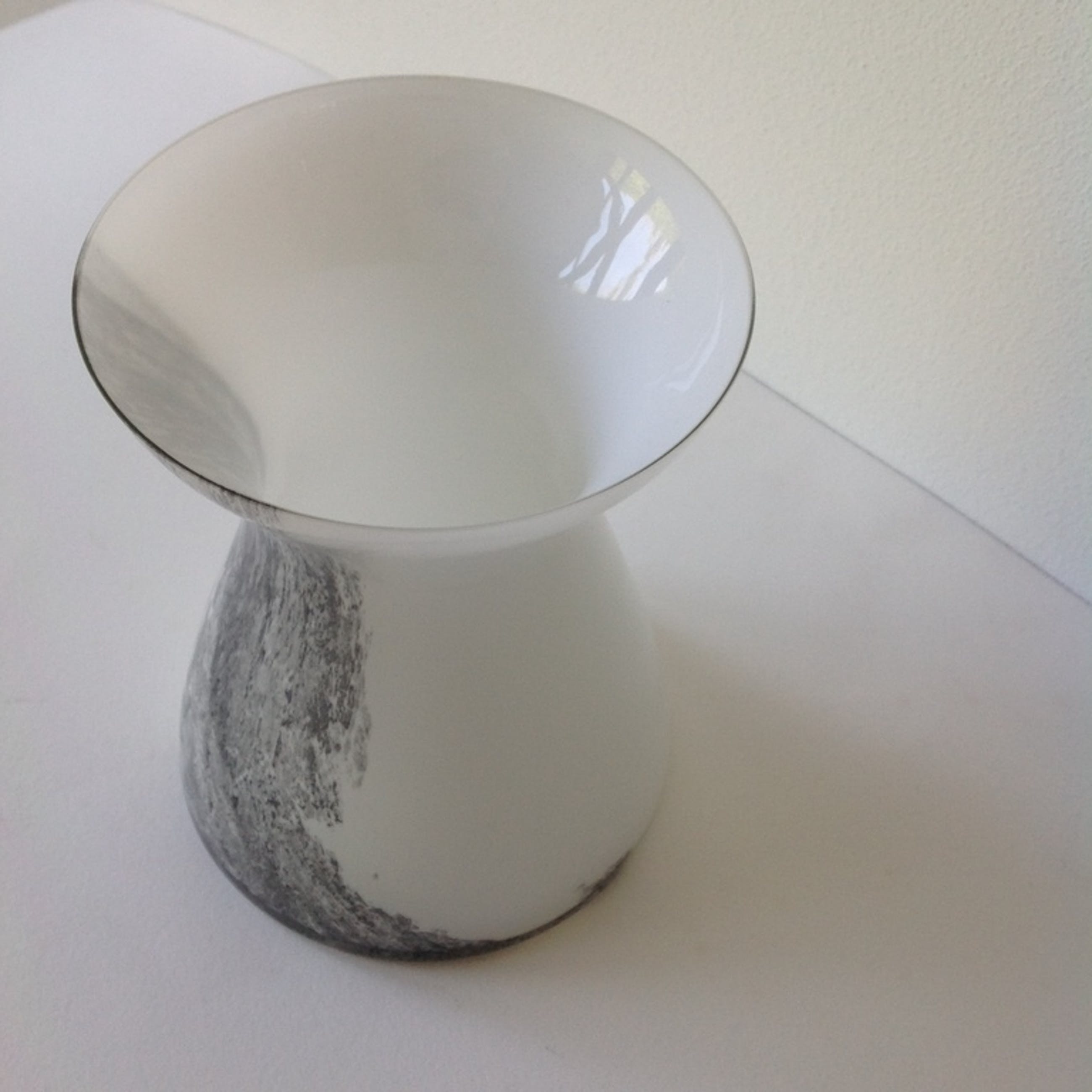 Wit Opaalglas met sluier grafiet. Hoogte 17 cm. Diameter boven en onder 13 cm. In uitstekende conditie.