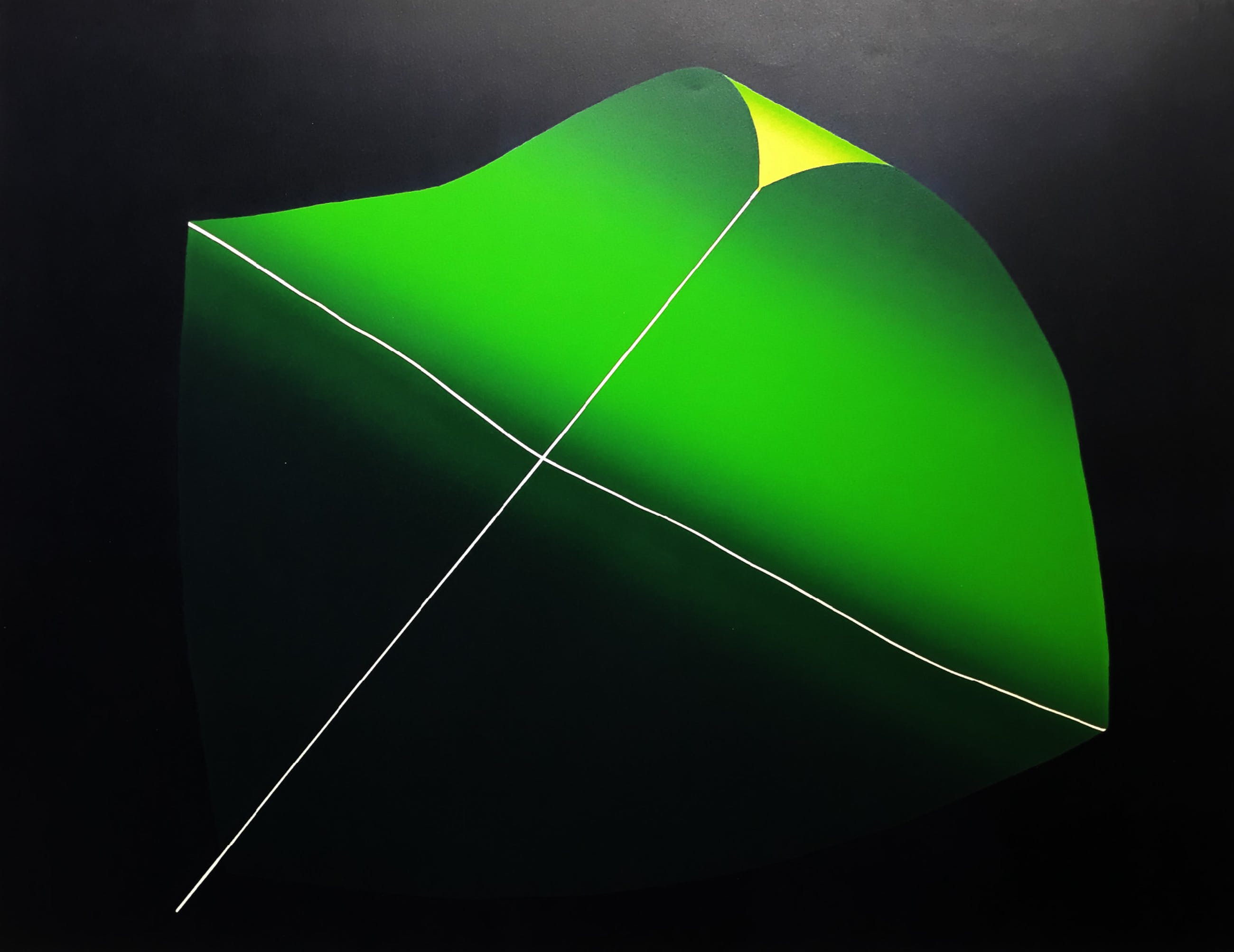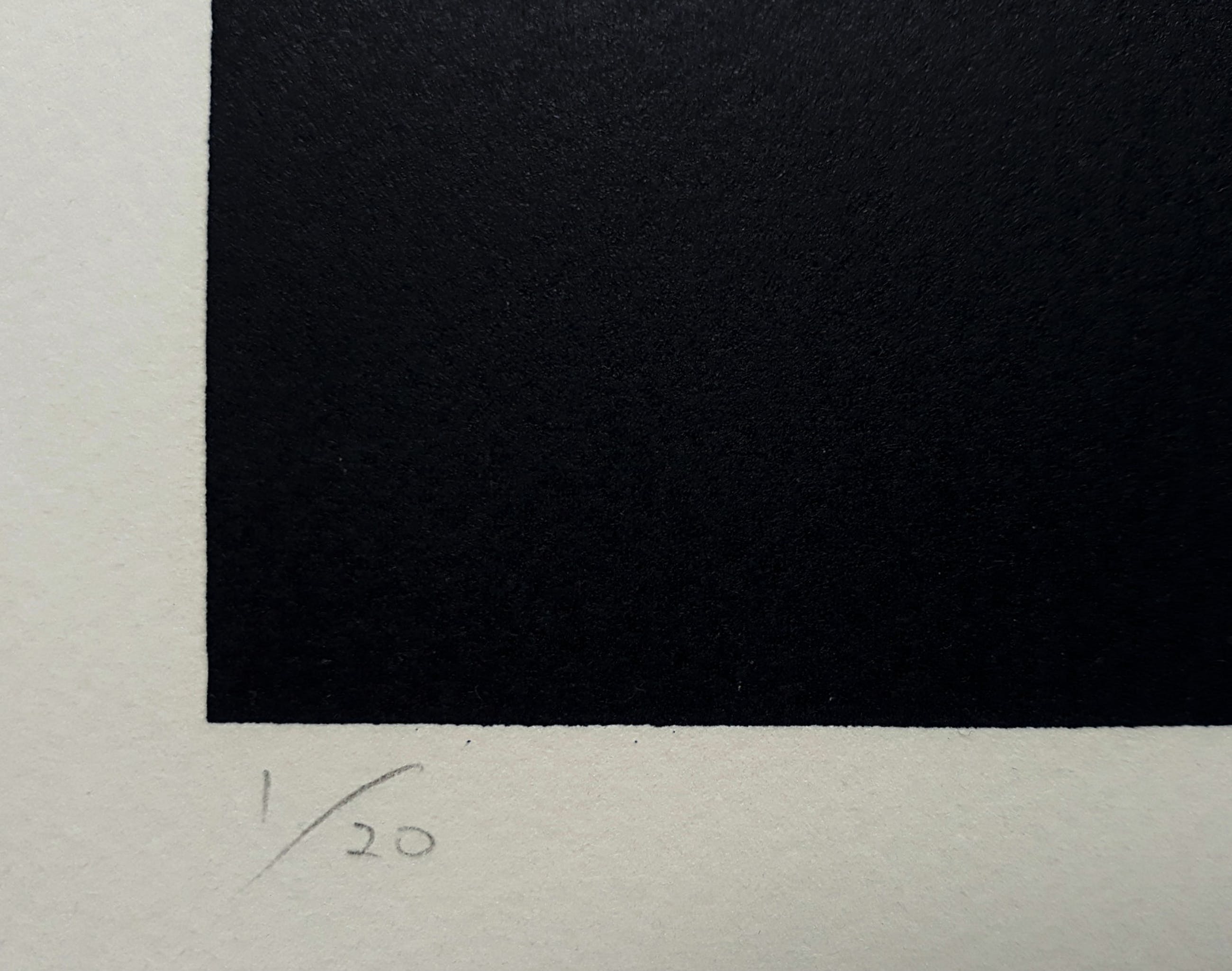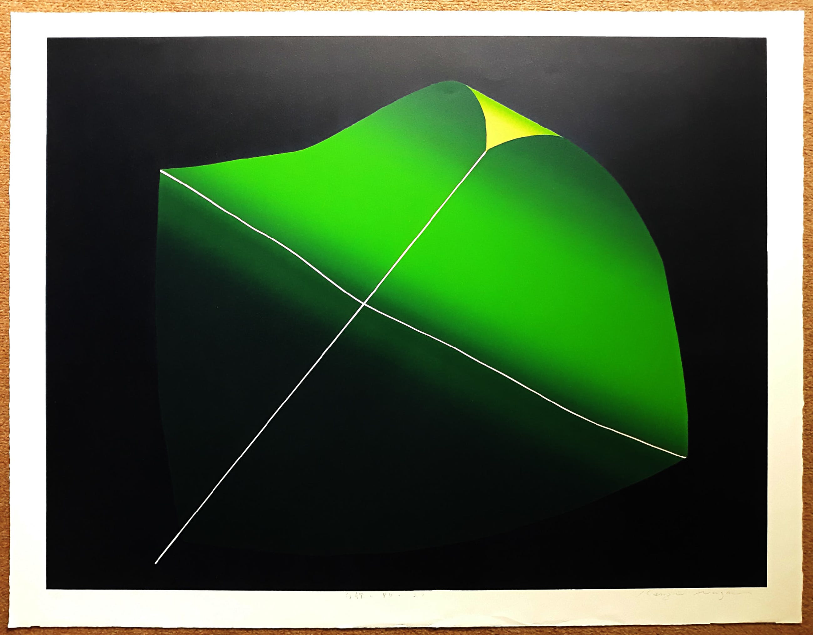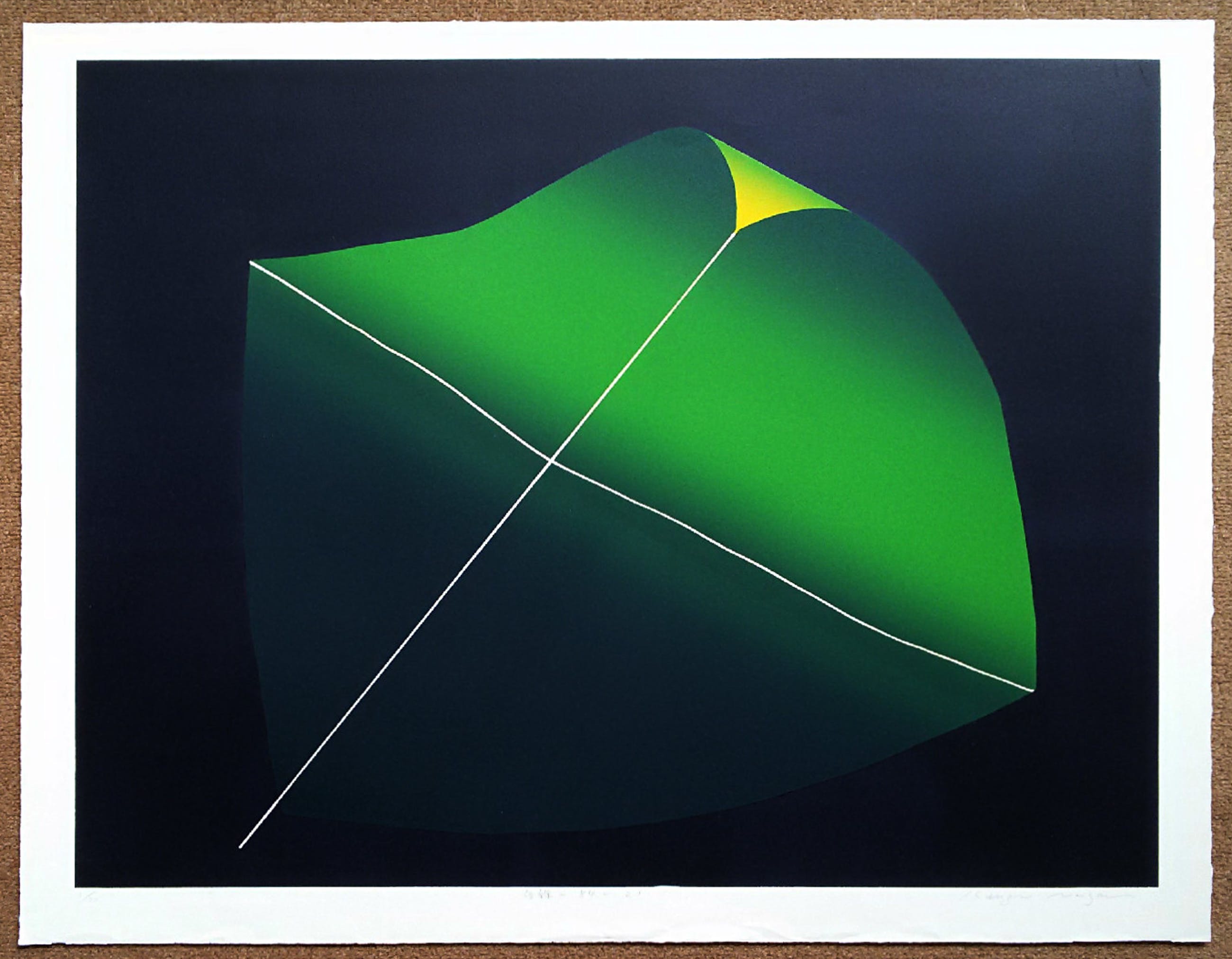Zeer mooi, superstrak werk van de Japanse kunstenaar Kenji Nagai. Zeefdruk op Arches papier, met potlood gesigneerd, getiteld in het japans, gedateerd (84) en genummerd (1/20). In zeer goede conditie, alleen wat kreukjes helemaal onderin aan de rand van de witte marge.