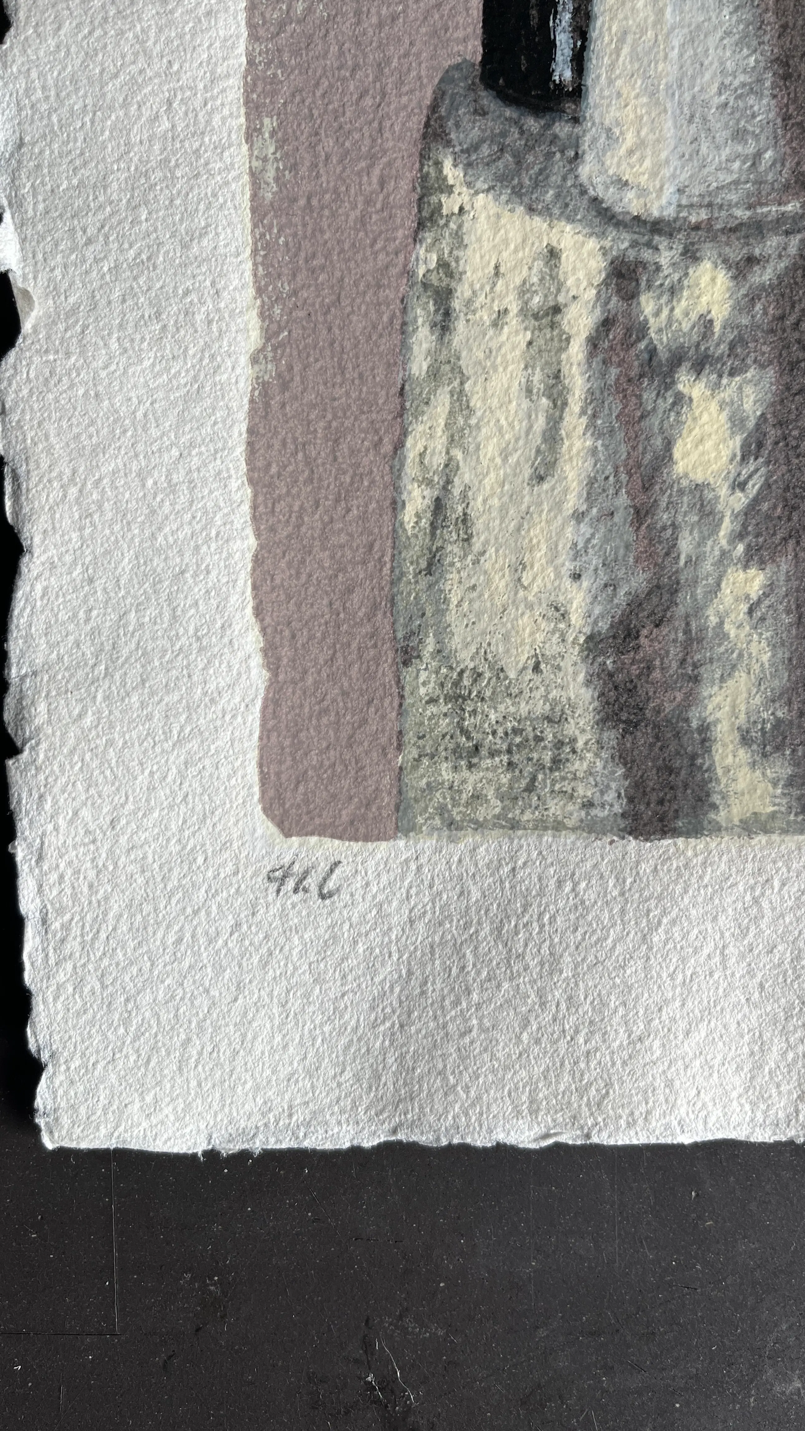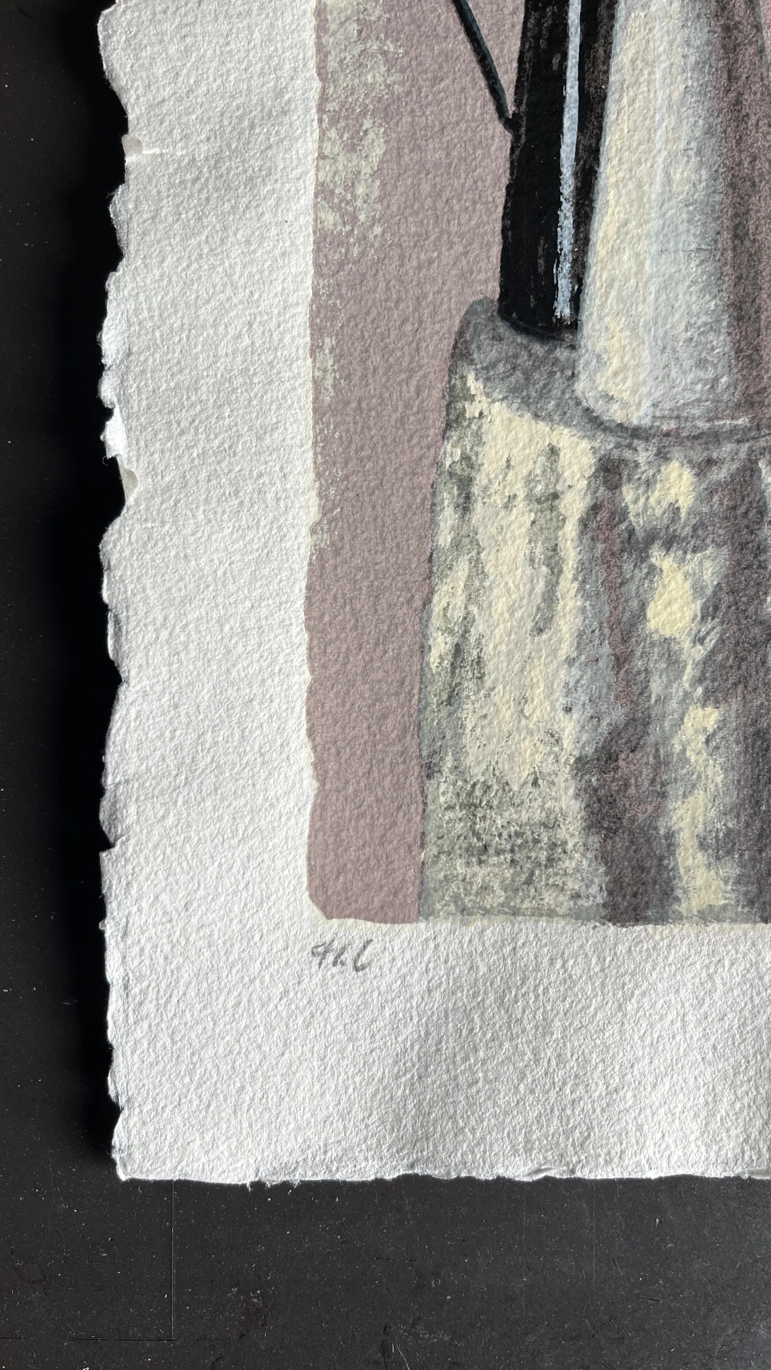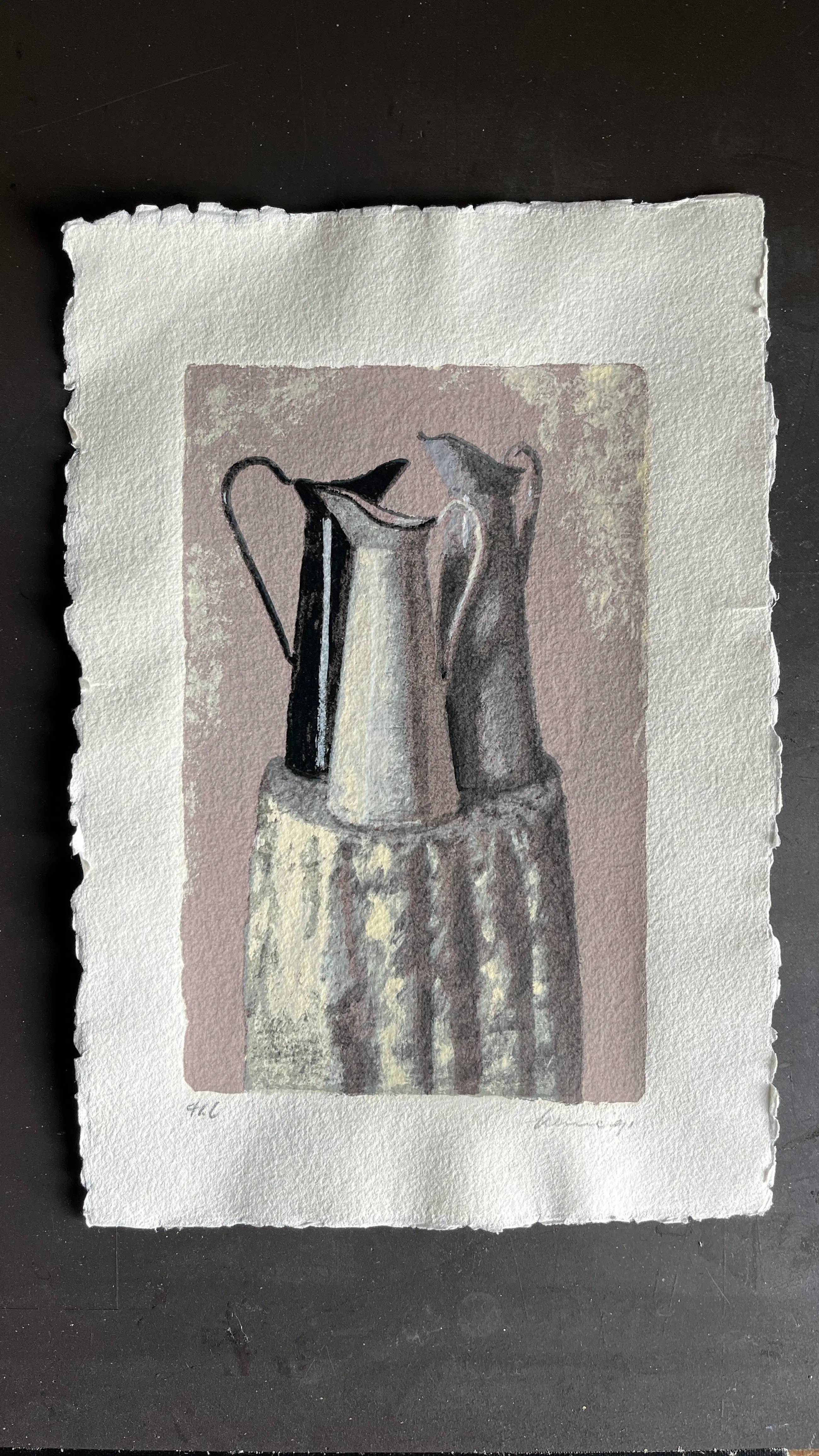 Kenne Grégoire (geboren in 1951 in Teteringen). Techniek: Zeefdruk op handgeschept papier met ongelijkmatige randen. Oplage: Het nummer linksonder (bijv. "4/L" of vergelijkbaar) geeft aan dat dit een genummerd exemplaar is uit een beperkte oplage. De handtekening van de kunstenaar staat rechtsonder. Stijl: Zijn werk wordt vaak geassocieerd met het Nieuw Realisme, waarbij hij alledaagse objecten met veel detail en een verstilde sfeer weergeeft