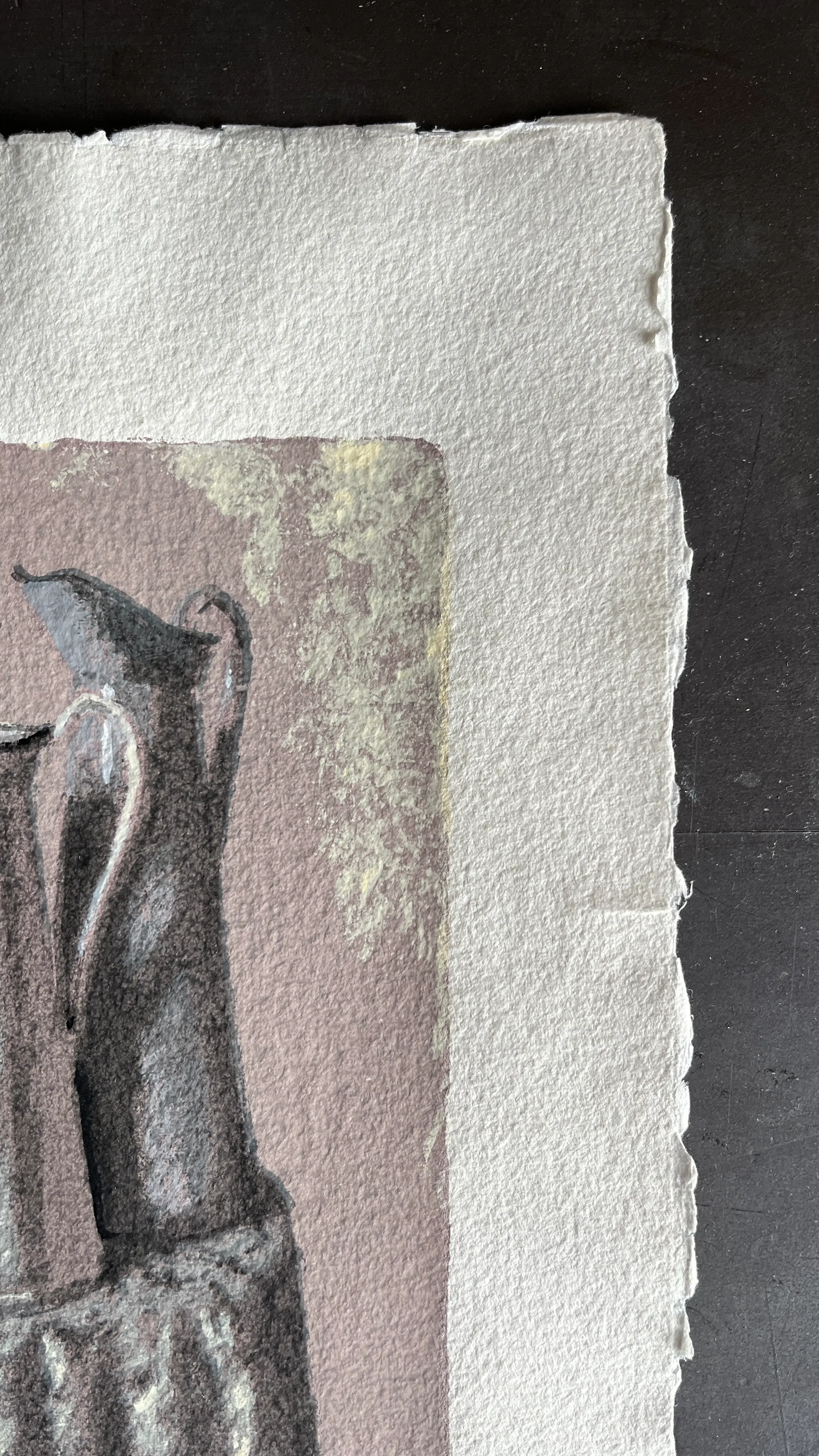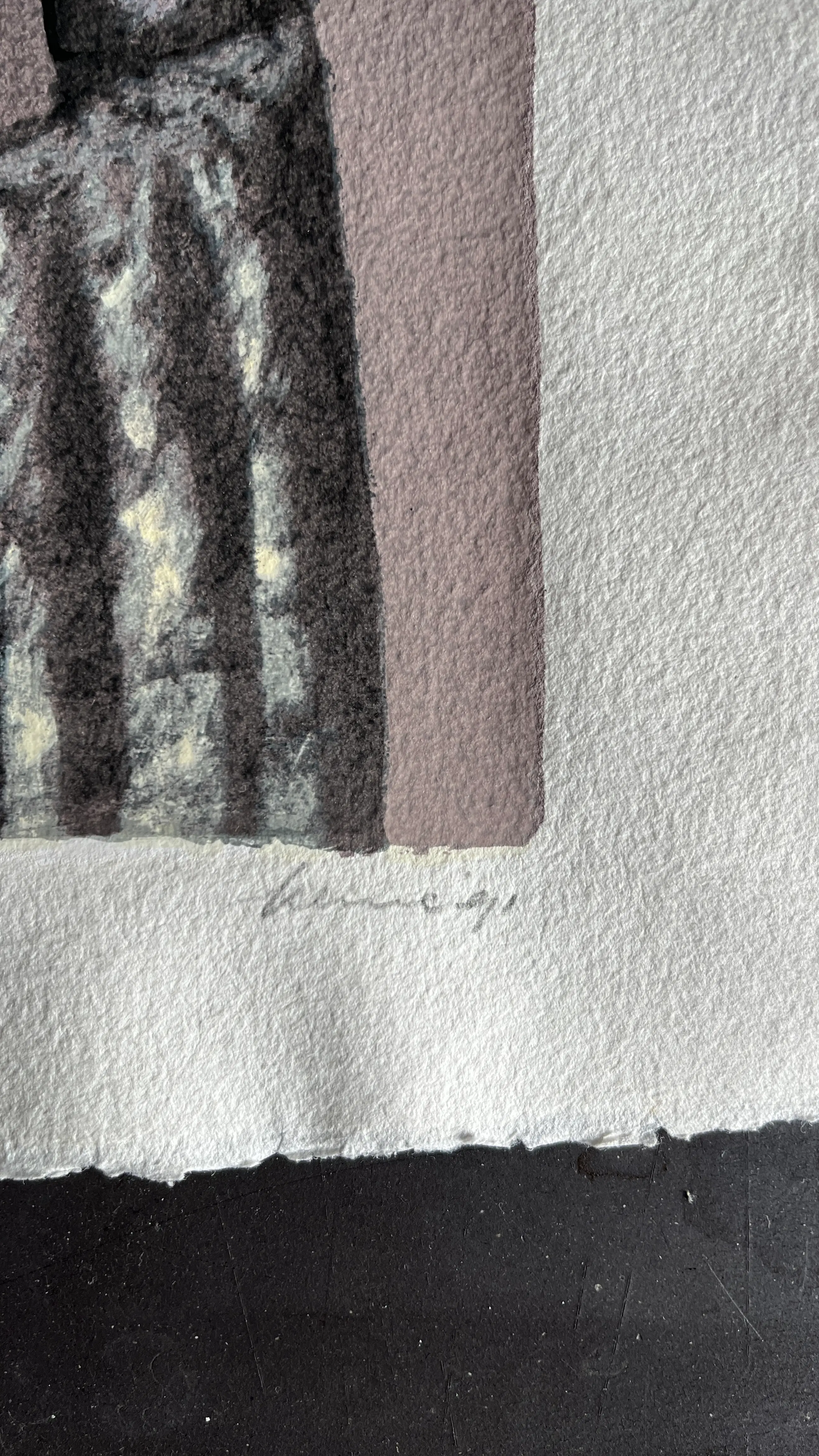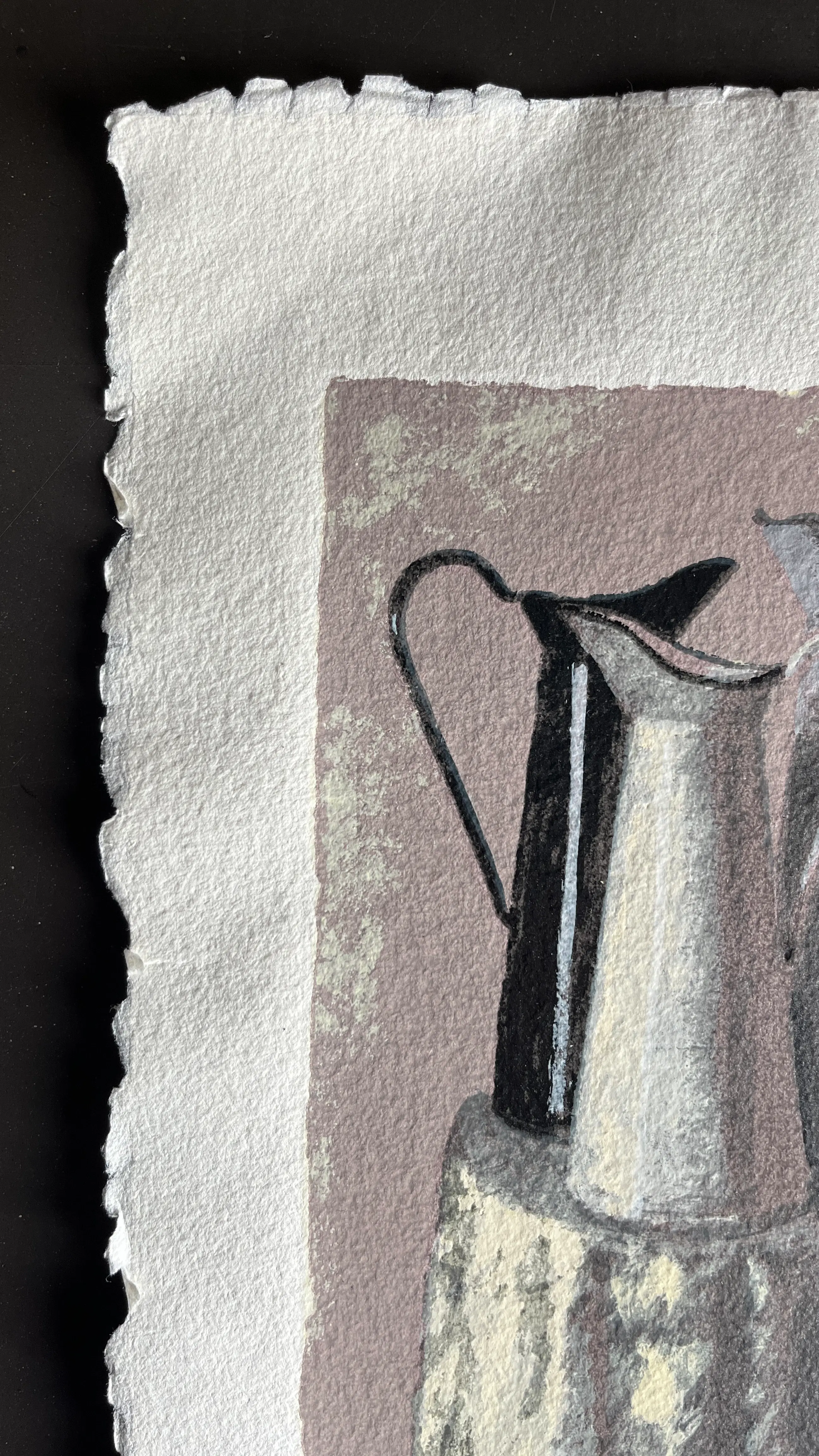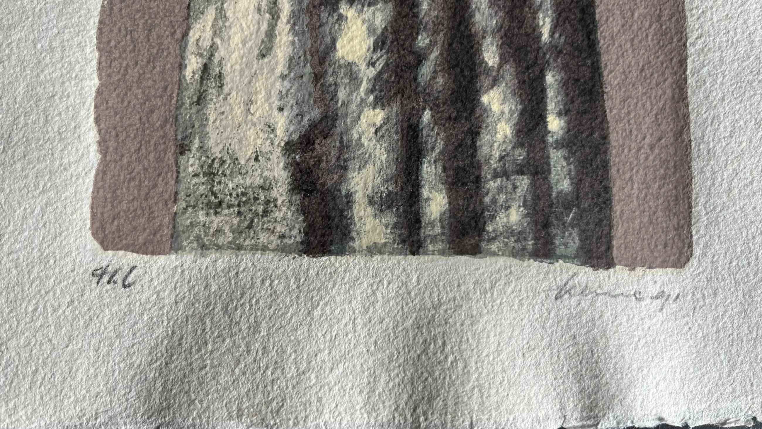 Kenne Grégoire (geboren in 1951 in Teteringen). Techniek: Zeefdruk op handgeschept papier met ongelijkmatige randen. Oplage: Het nummer linksonder (bijv. "4/L" of vergelijkbaar) geeft aan dat dit een genummerd exemplaar is uit een beperkte oplage. De handtekening van de kunstenaar staat rechtsonder. Stijl: Zijn werk wordt vaak geassocieerd met het Nieuw Realisme, waarbij hij alledaagse objecten met veel detail en een verstilde sfeer weergeeft