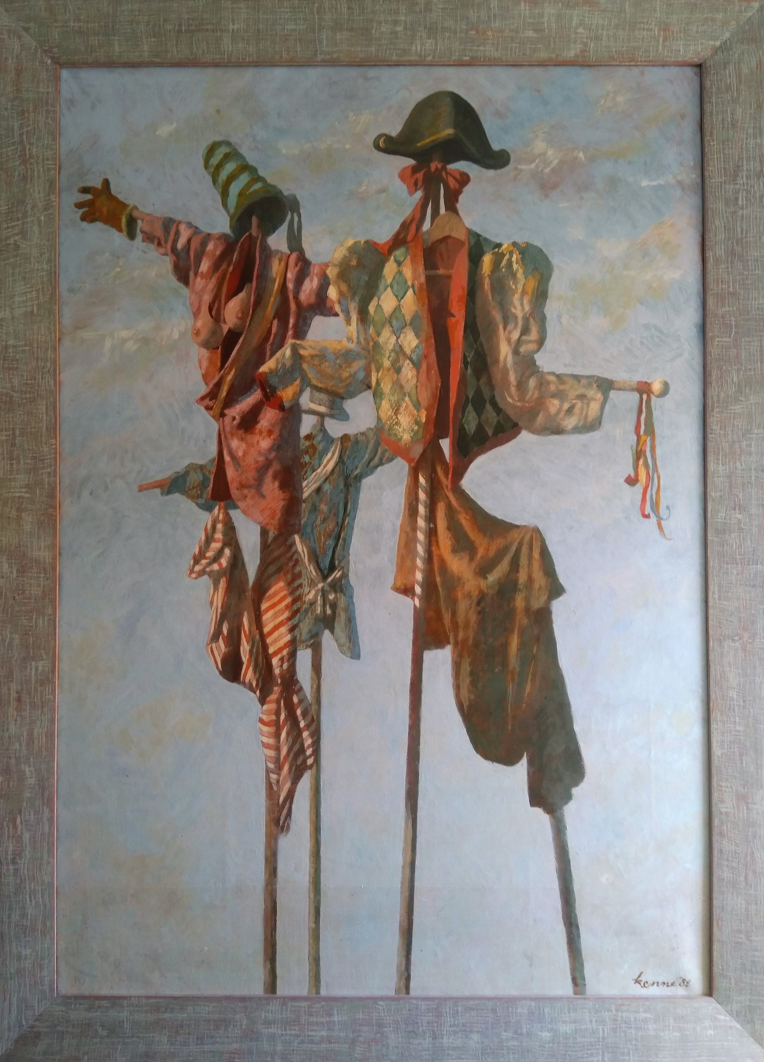 Voorstellend: Een bonte verzameling circus/revue/toneel figuren uitgebeeld dmv enkel kledingstukken en kostuums.