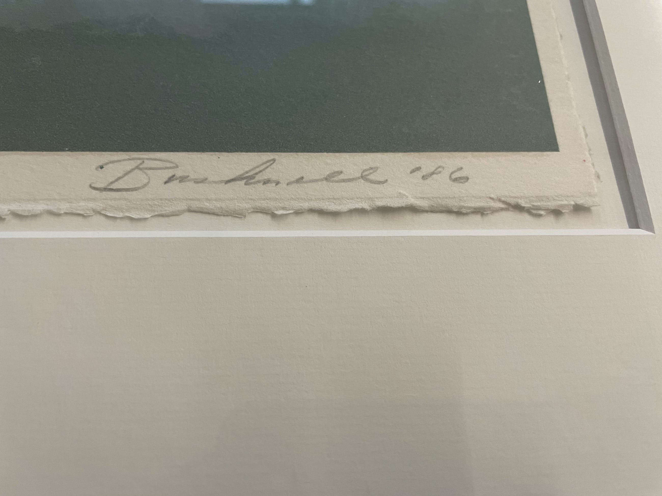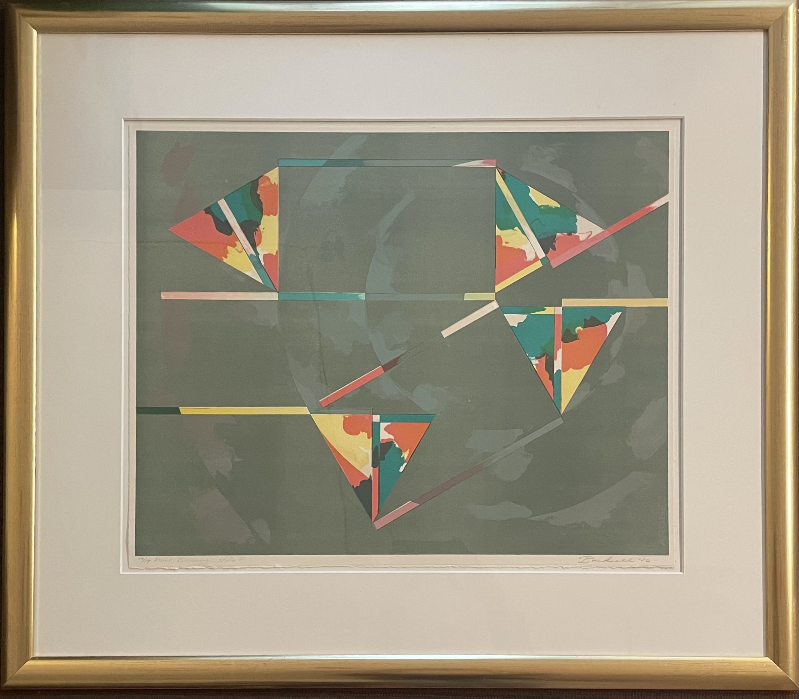 Kenneth Bushnell (Los Angeles 1933) Point Balance Stake 1 Zeefdruk, oplage 19/19 gesigneerd en gedateerd 1986 Bushnell studeerden Los Angeles en Hawaii en geniet internationaal bekendheid door zijn schilderijen en aquarellen in abstracte trant. De afgelopen twintig jaar is zijn werk bekend onder de verzamelnaam EDC, Euclidian Dream Cycle, gebaseerd op de tegenstelling tussen de westerse ratio van de Griekse wiskundige Euclides en de “droom” die het irrationele in ruime en tijd en intuïtieve keuzes vertegenwoordigt. Parallel aan zijn abstracte werkt maakt Bushnell figuratieve schilderijen, tekeningen en grafiek met veelal botanische onderwerpen. Hij woont afwisselend in LA, Hawaii en Zuid-Frankrijk. | |||||||||