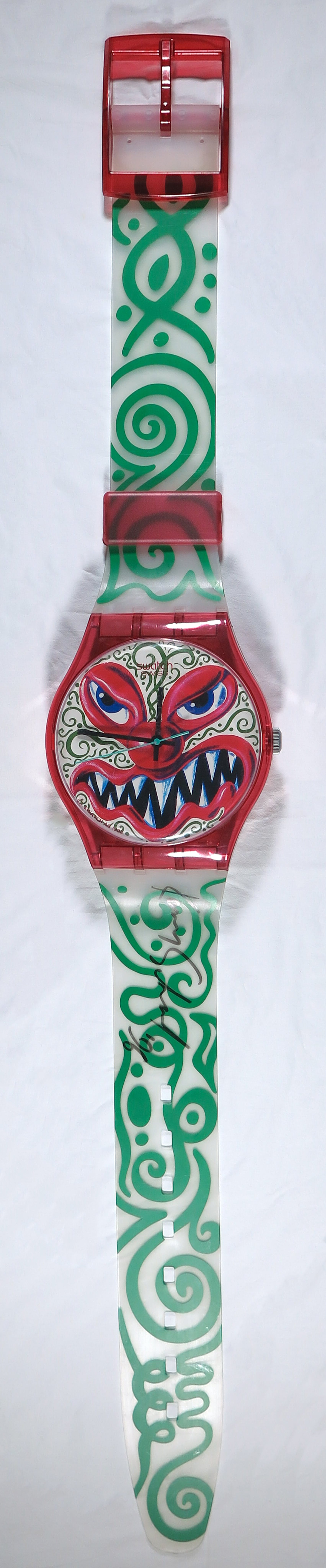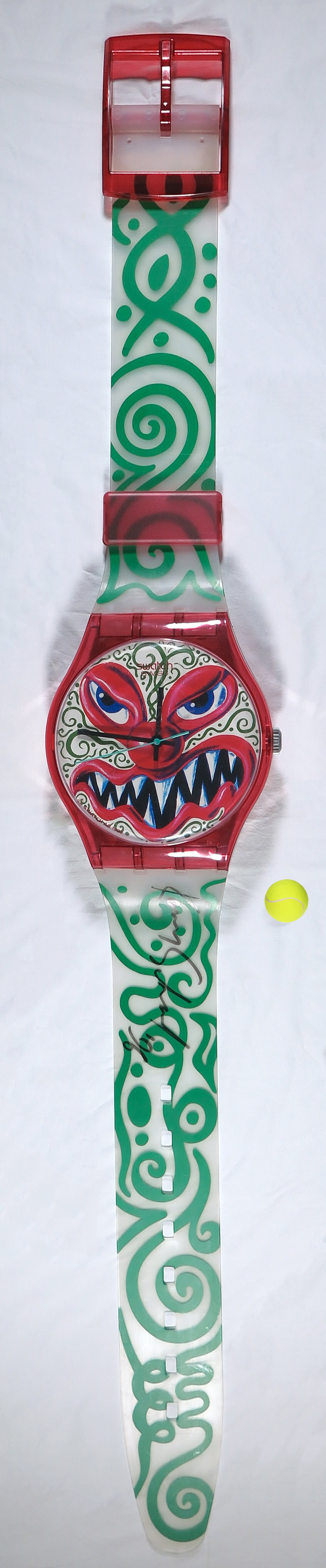 Het object, geproduceerd in 1993 met ontwerp van Kenny Scharf, is door Scharf in 1996 op de 'band' gesigneerd en gedateerd.