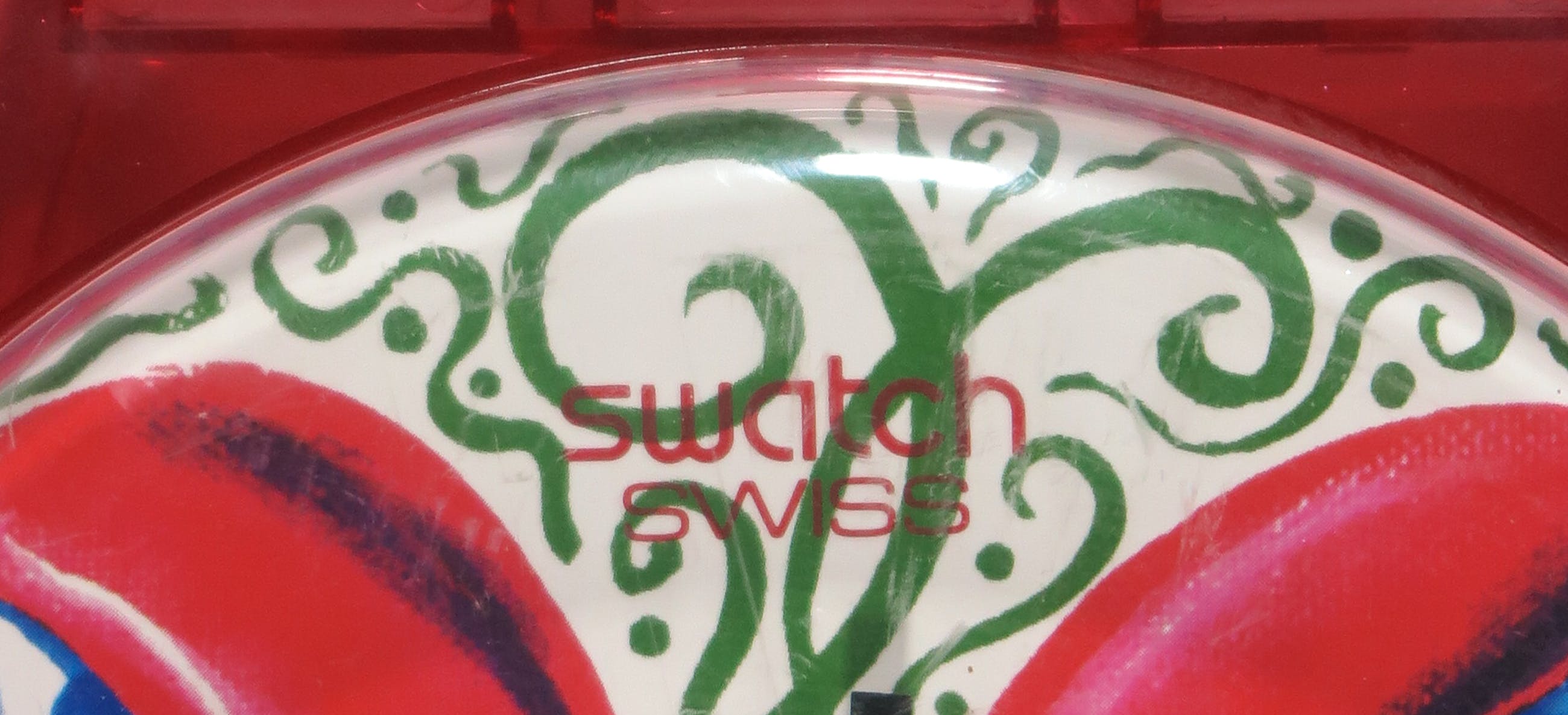Groot, oversized, horloge met uurwerk van Swatch. Naar het oorspronkelijke polsmodel.