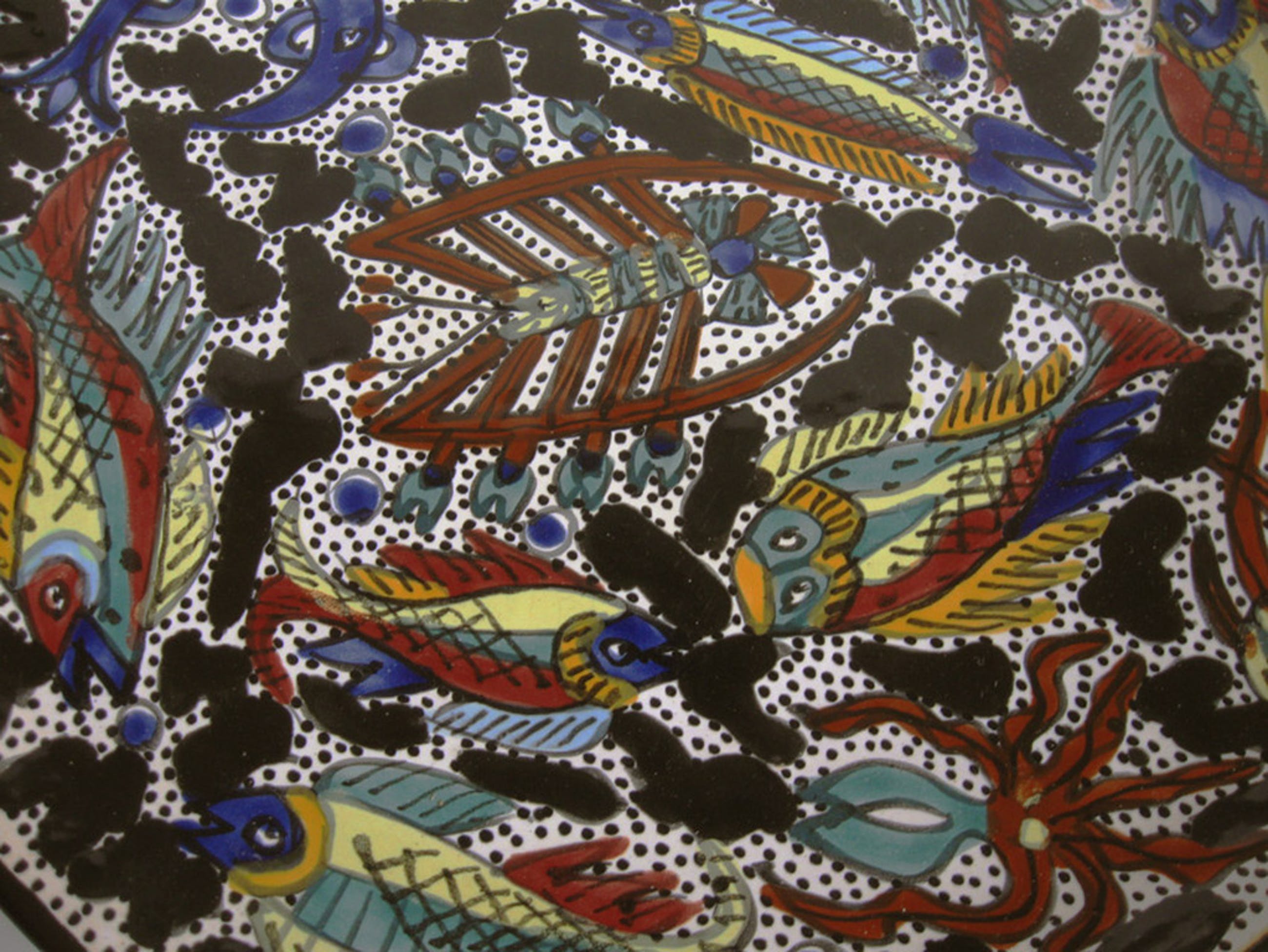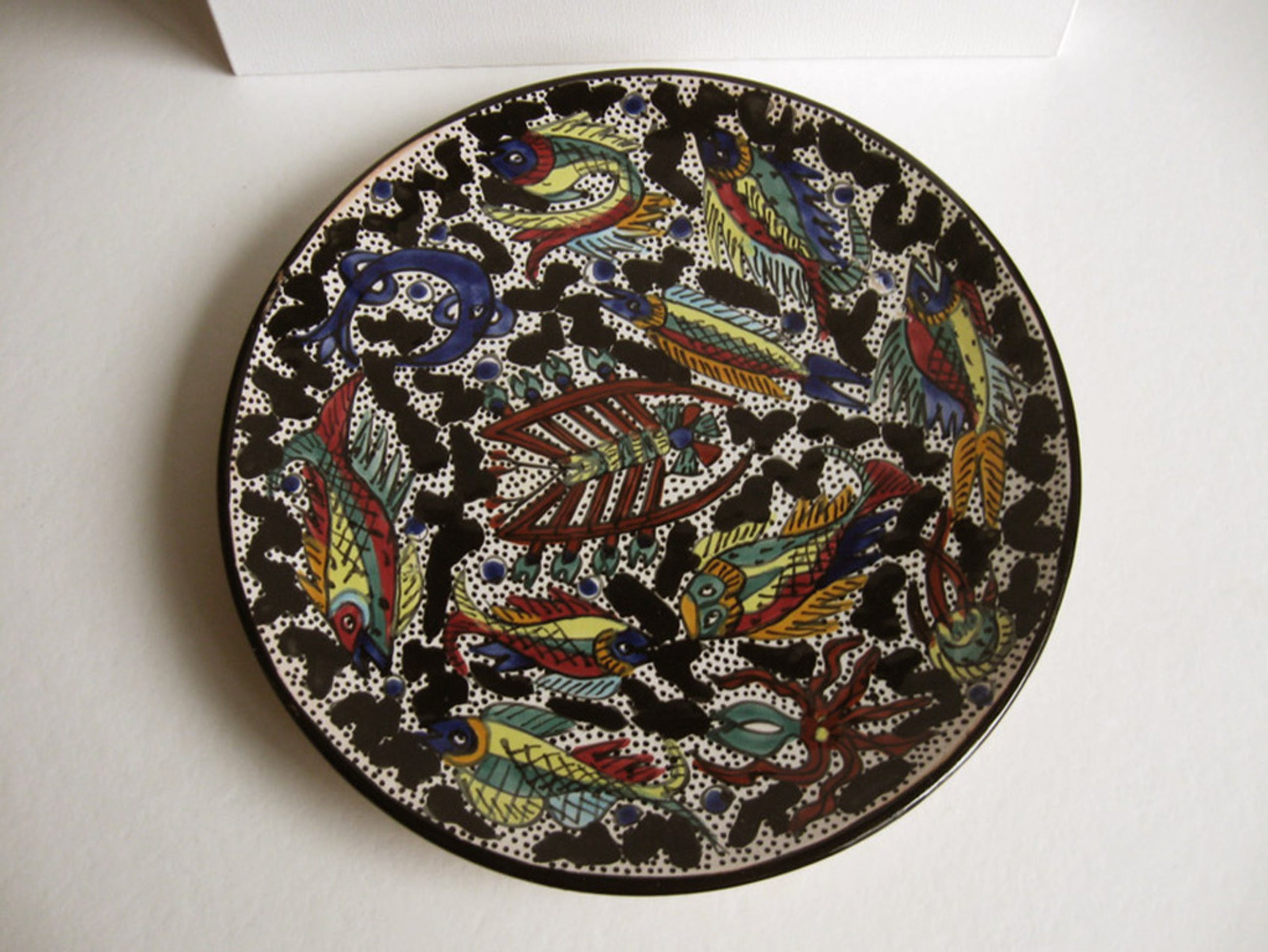 Keramiek: schaal met zeedieren motief, achterop gesigneerd. Afm: doorsnede 33 cm. Verzending NL 10,- Belgie 15,-
