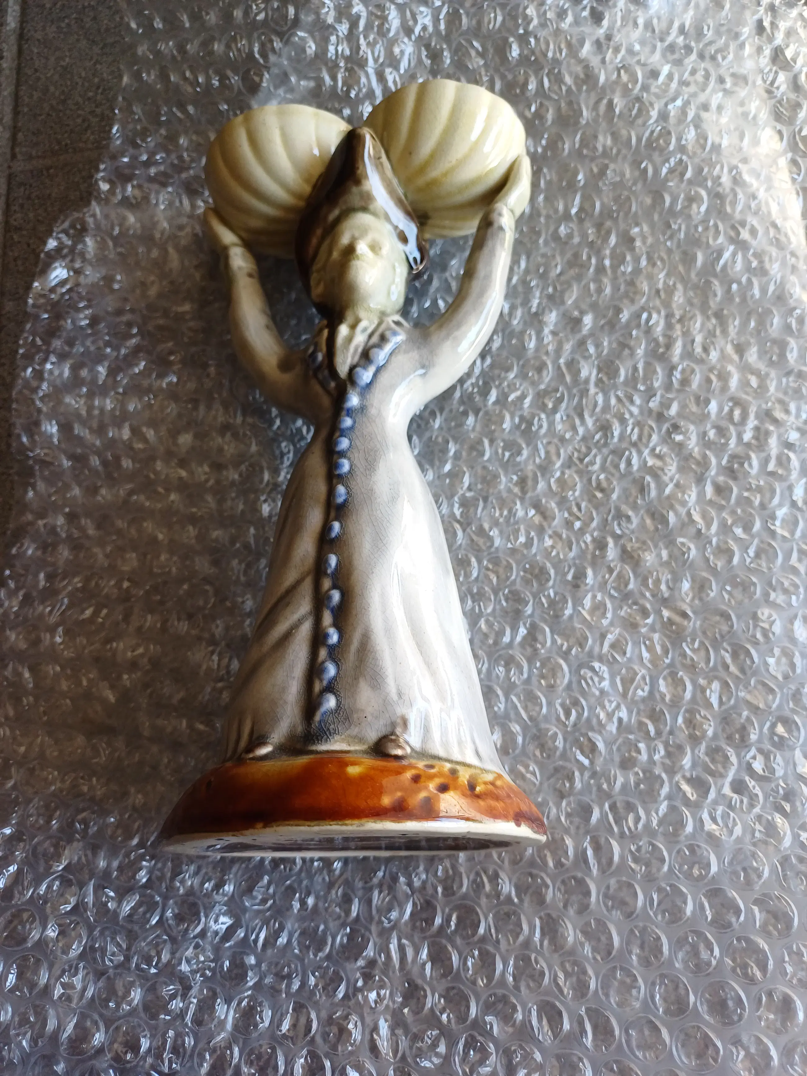 Beeldje uit 1868 - La Louvière ( volgens geschreven sticker die boven de stempel plakte). Beide kanten heel verschillend, zowel klederdracht als hoofd /(-deksel) , 2 vrouwen. Stempel Nimy.