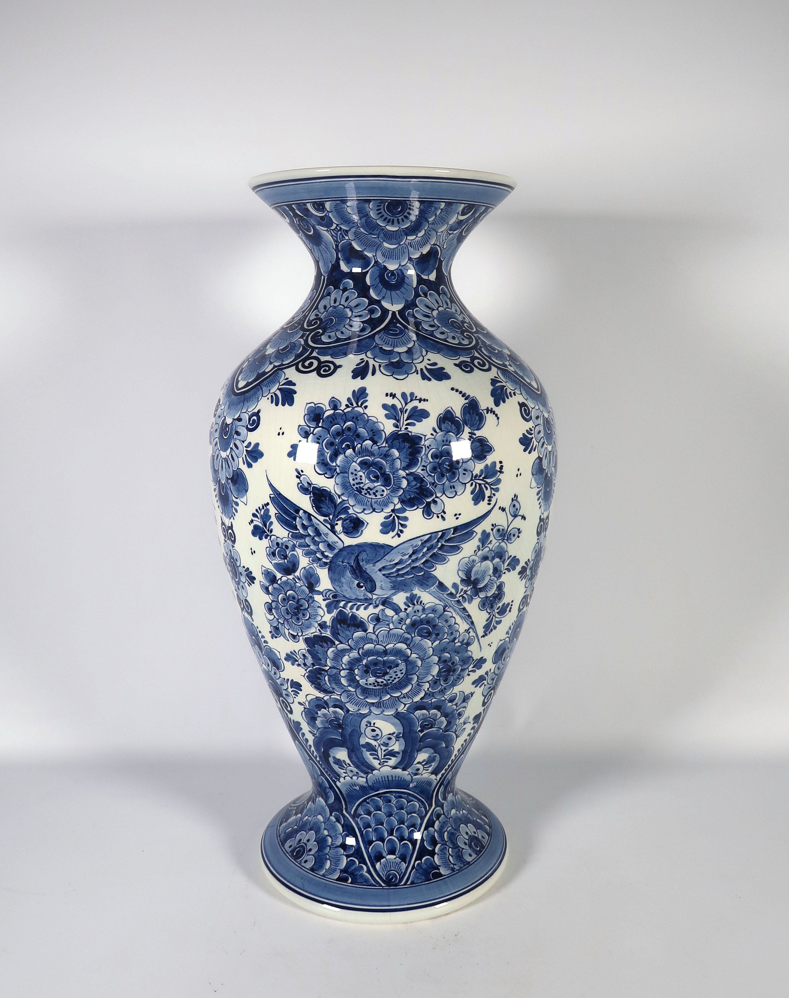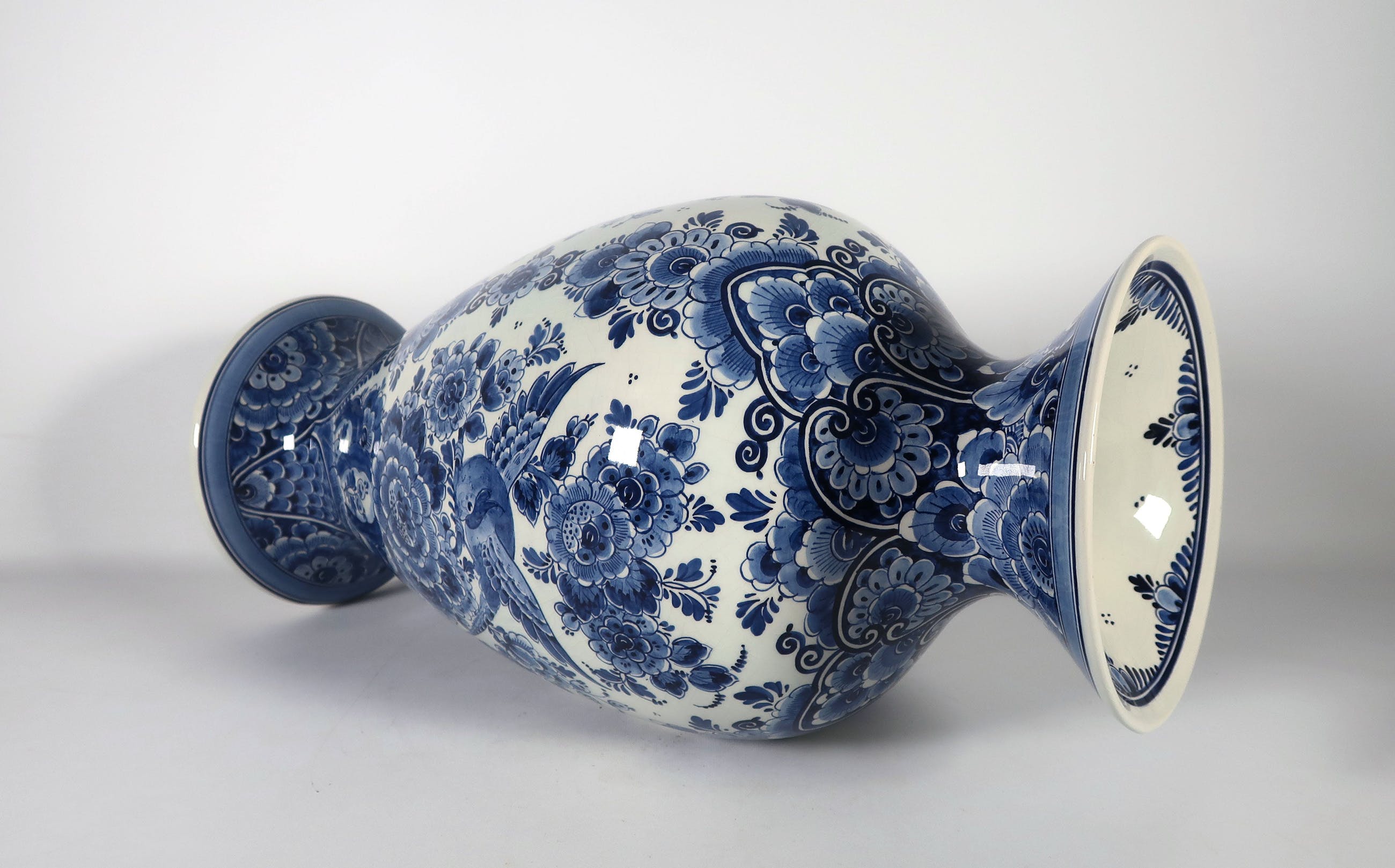 Grote monochroom geschilderde vaas, gedecoreerd met vogels en bloemen.