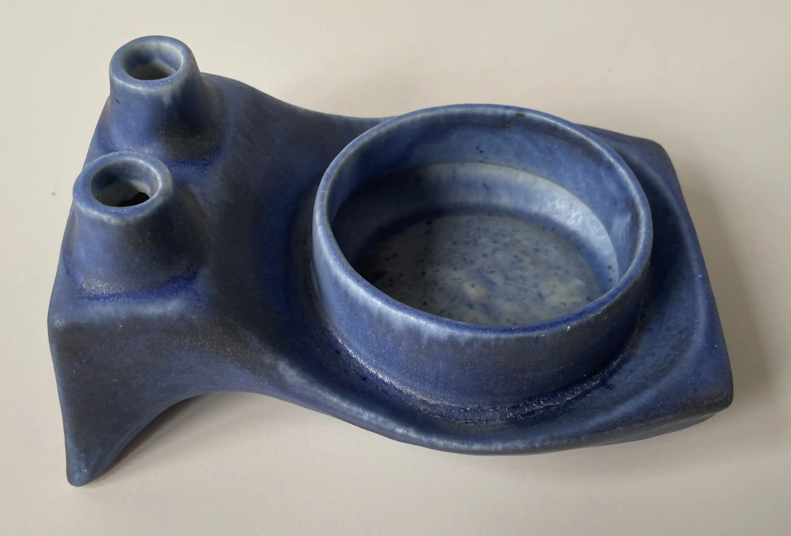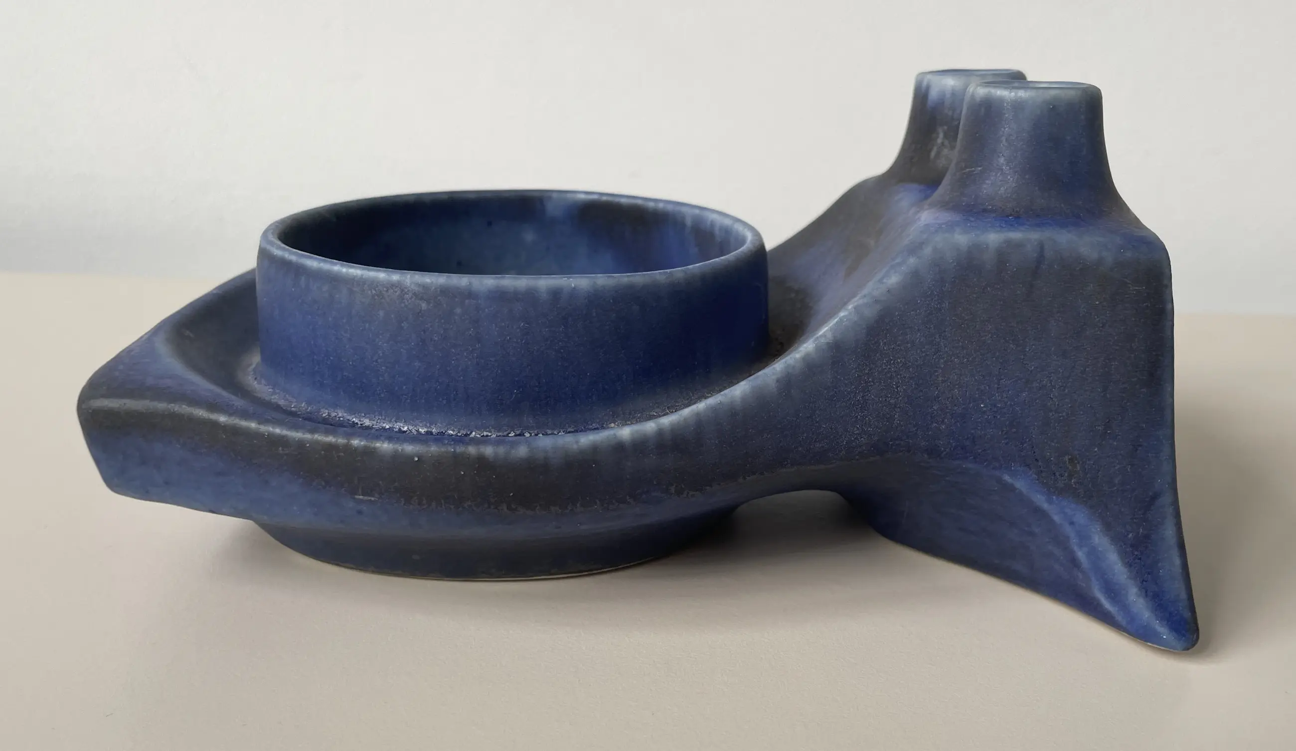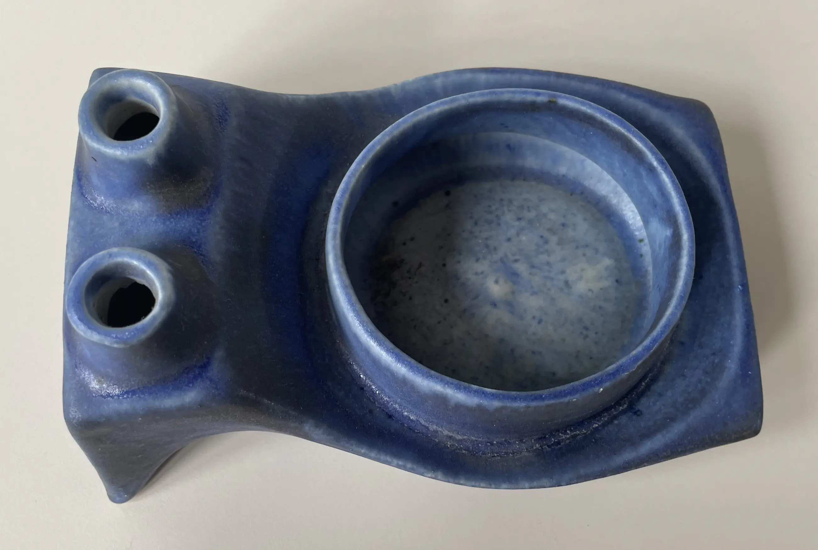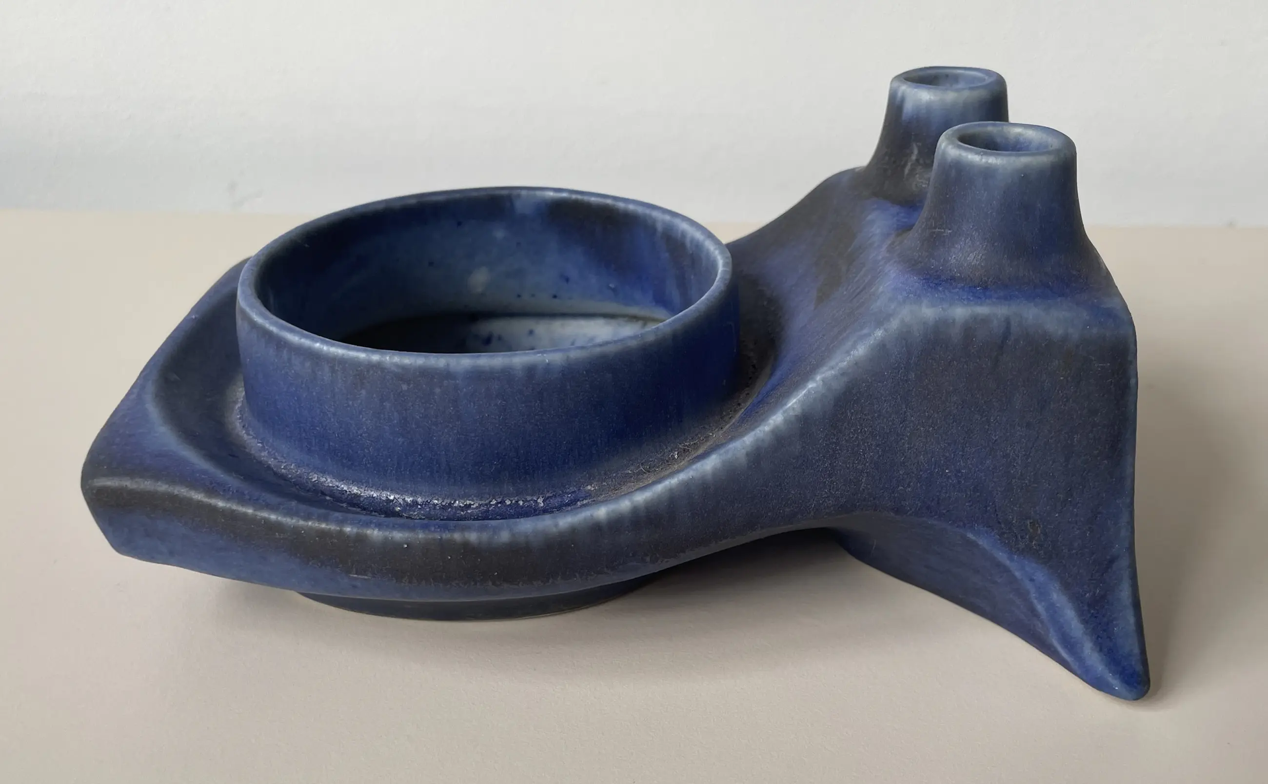 Brutalistisch keramische planter en duo solifleur vaas model B77 ontworpen door Matt Camps. Hij ontwierp de Loré stukken voor de Beesel fabriek van 1976-1981. Onderop gemerkt met B77. Gemaakt van witte klei met een decoratie van een laag blauw-antraciet glazuur met een donkerder glazuur langs de randen. De planter is 8,5 cm hoog, 16 cm diep en 12 cm breed.