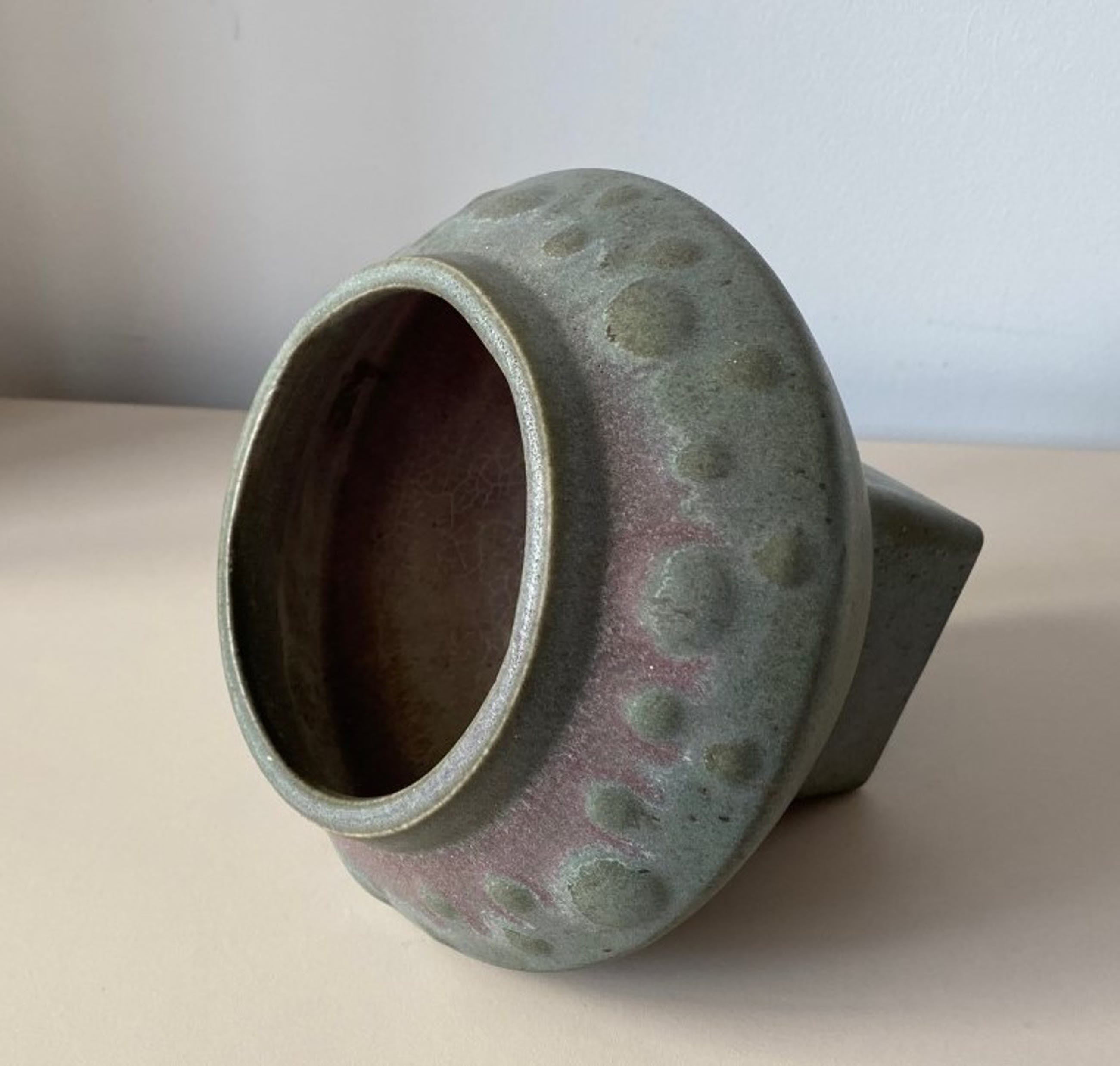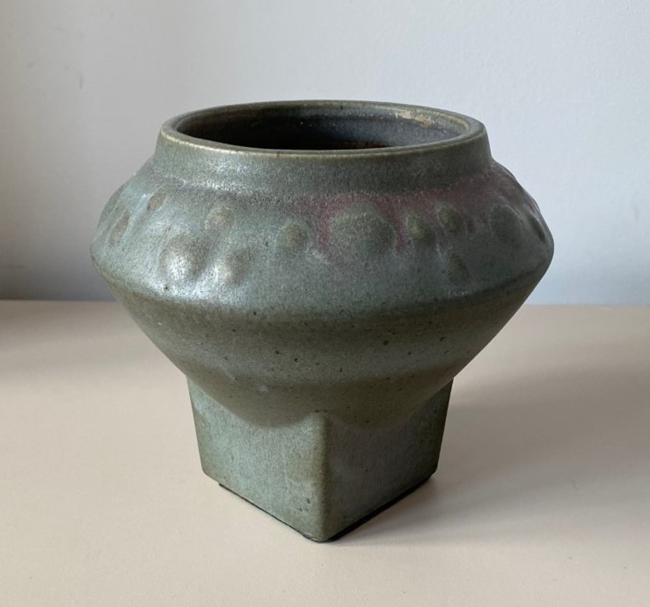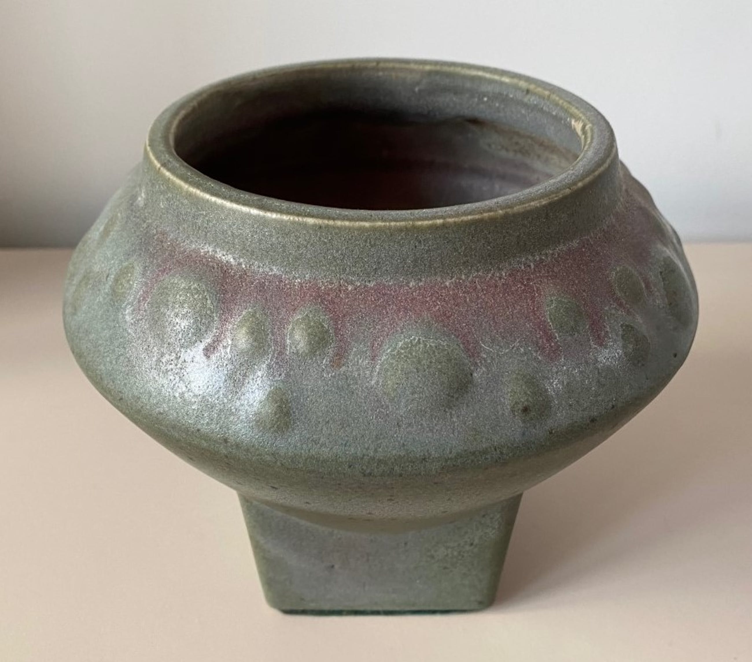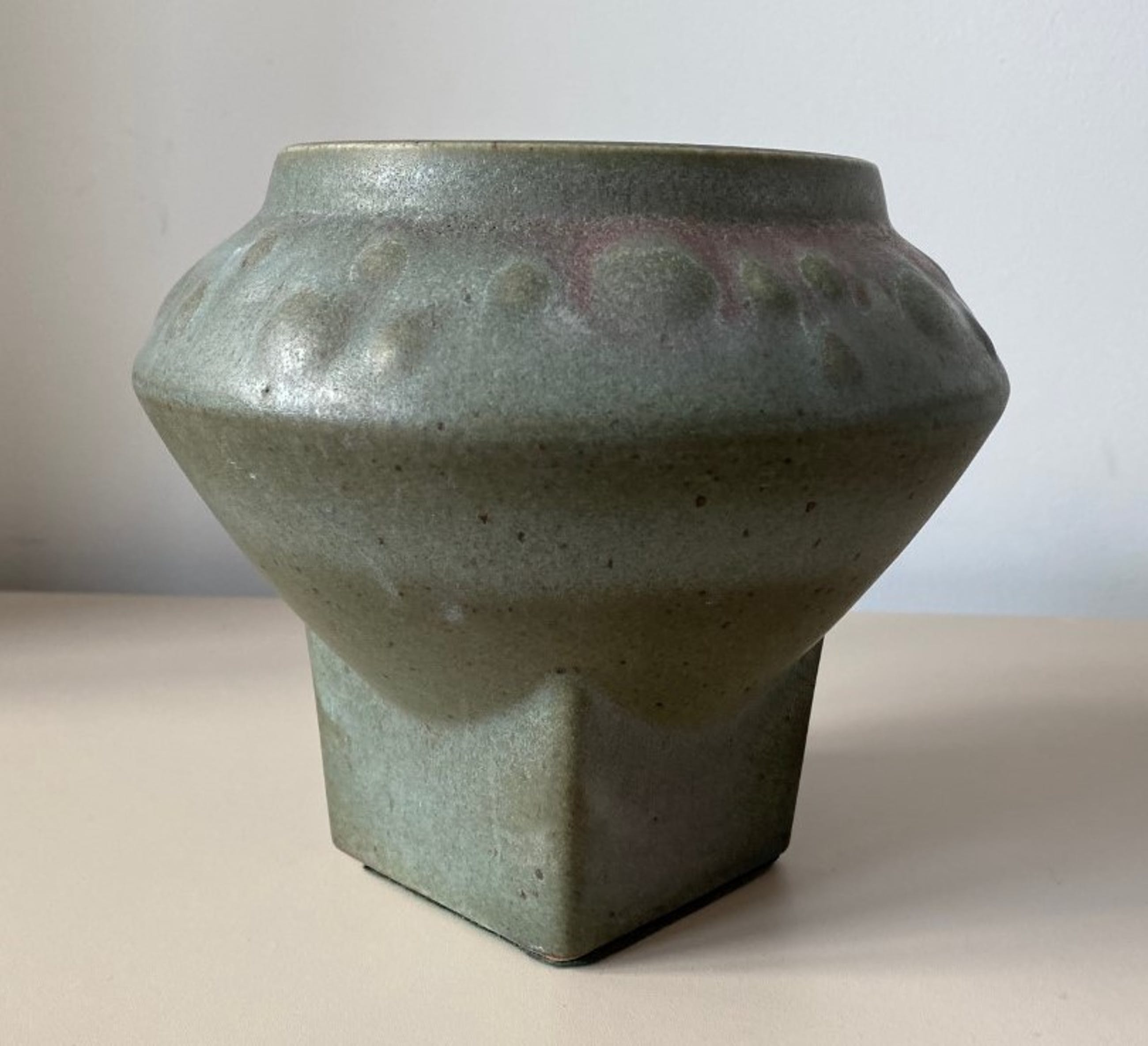 Zeldzame brutalistische vaas modelnr B150 ontwerp Matt Camps. De vaas heeft een soort UFO vorm op een vierkant en bollingen aan de bovenzijde, voorzien van mat grijs-groen en lila glazuur. In onbeschadigde conditie en aan de onderzijde gemerkt met modelnr B150.
