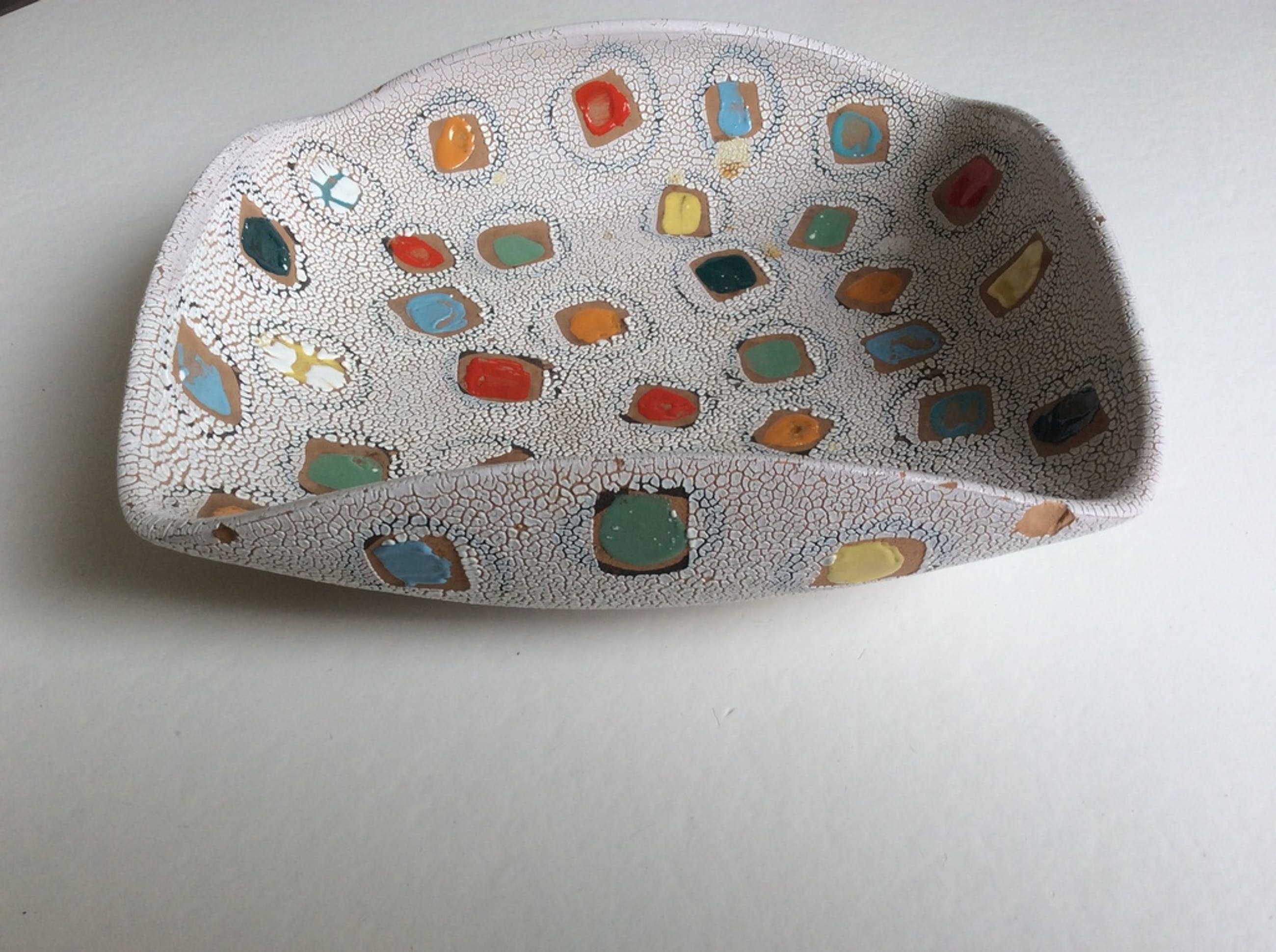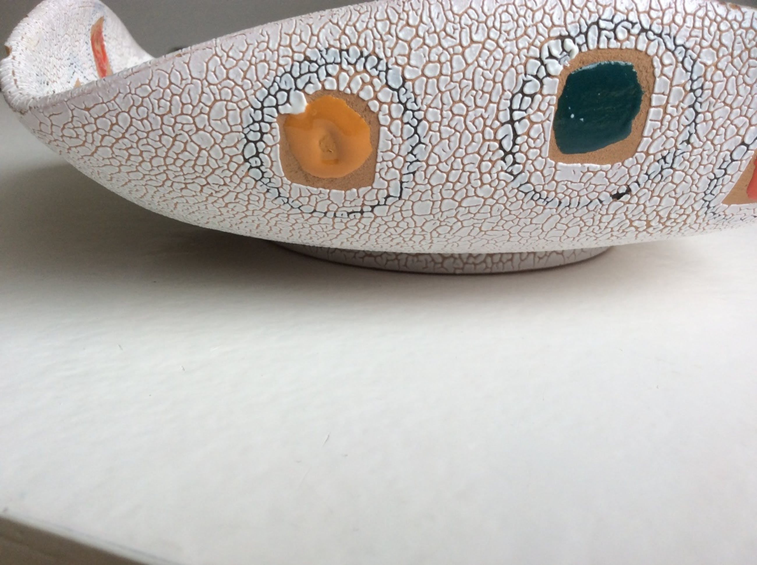 fraaie keramiek schaal, design met kleurige figuurtjes afgebakken met wit craquelure effect. Onderop waarschijnlijk gesigneerd, maar niet (meer) leesbaar vanwege verwerking. Vierkant met ronding naar boven toe, afm. 22 cm, hoogte ca. 7 cm. Goede conditie