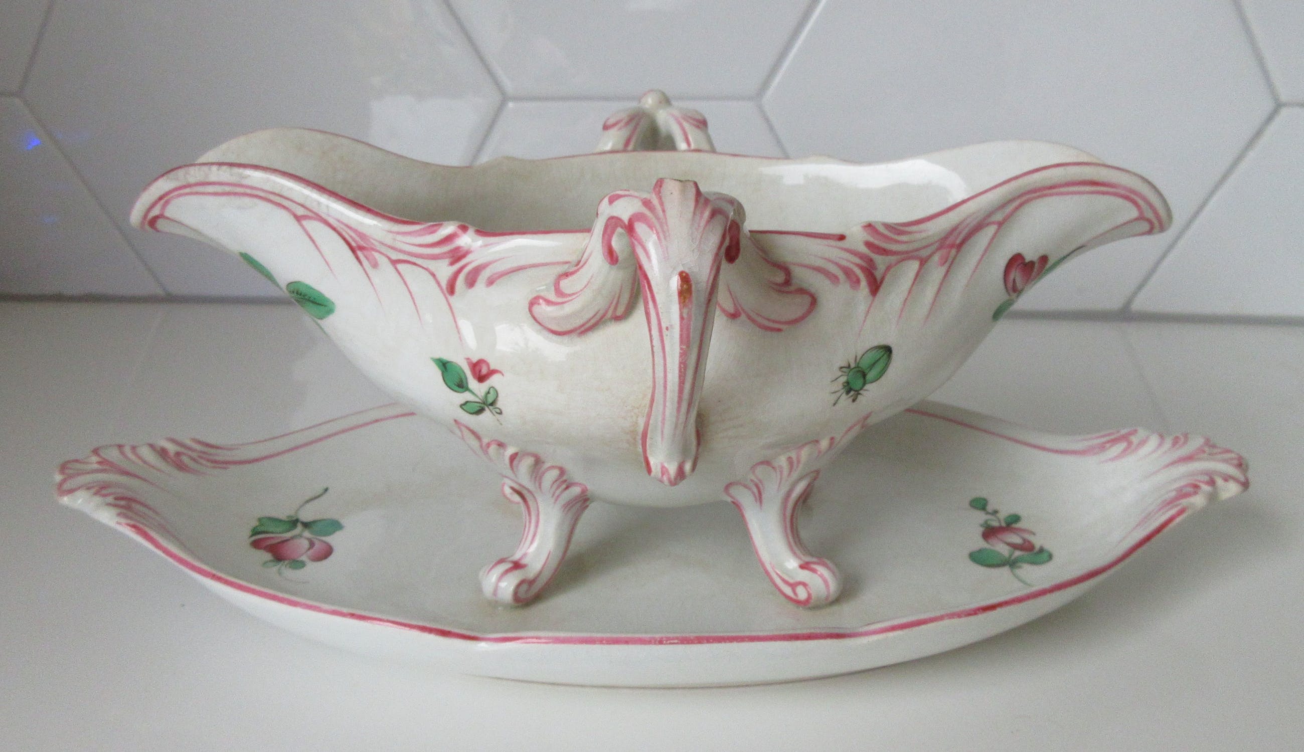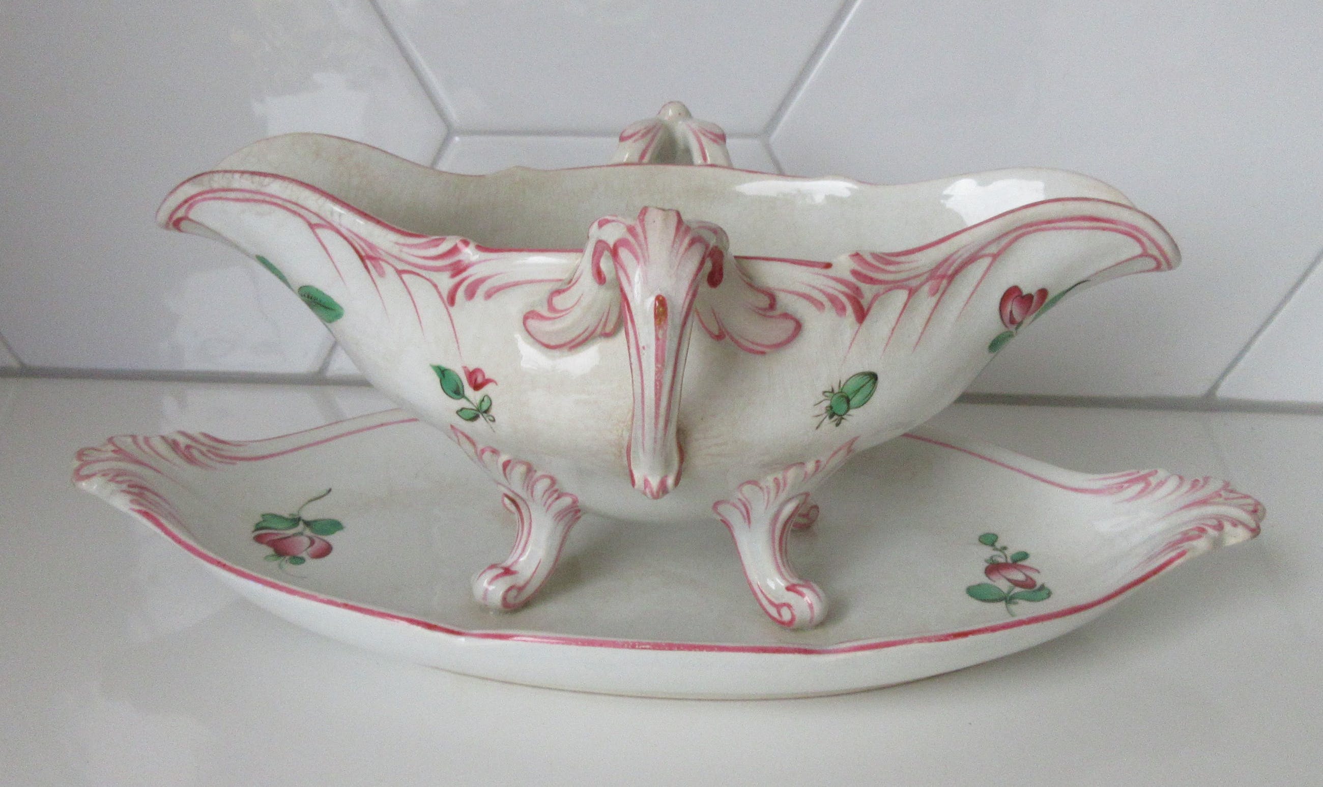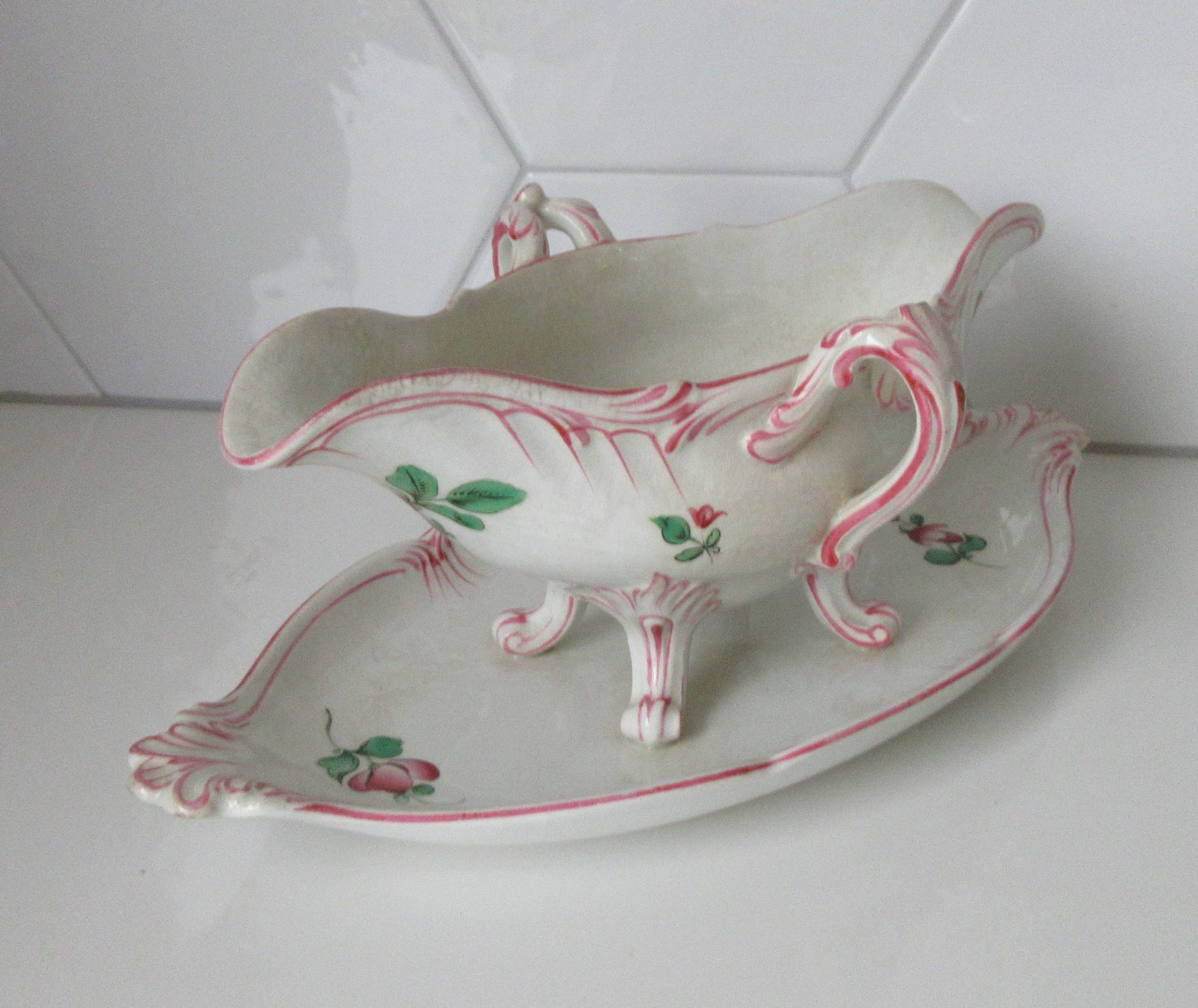 Antieke 19e eeuwse Sauciere decor rozen en tulpen van KG Luneville uit Frankrijk. Heeft een chipje op de zijkant en het glazuur is wat gecraqueleerd.