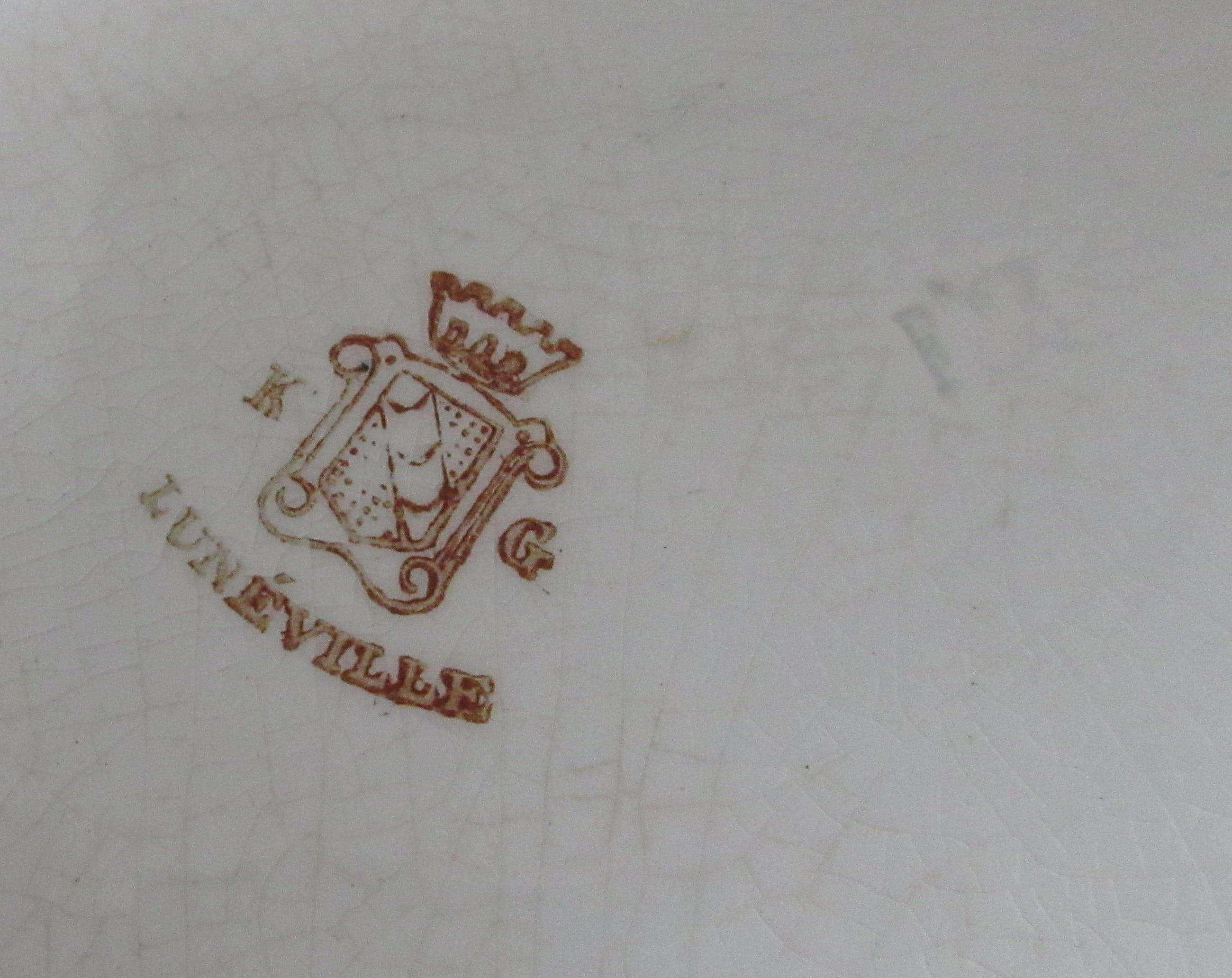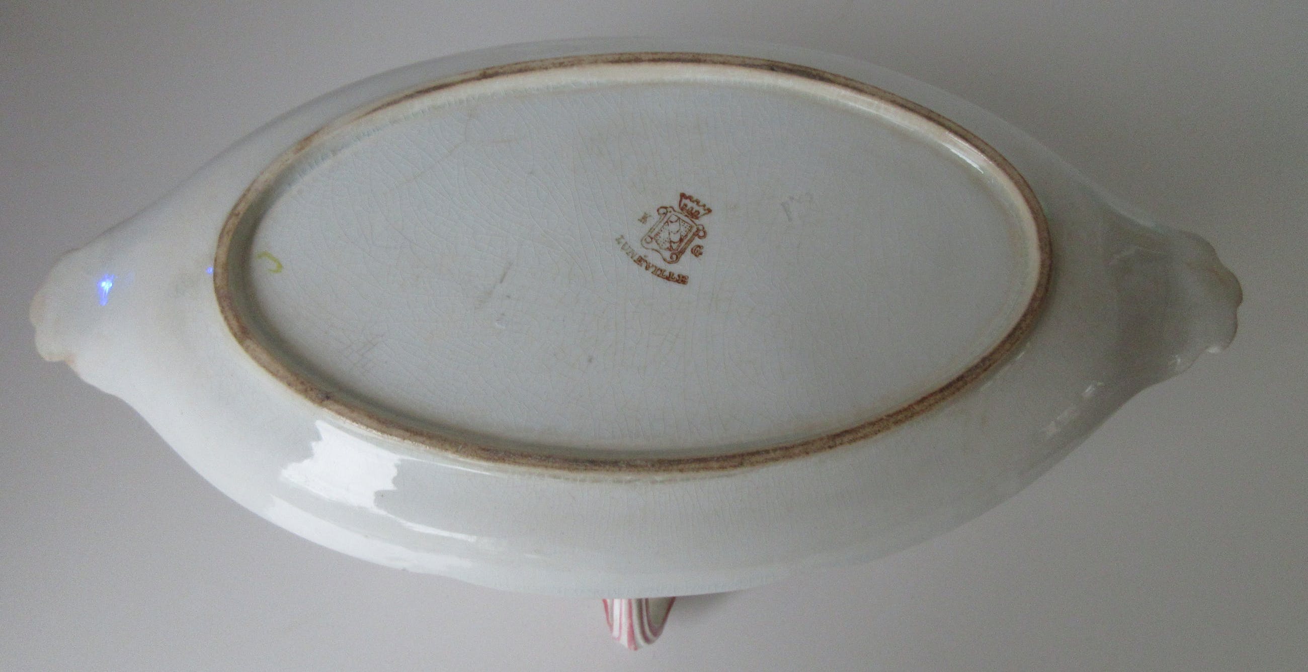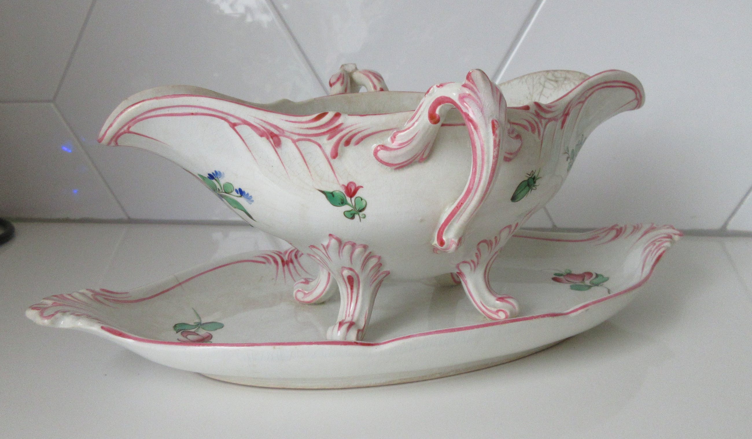 Antieke 19e eeuwse Sauciere decor rozen en tulpen van KG Luneville uit Frankrijk. Heeft een chipje op de zijkant en het glazuur is wat gecraqueleerd.