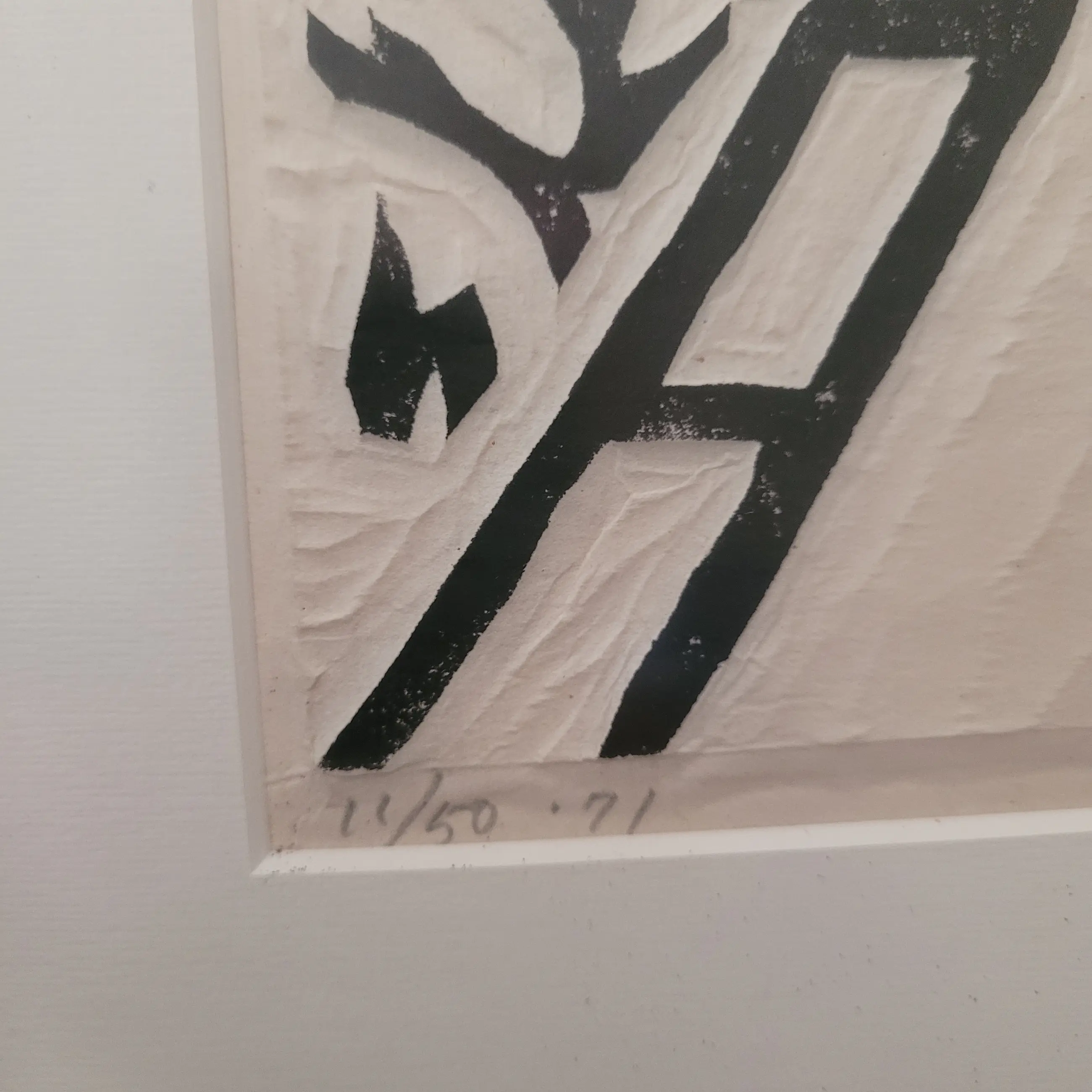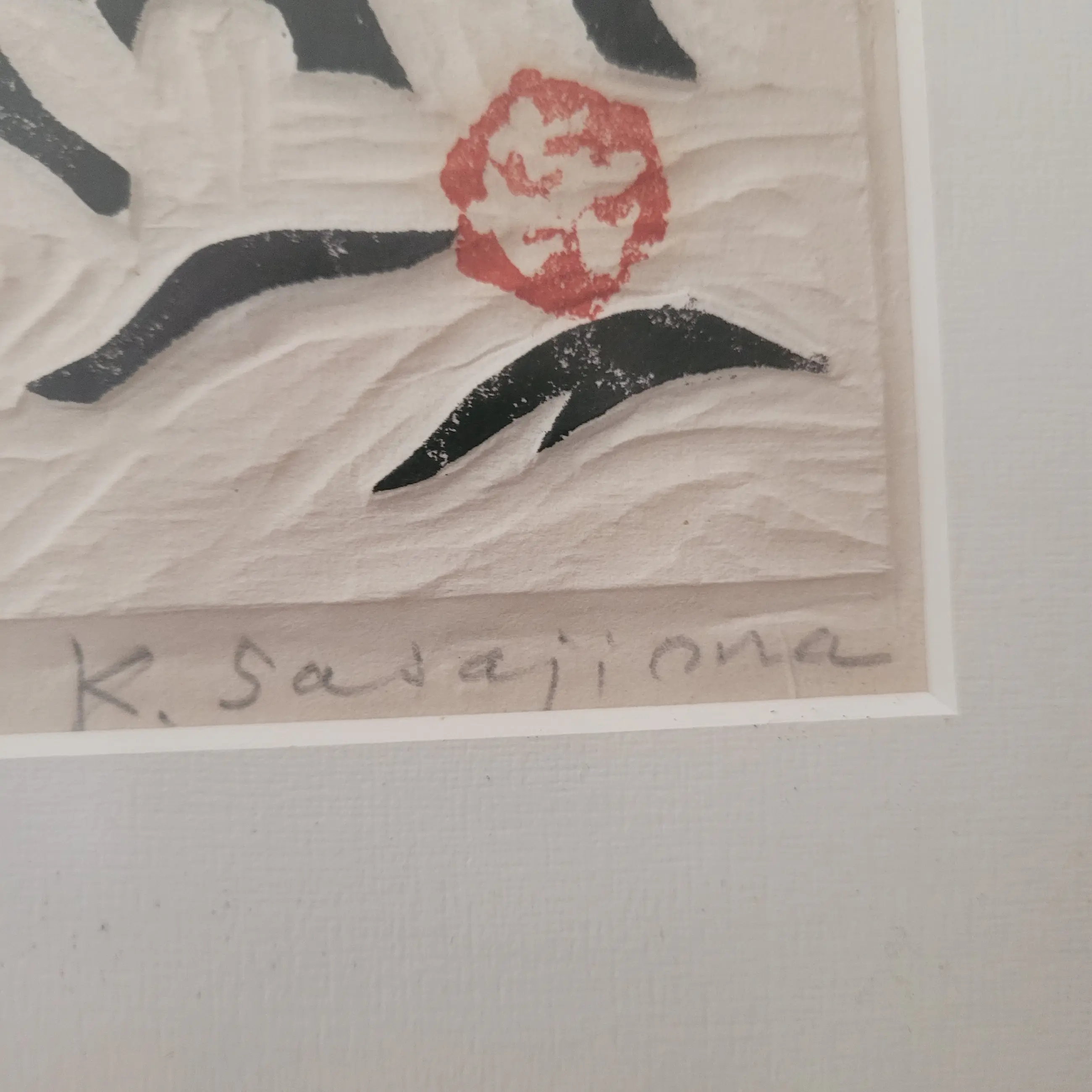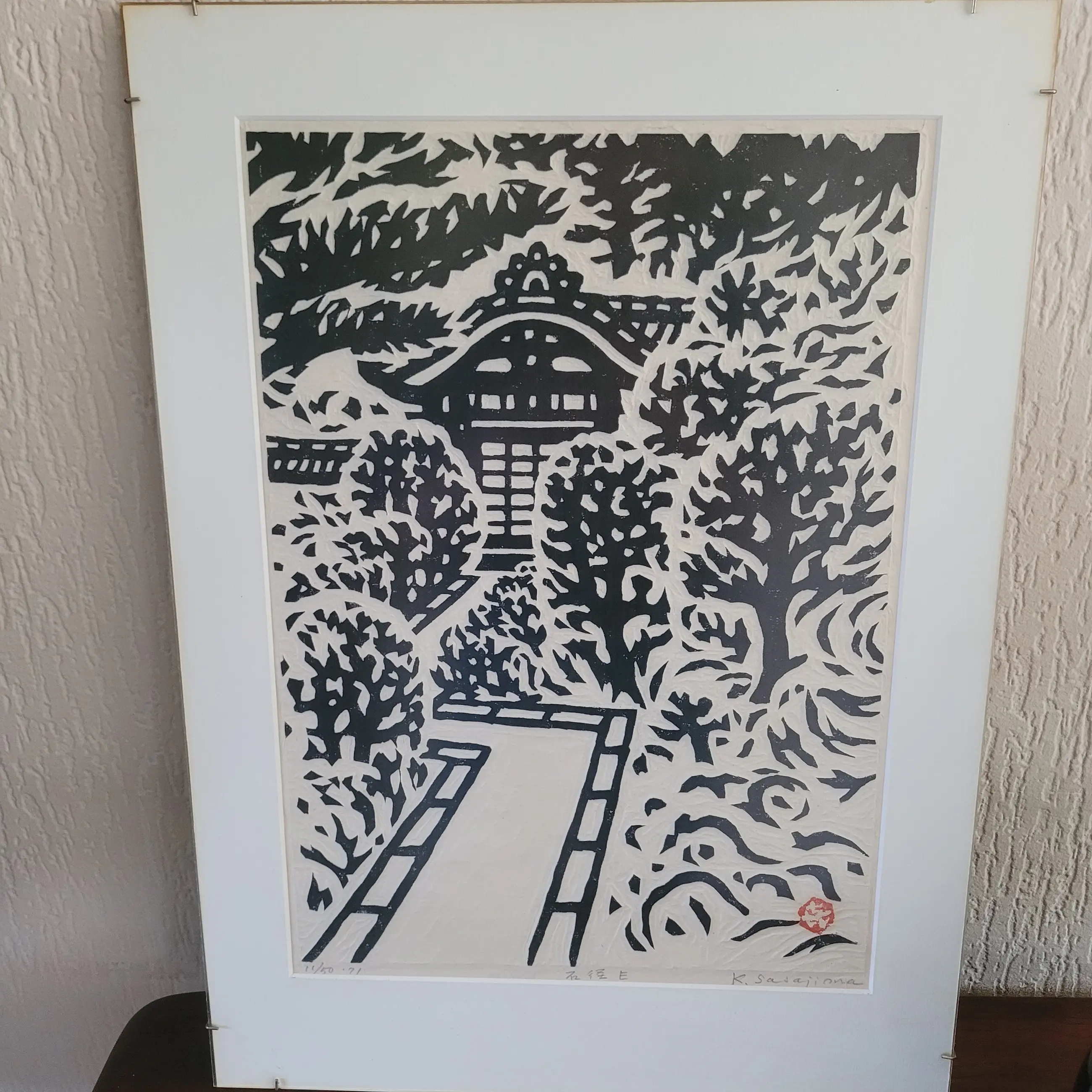 Dit is een originele houtsnede van de beroemde Japanse kunstenaar Kihei Sasajima (1906-1993), bekend om zijn krachtige zwart/witcomposities en zijn unieke "takuzuri" (reliëf-druk) techniek.