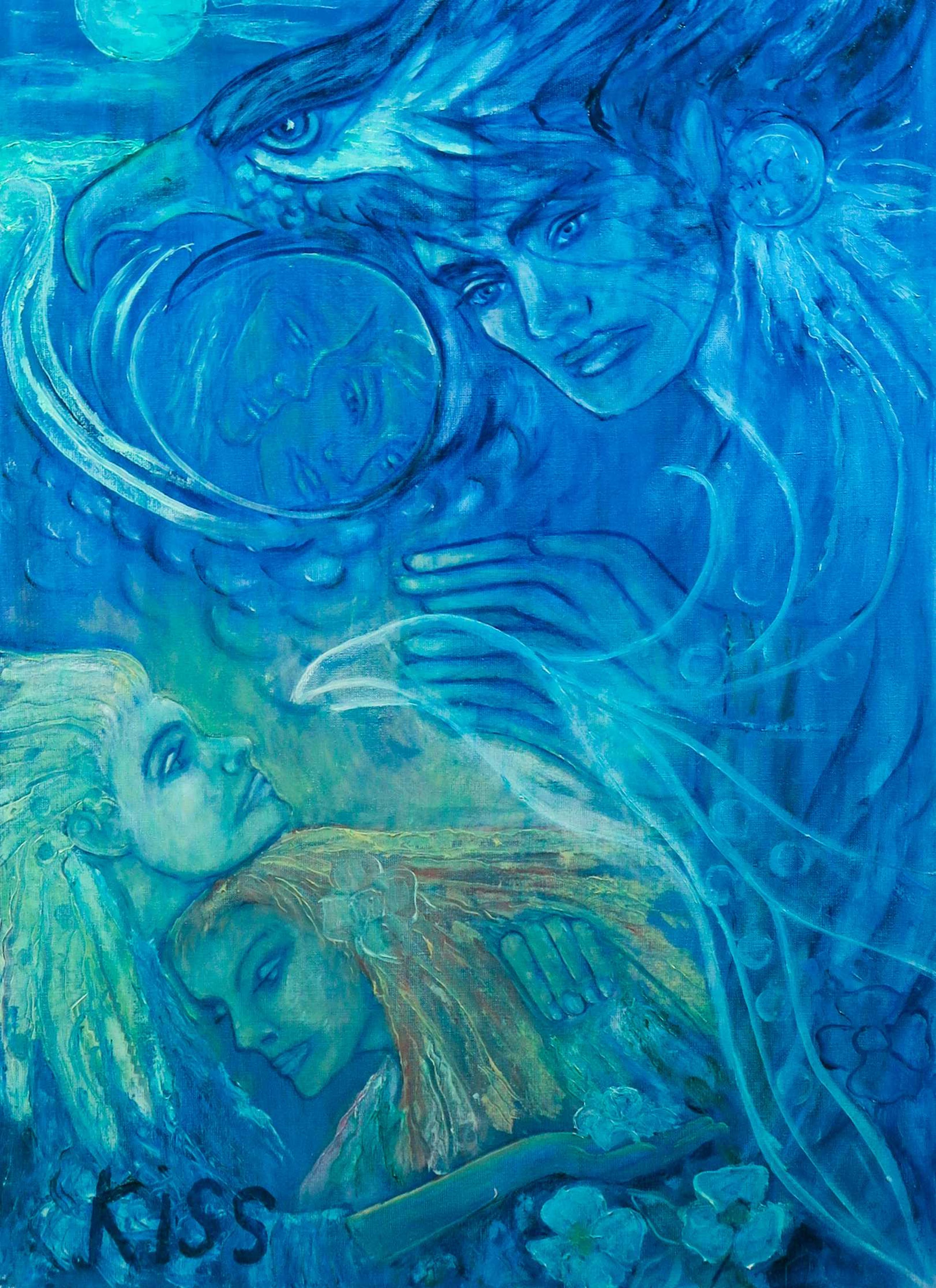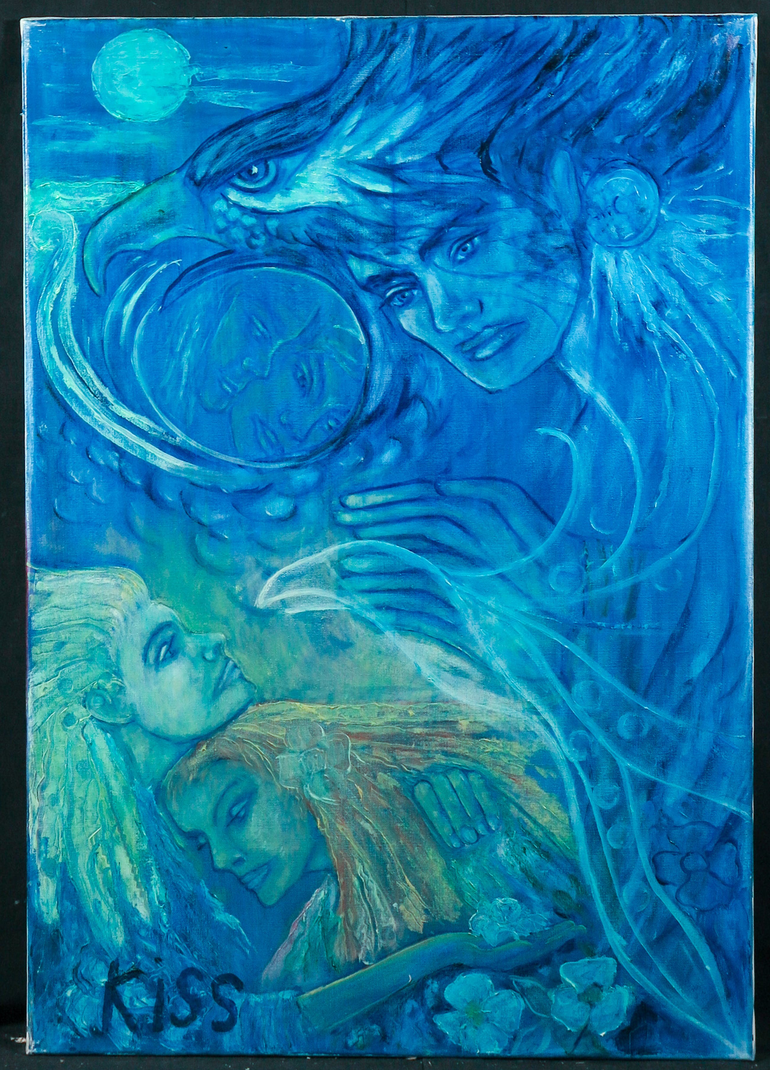 Kiss Riemvis - Olieverf op doek, z.t. Fantasy figuren en adelaar kopen? Bied vanaf 10!