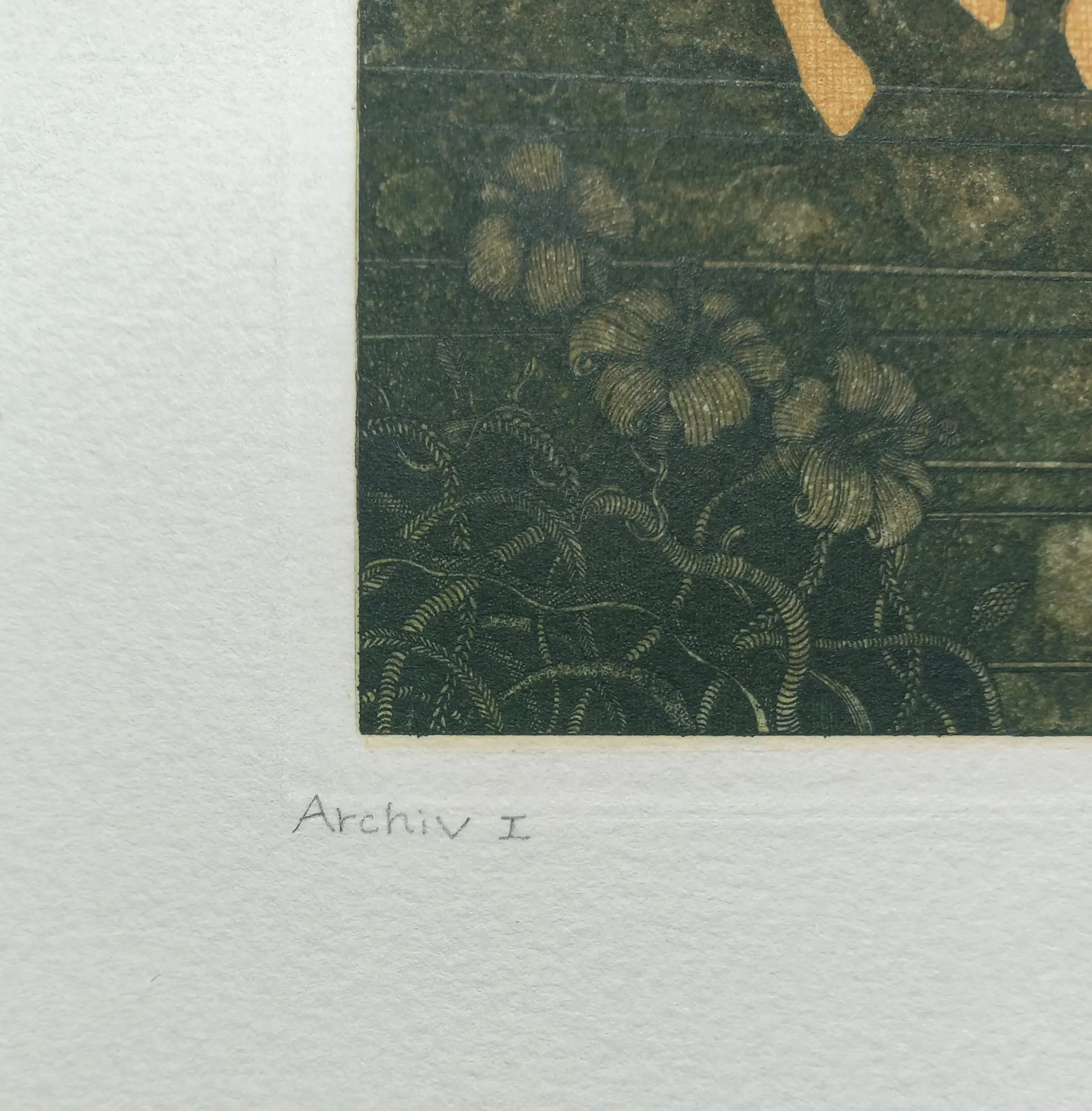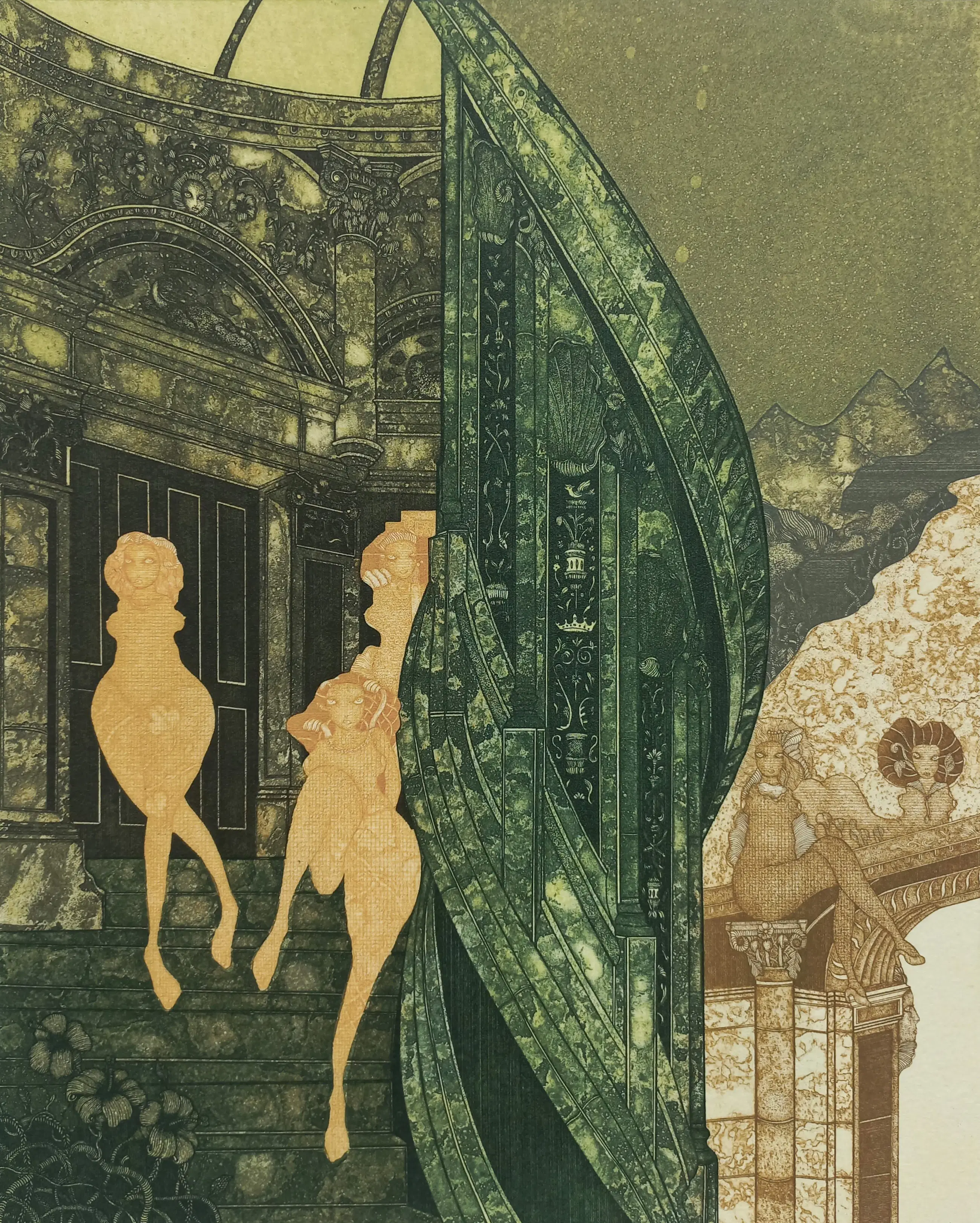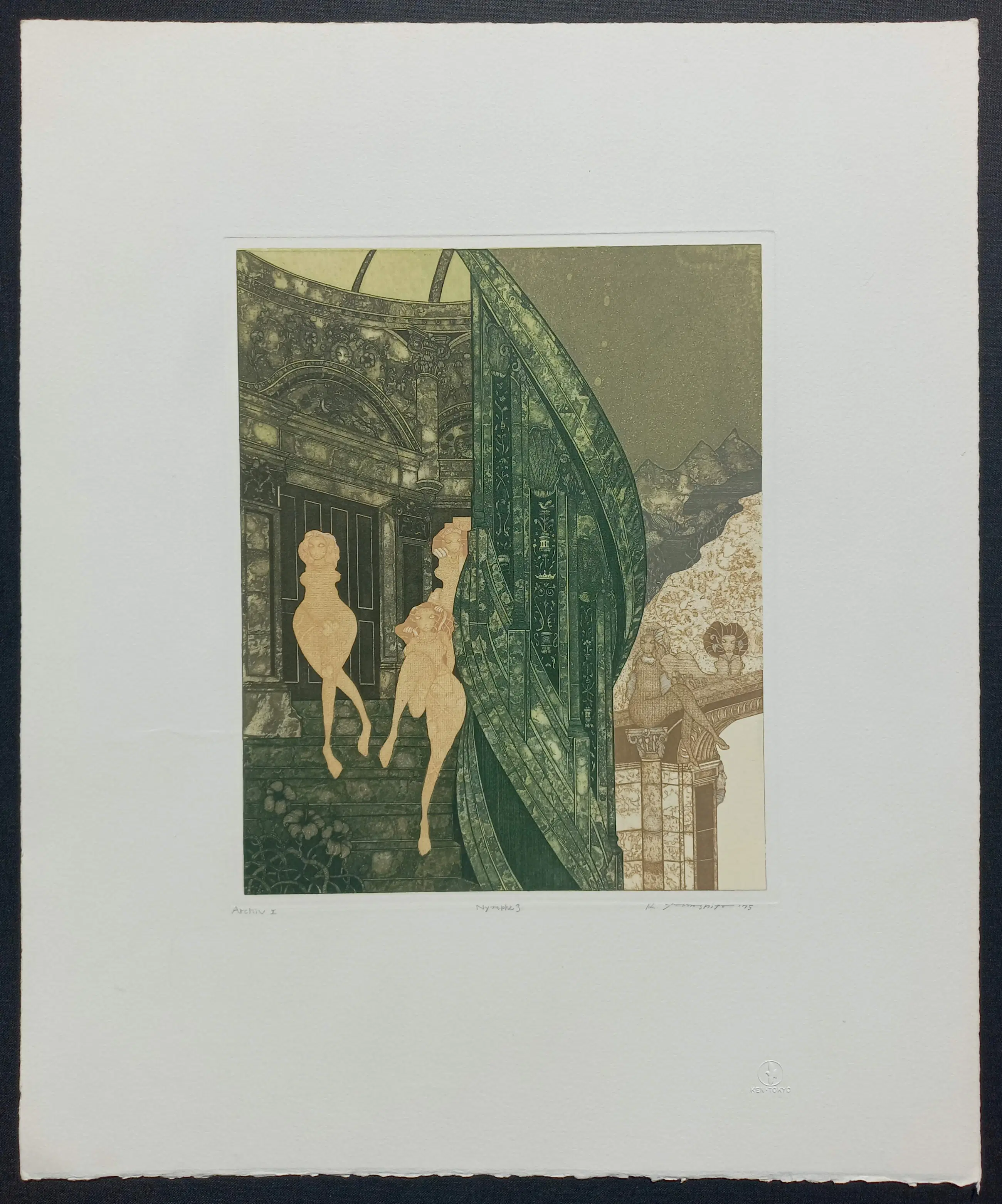 Zeer mooie, karakteristieke compositie van Kiyozumi Yamashita. Aquatint ets op geschept papier, met potlood gesigneerd, gedateerd (‘75) en getiteld, met vermelding “Archiv I” en met blindstempel “Ken-Tokyo”. In zeer goede conditie.