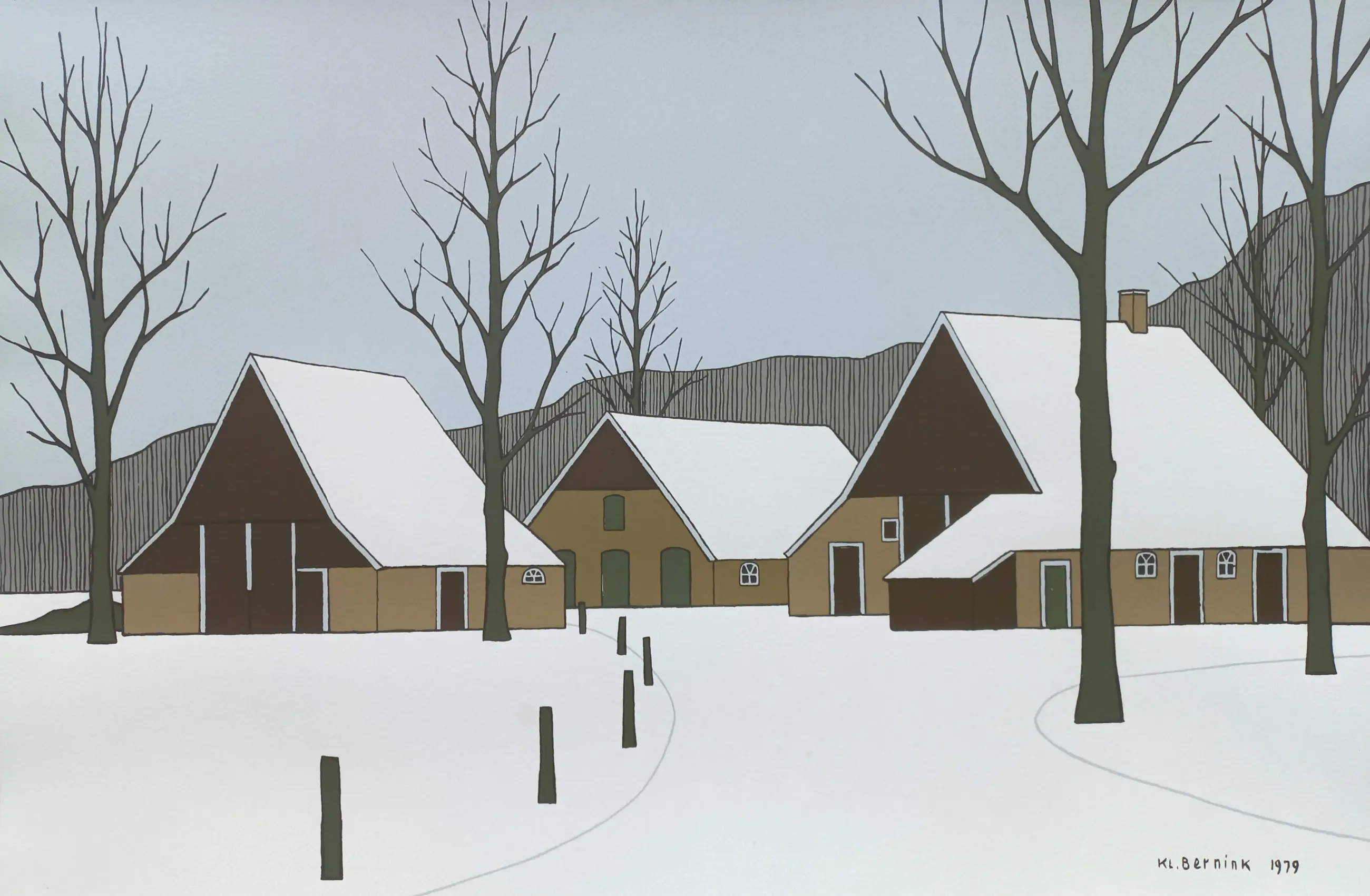 Mooi, karakteristiek Twents landschap van Klaas Bernink. Zeefdruk op papier, met potlood gesigneerd en genummerd (23-250) en in de druk gesigneerd en gedateerd (1979). In eenvoudige witte lijst, achter ontspiegeld glas. In goede conditie.
