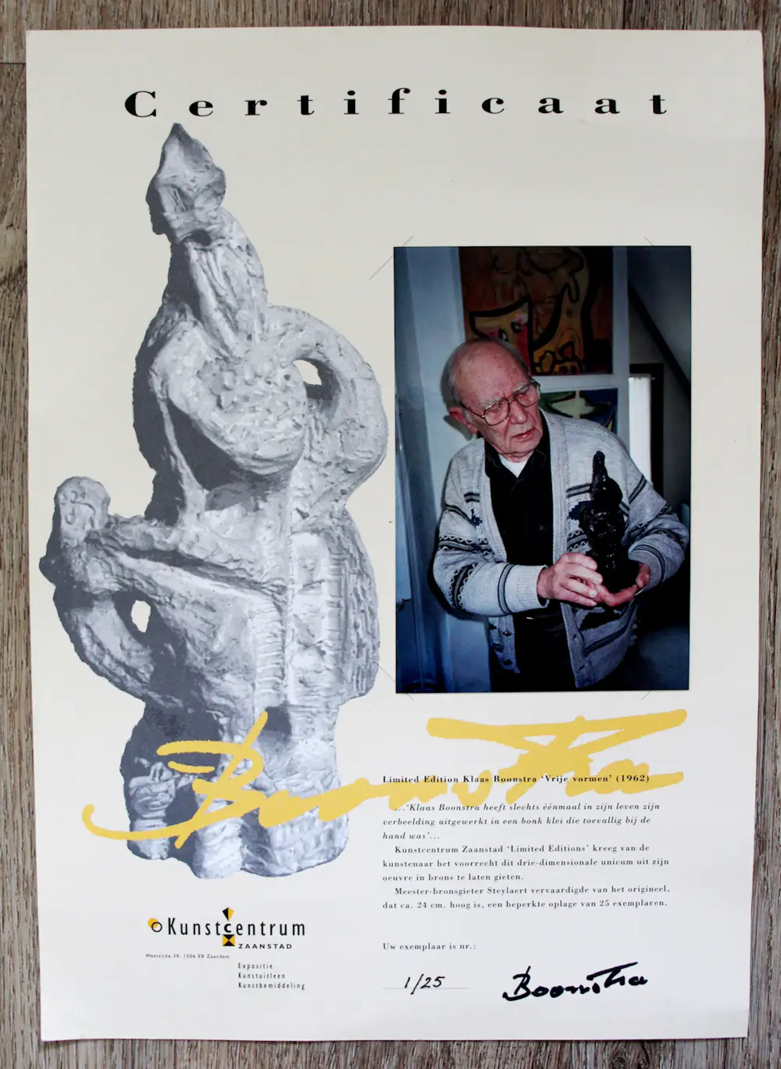 Bronzen sculptuur op hardstenen voet, van Klaas Boonstra. 'Vrije vormen' ('Vrije Vormen', is gegoten in opdracht van de kunstenaar in 1996 naar origineel uit 1963). Hoogte 27cm. Nummer: 1/25. De authenticiteit van het aangeboden werk wordt volledig gegarandeerd..