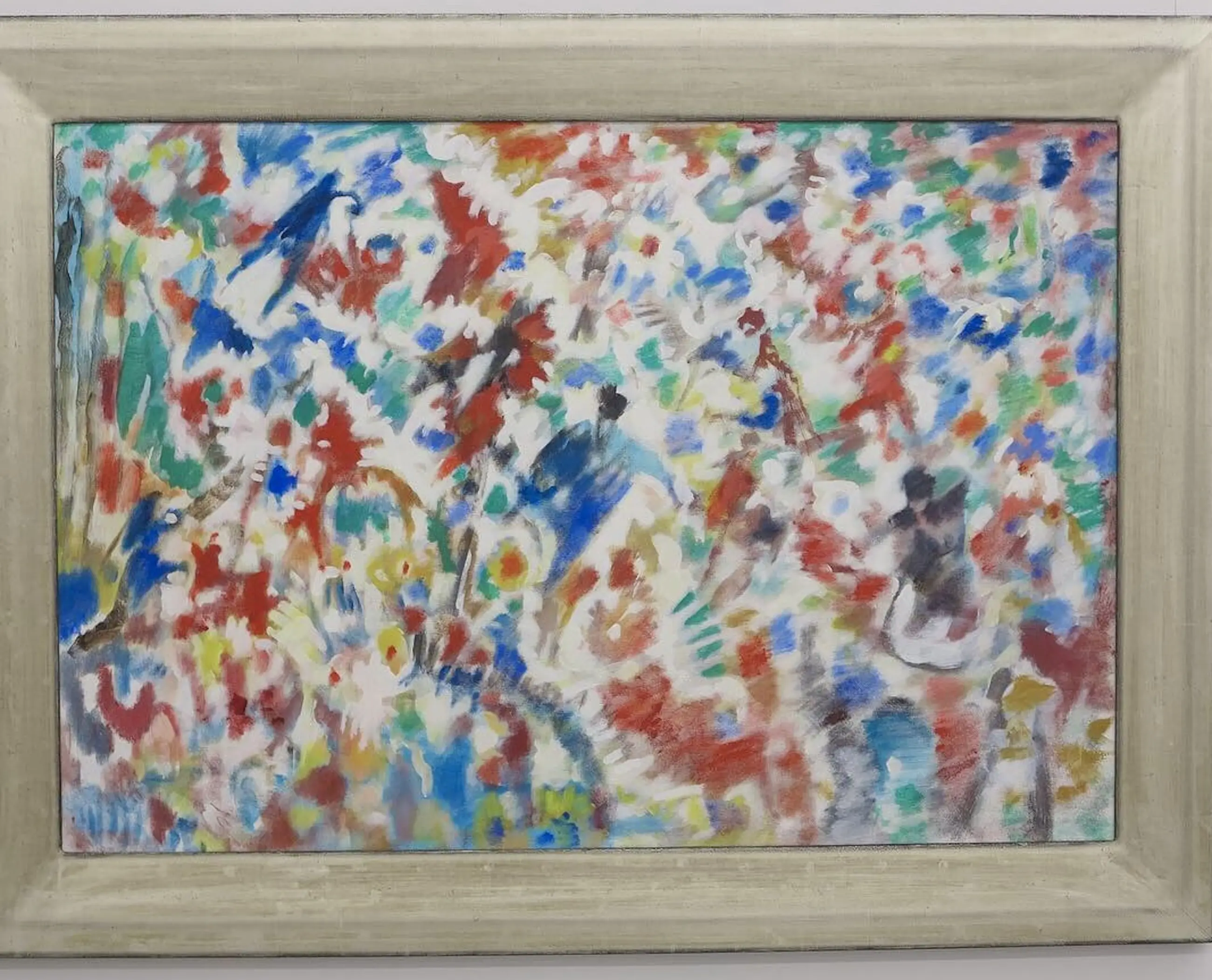 Groot kleurrijk werk in een fraaie lijst van Gehring & Heijdenrijk Amstelveen. Gesigneerd op de achterzijde.