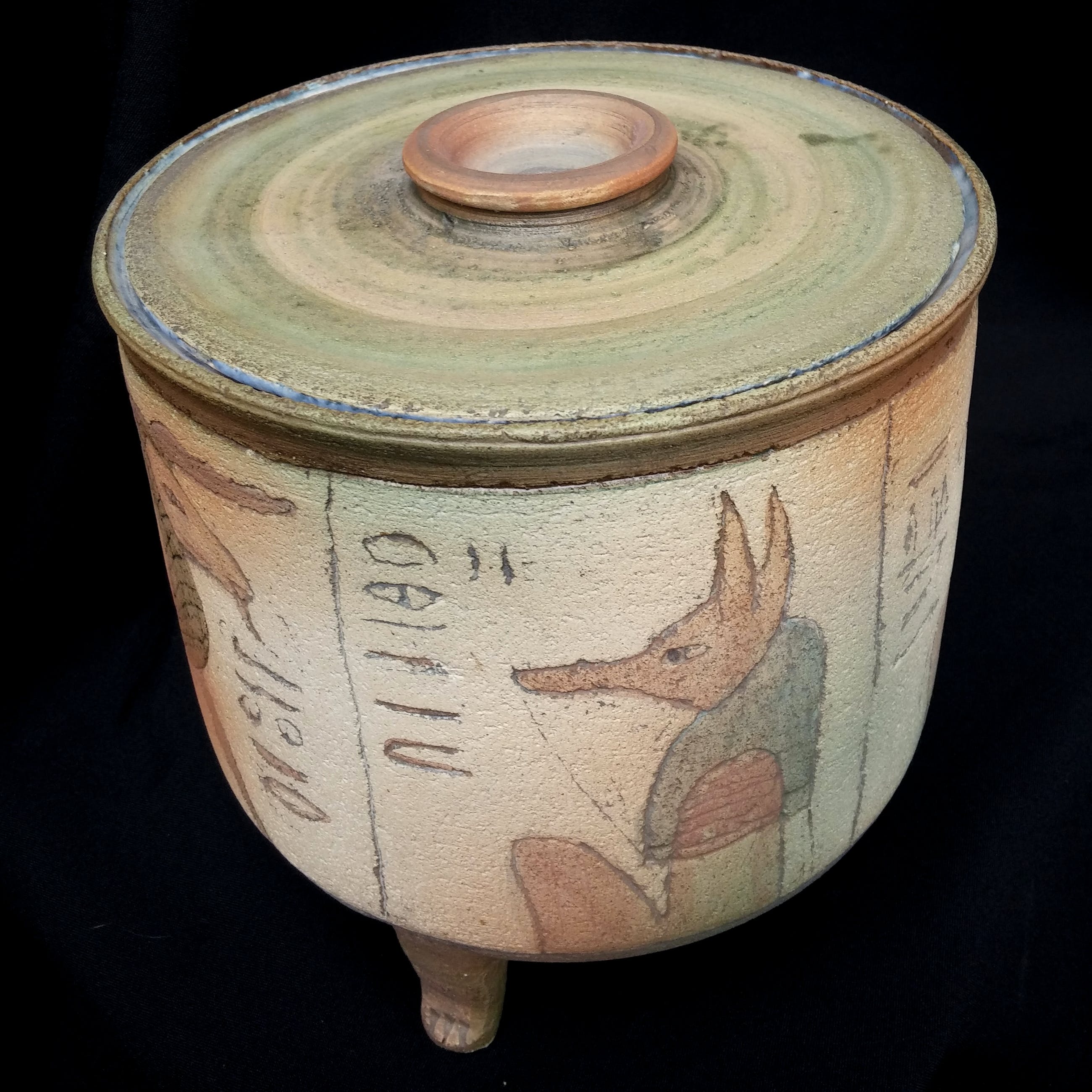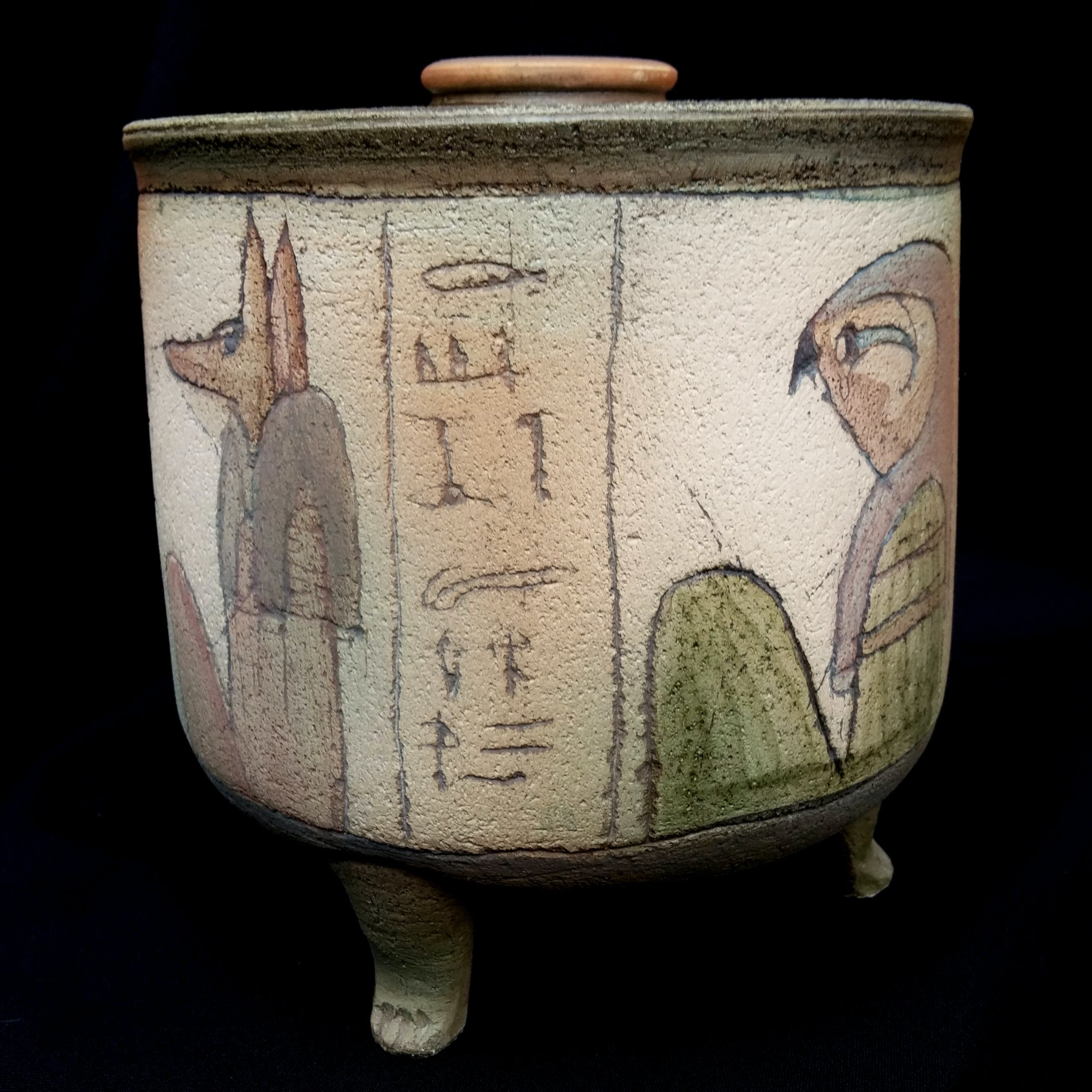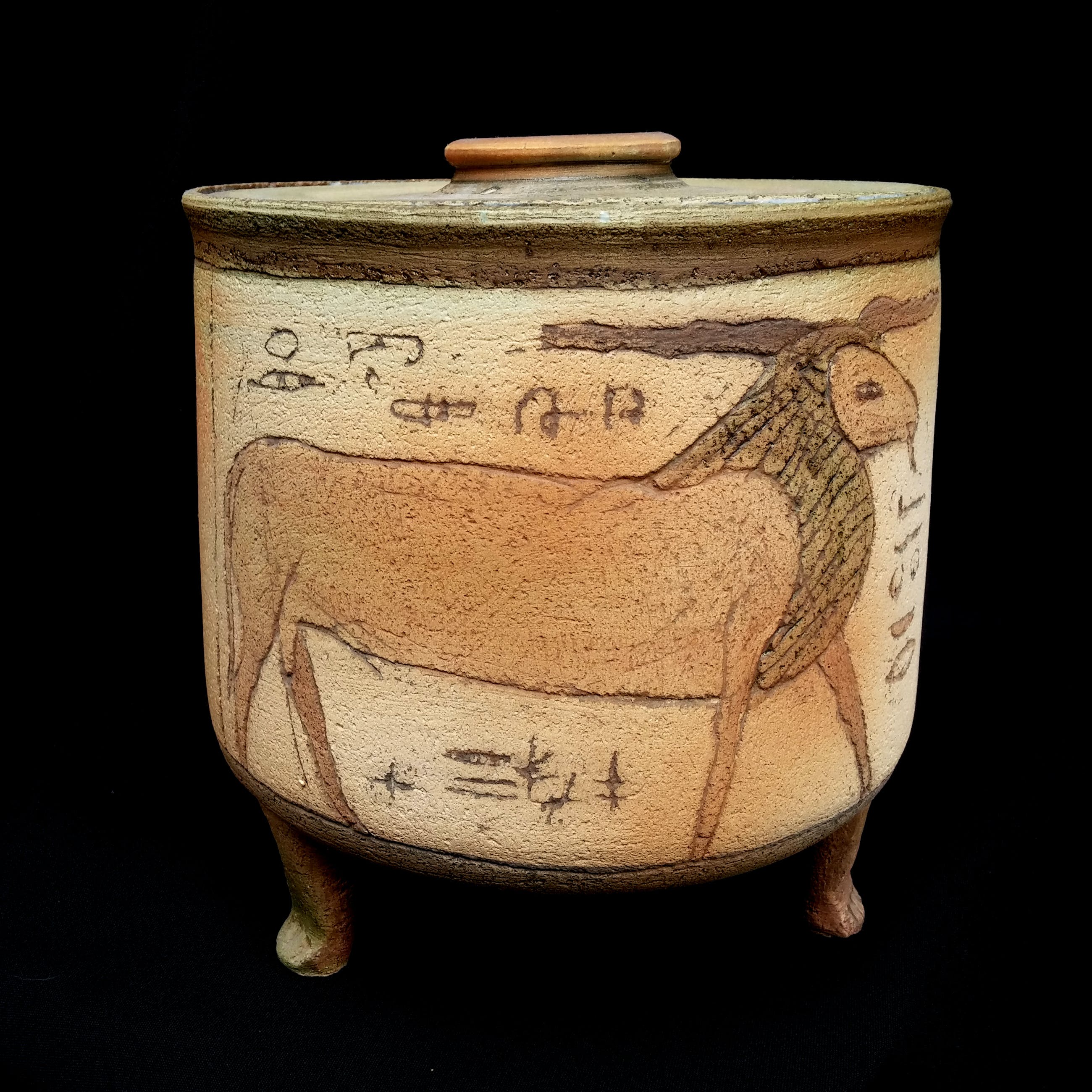 Gave pot met deksel van Klaas de Boer met verwijzingen naar Egypte en zijn goden.