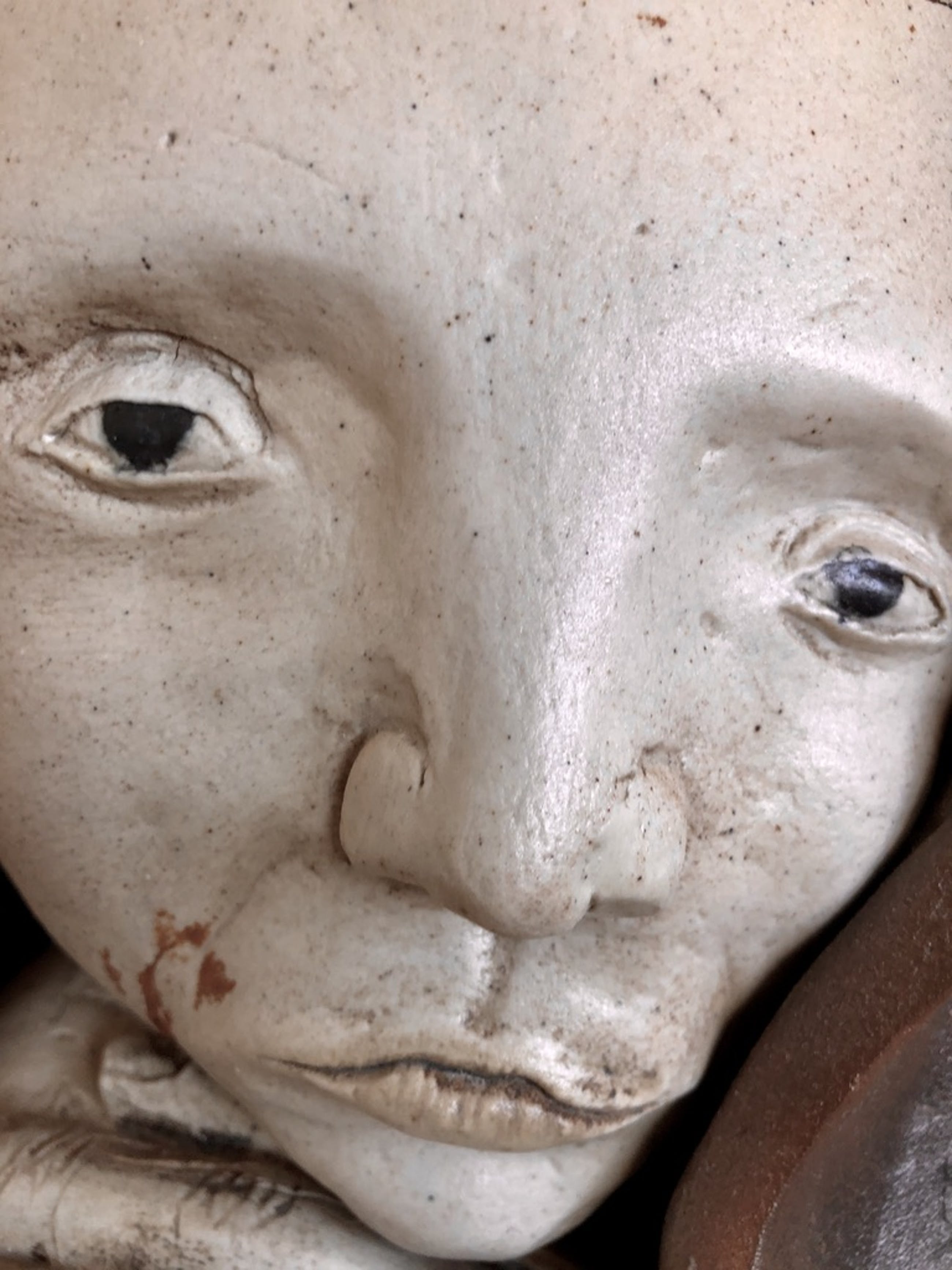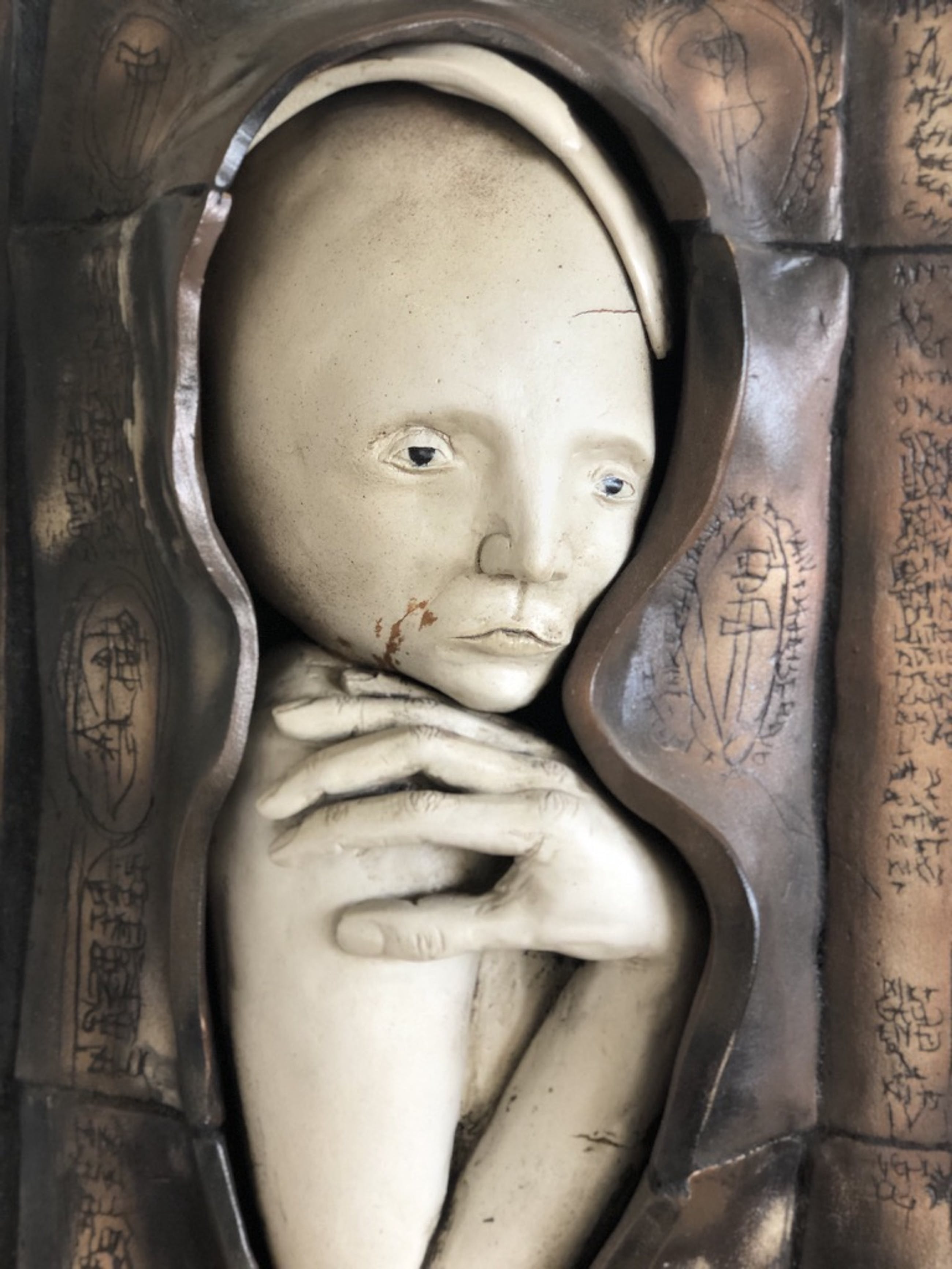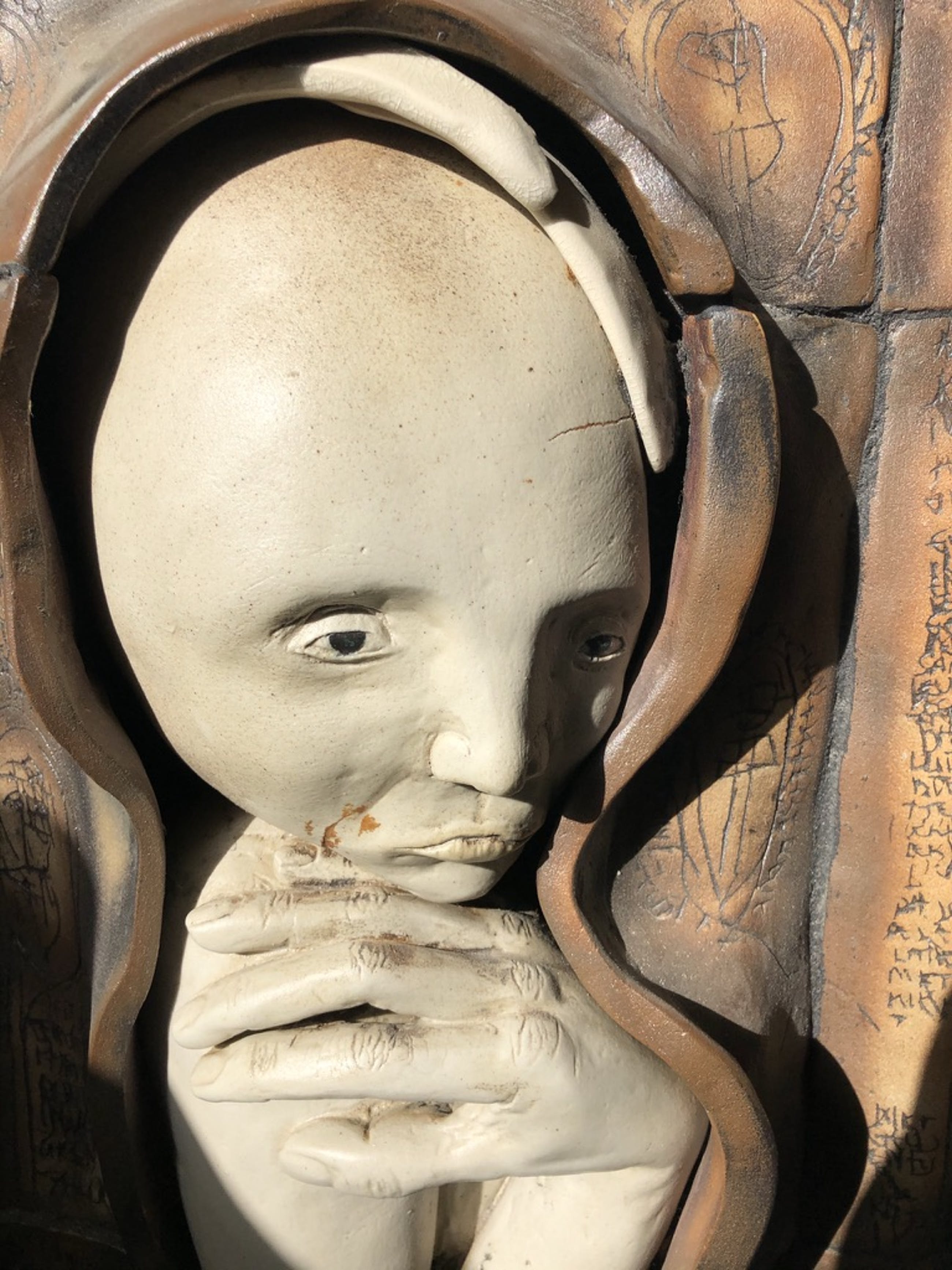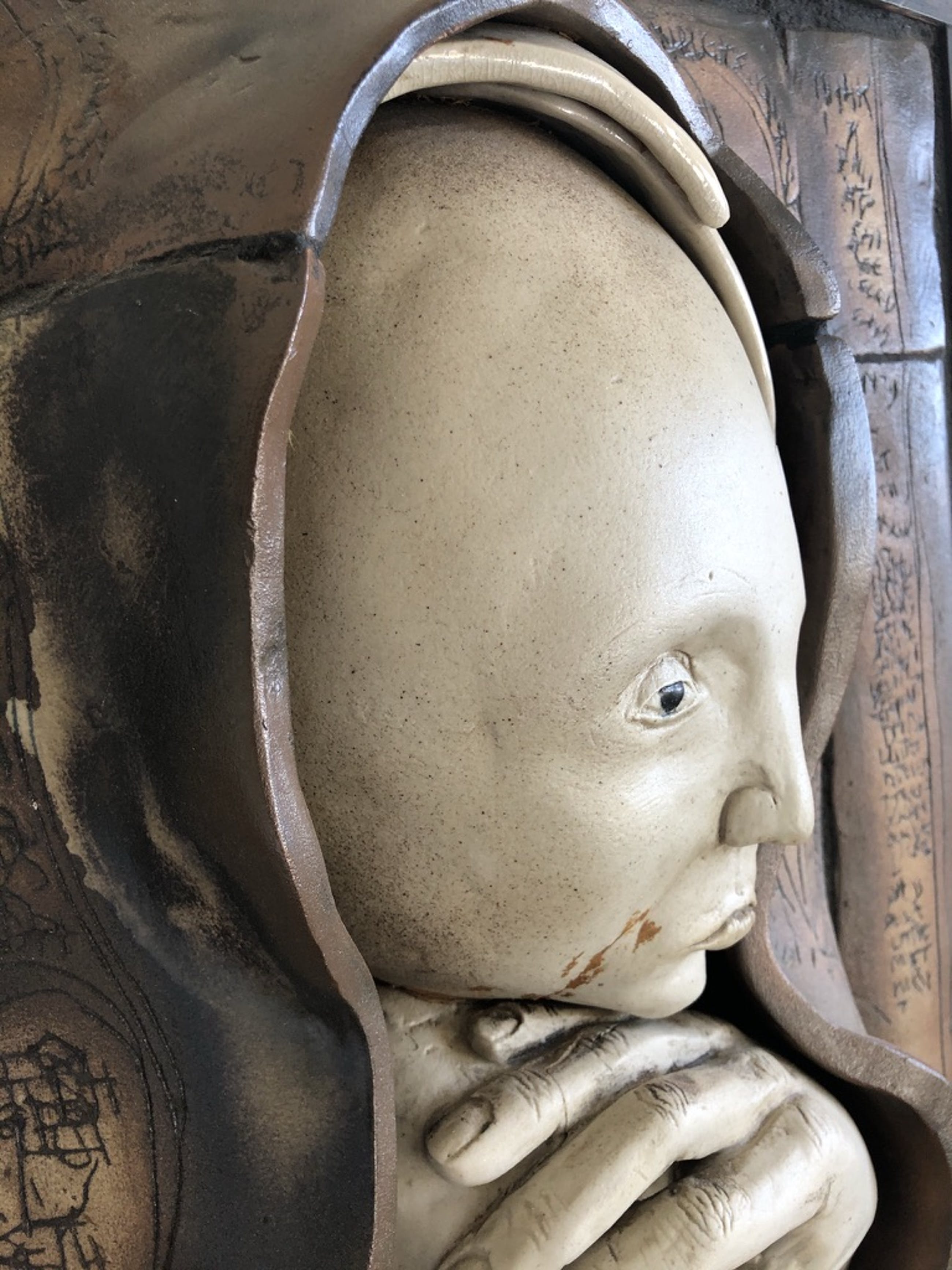 Dit beeld dat aan de wand kan hangen, is gemaakt door de Zaanse keramist Klaas de Boer (1944). Hij maakt potten, plastieken en wanddecoraties. De keramische objecten die Klaas de Boer maakt zijn ondergeschikt aan de functionaliteit, esthetiek; een perfecte techniek staat bij hem voorop. In zijn werk zijn verwijzingen te vinden naar oude culturen en de tijdloze natuur, zo ook in dit beeld.
